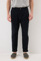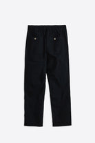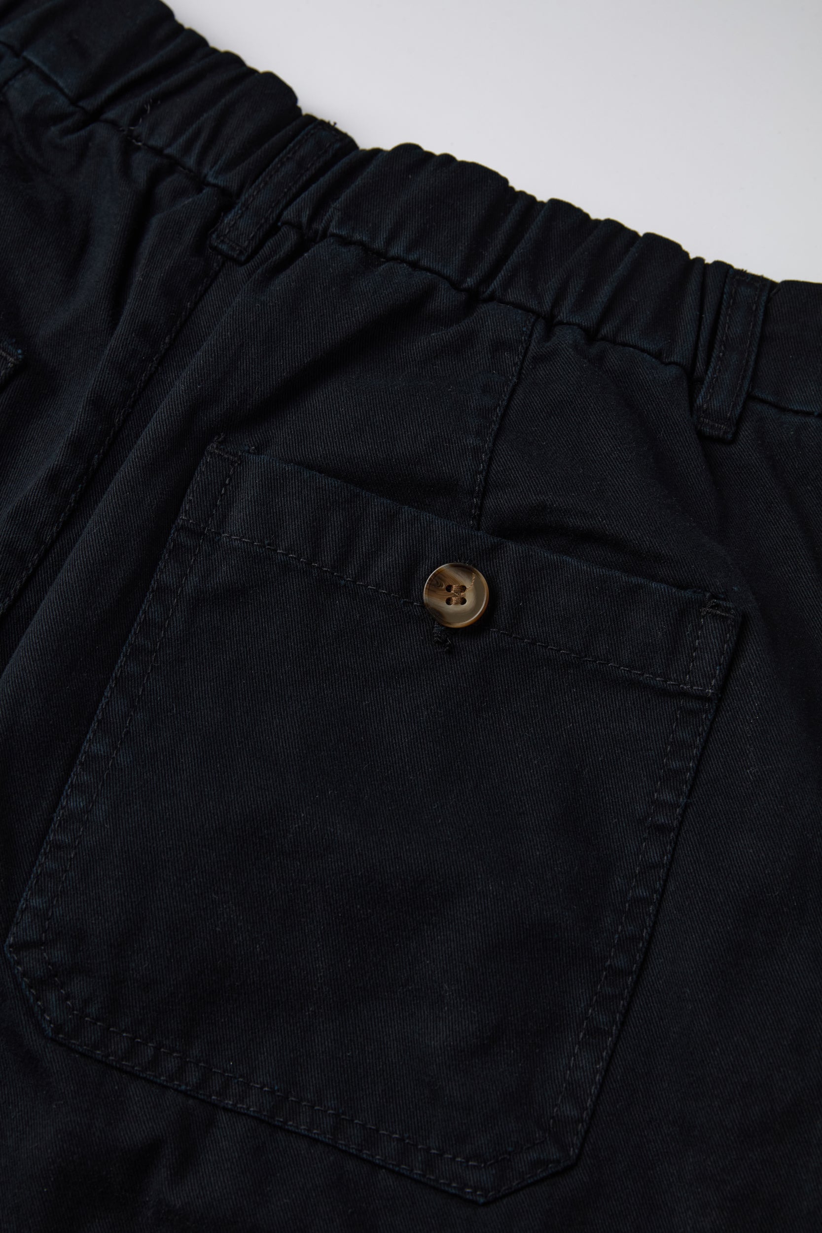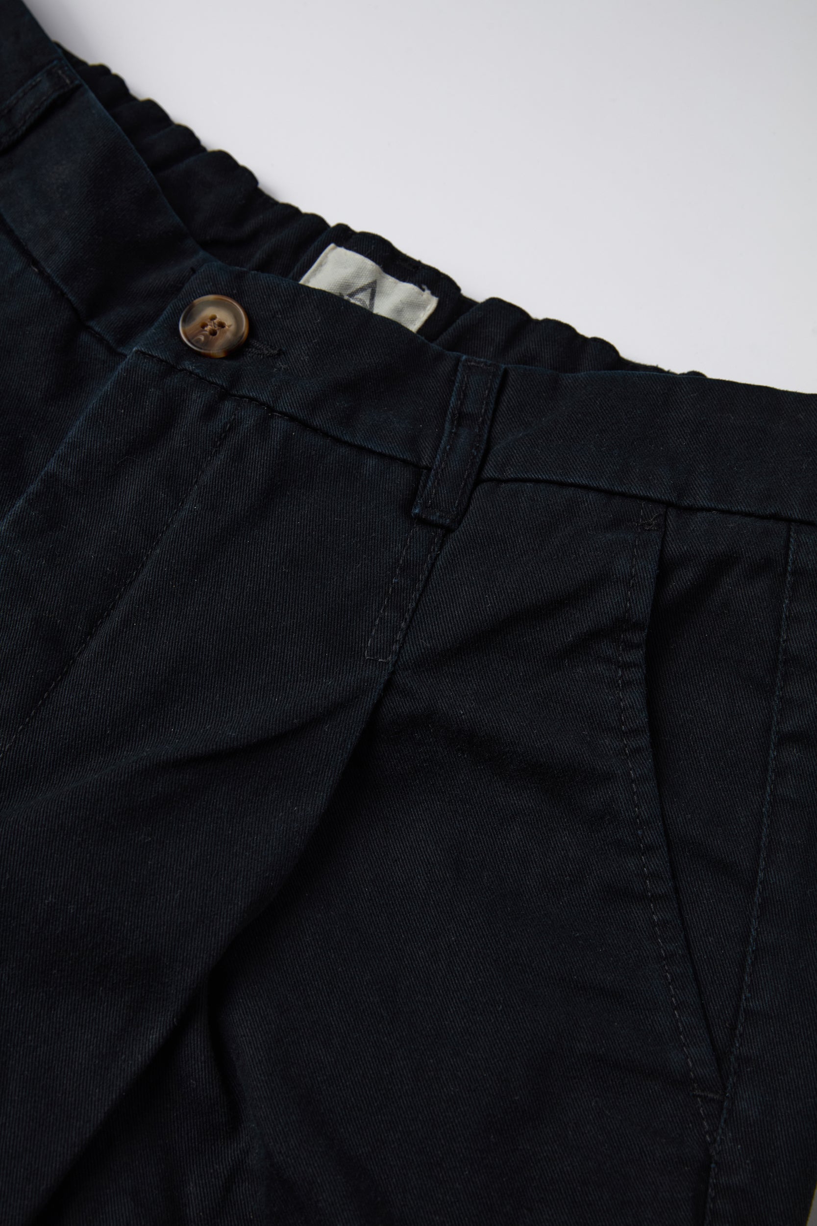 - המכנסיים משוחררים בחלקם העליון עם מכפלת צרה. ישנו כפל אחד בחזית וגומי בחלק האחורי באזור החגורה