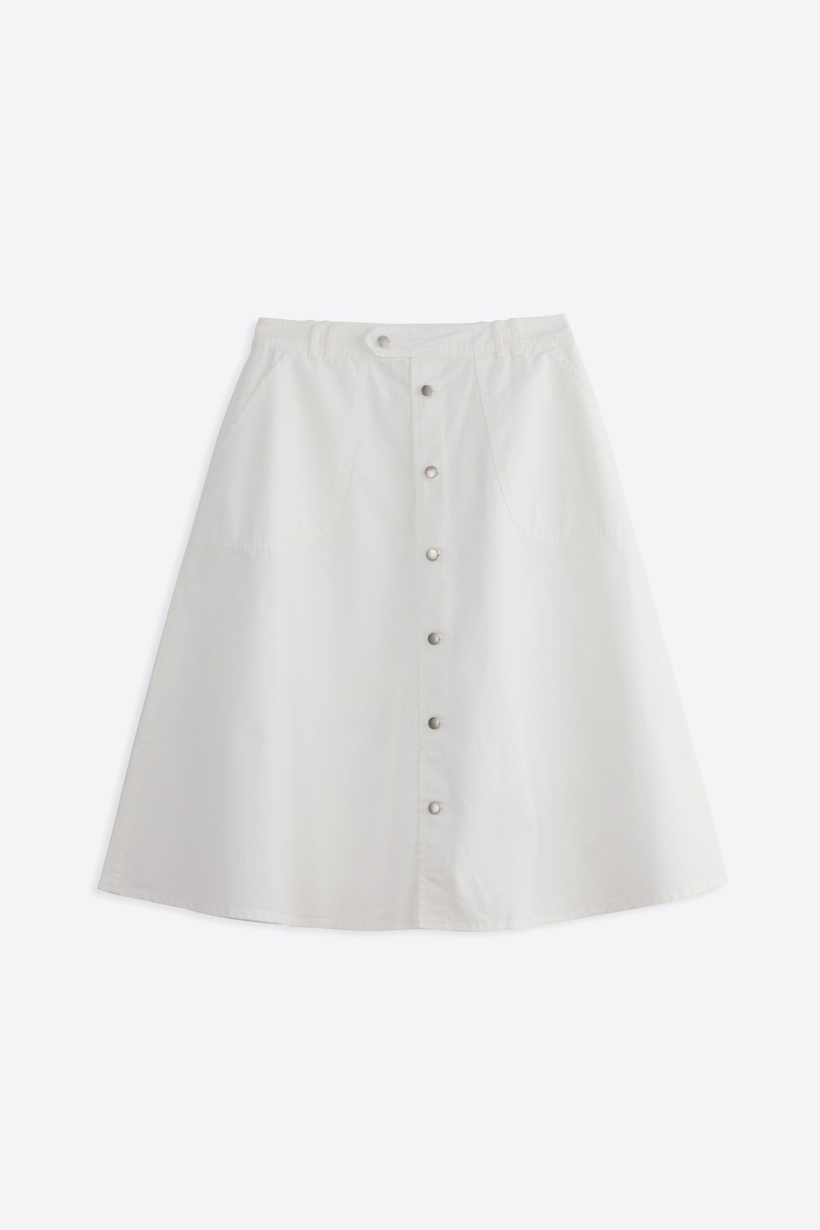 חצאית בגזרת פעמון מכופתרת בחלקה הקידמי עם שני כיסים חיצוניים מודגשים.
