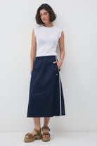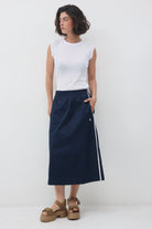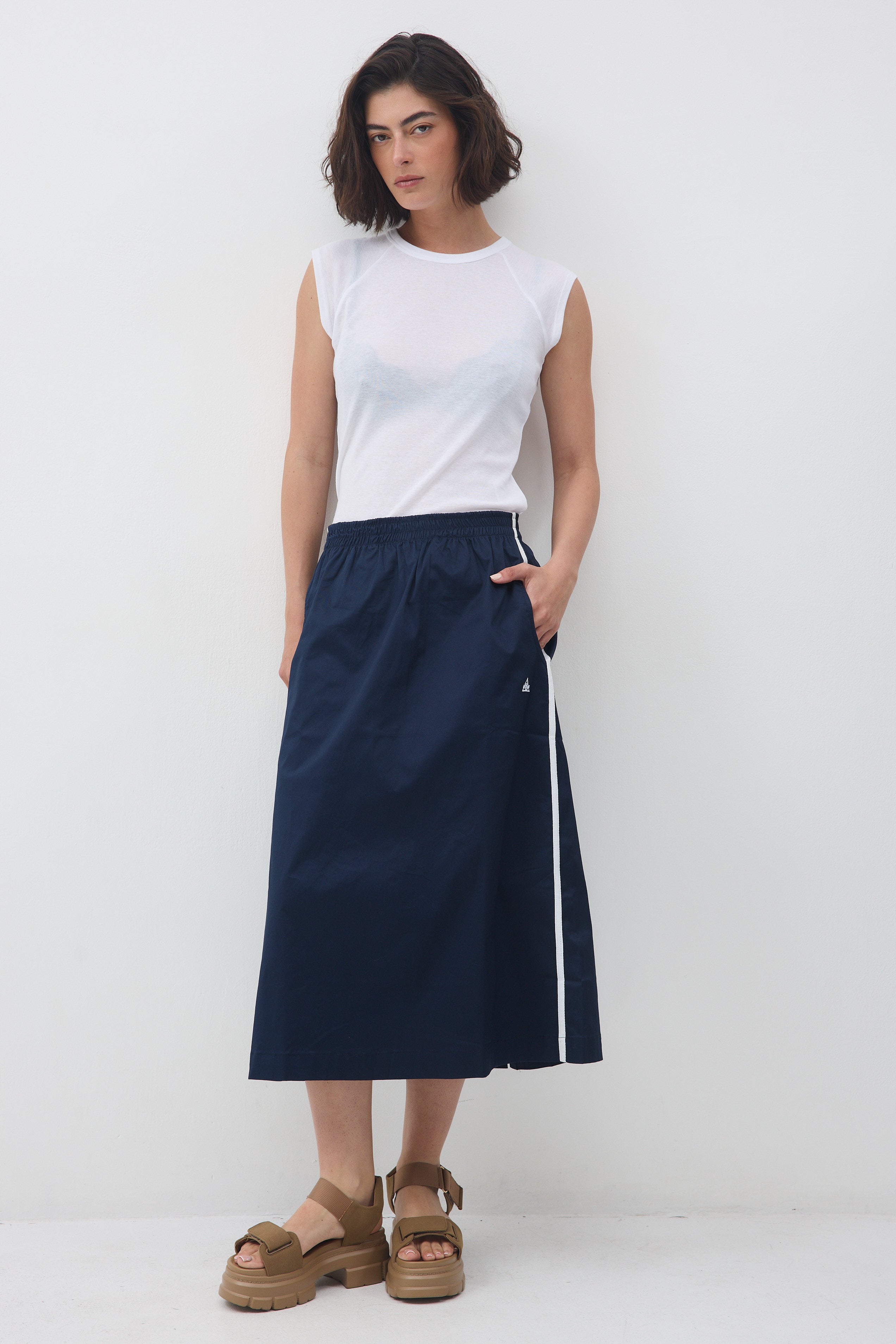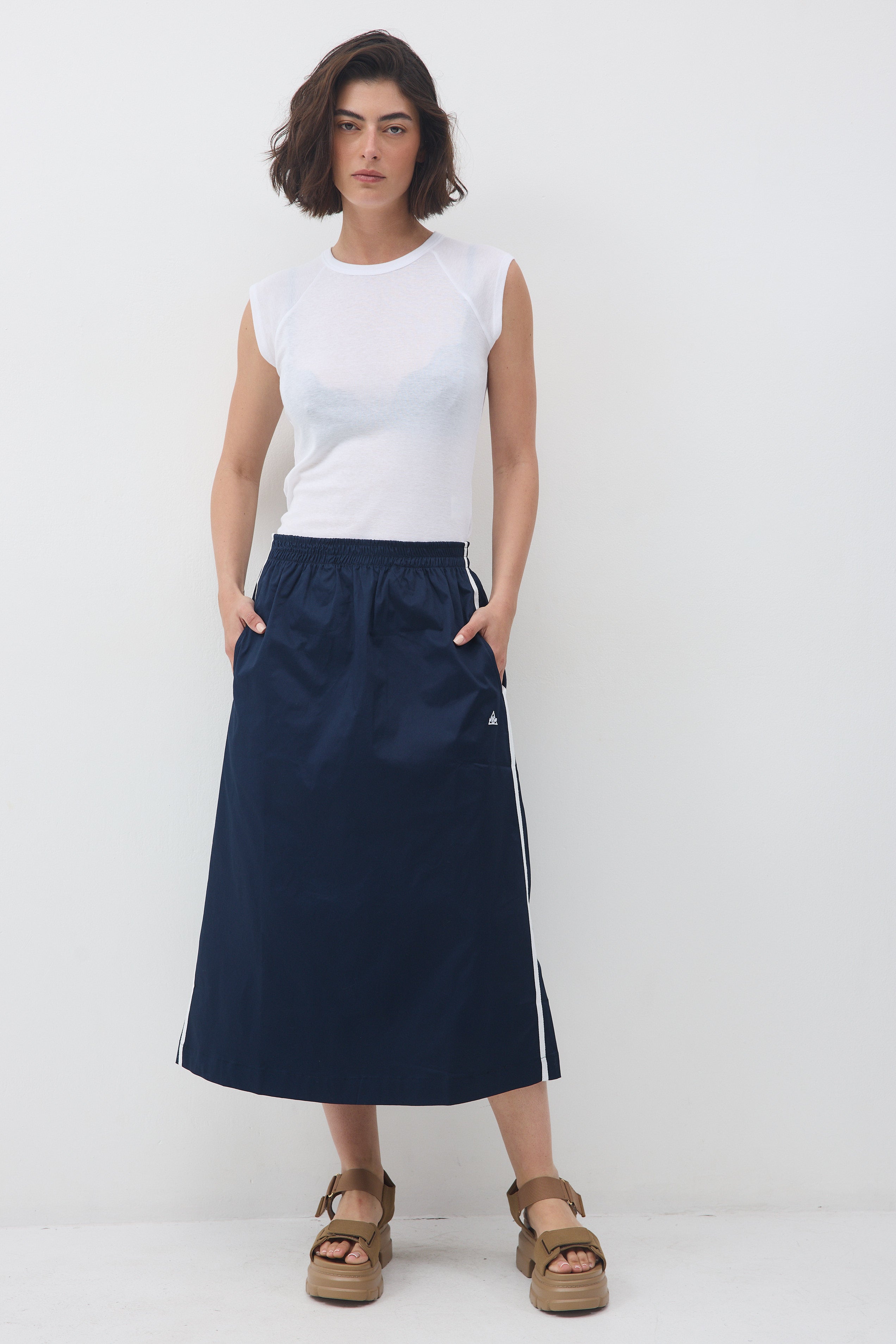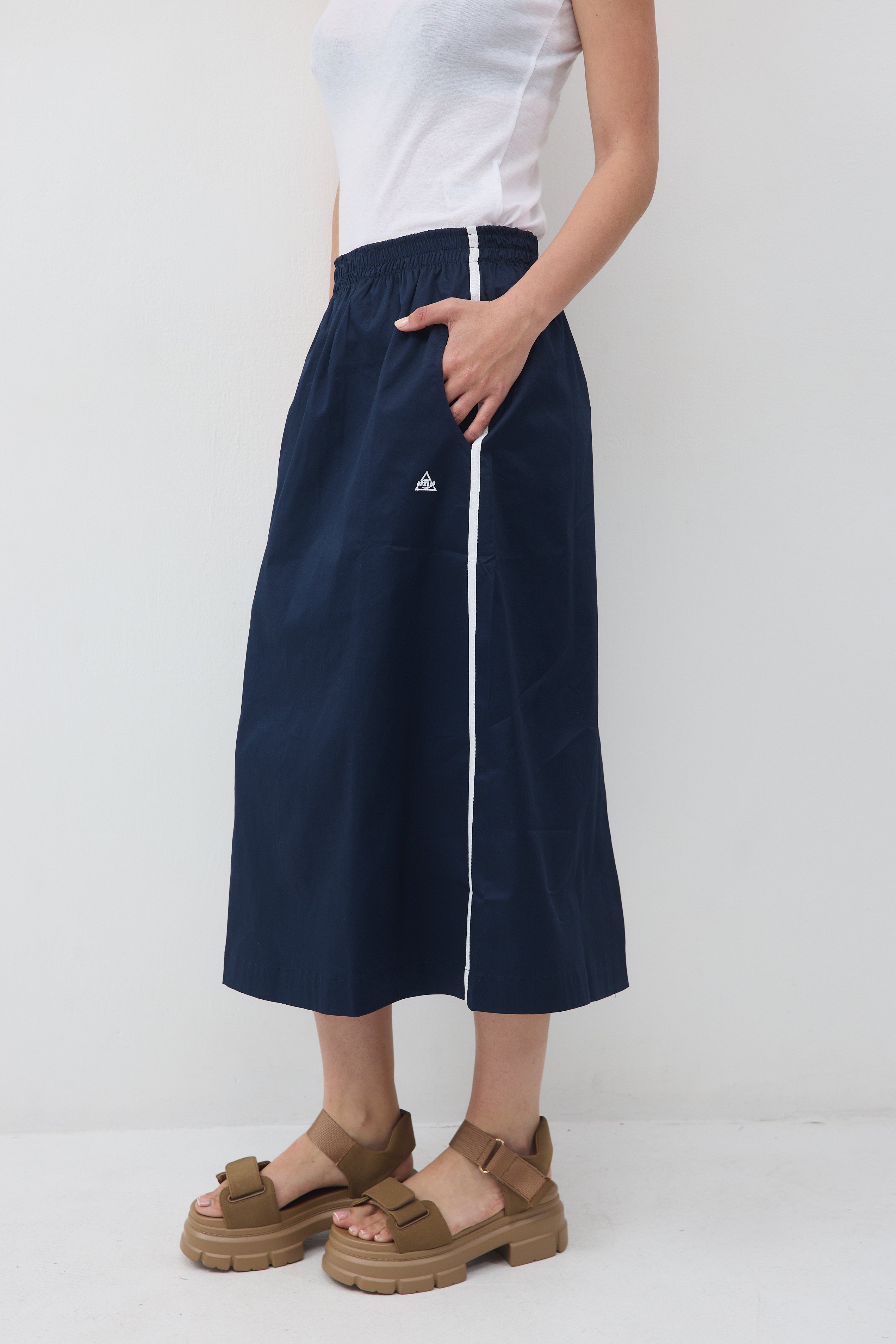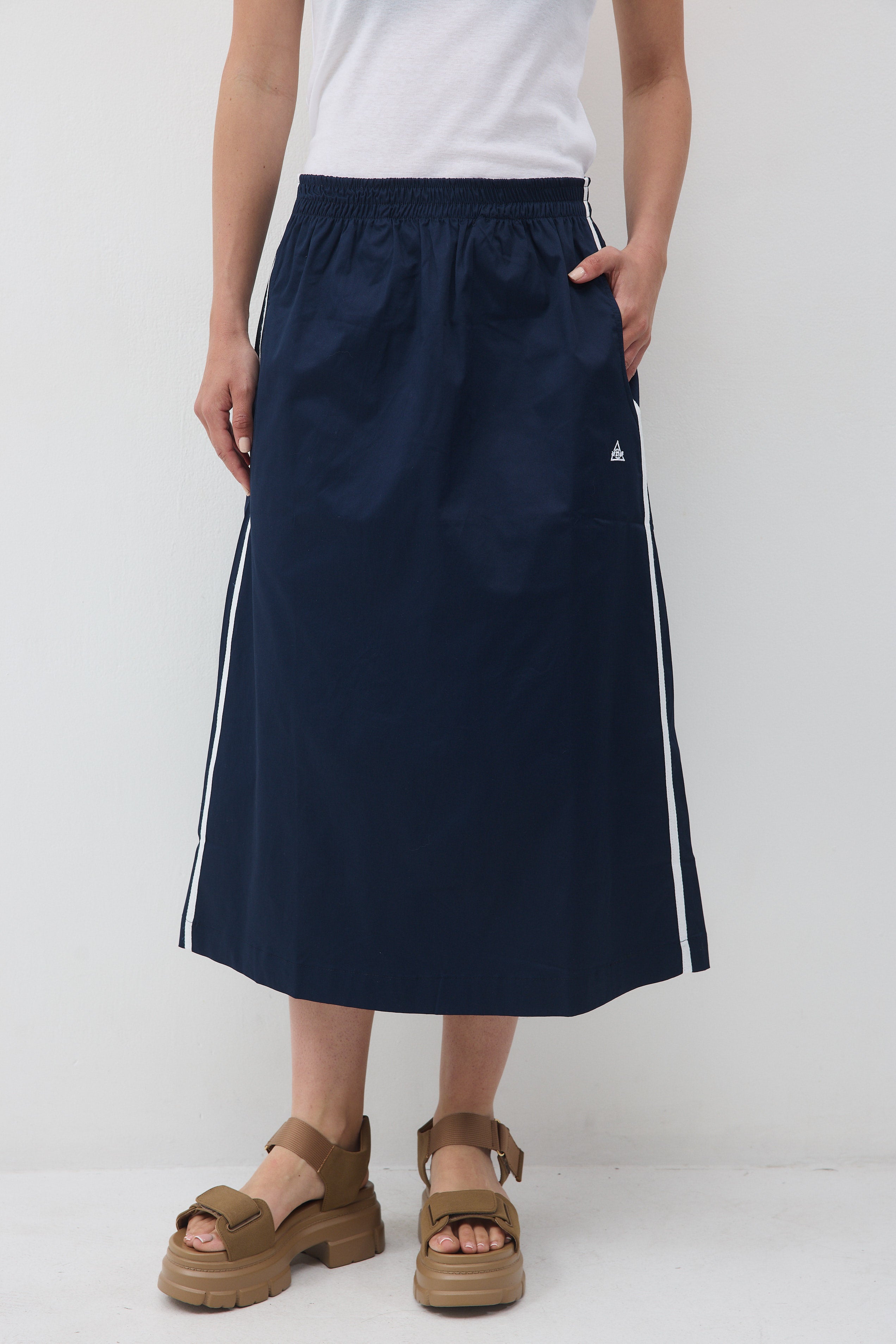 לחצאית יש שני פסים שצבעם לבן בתפר הצד, שני כיסים ורקמת לוגו