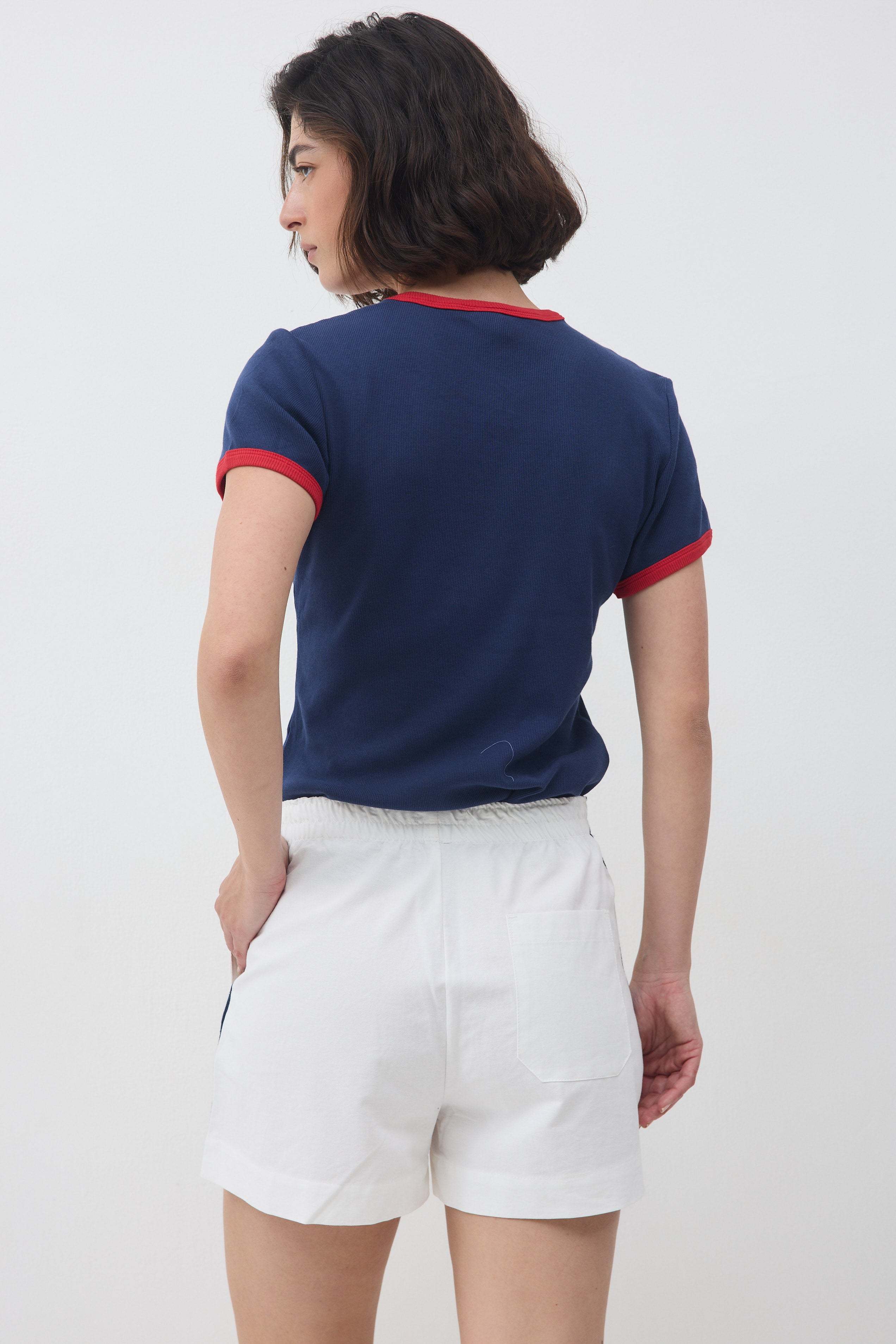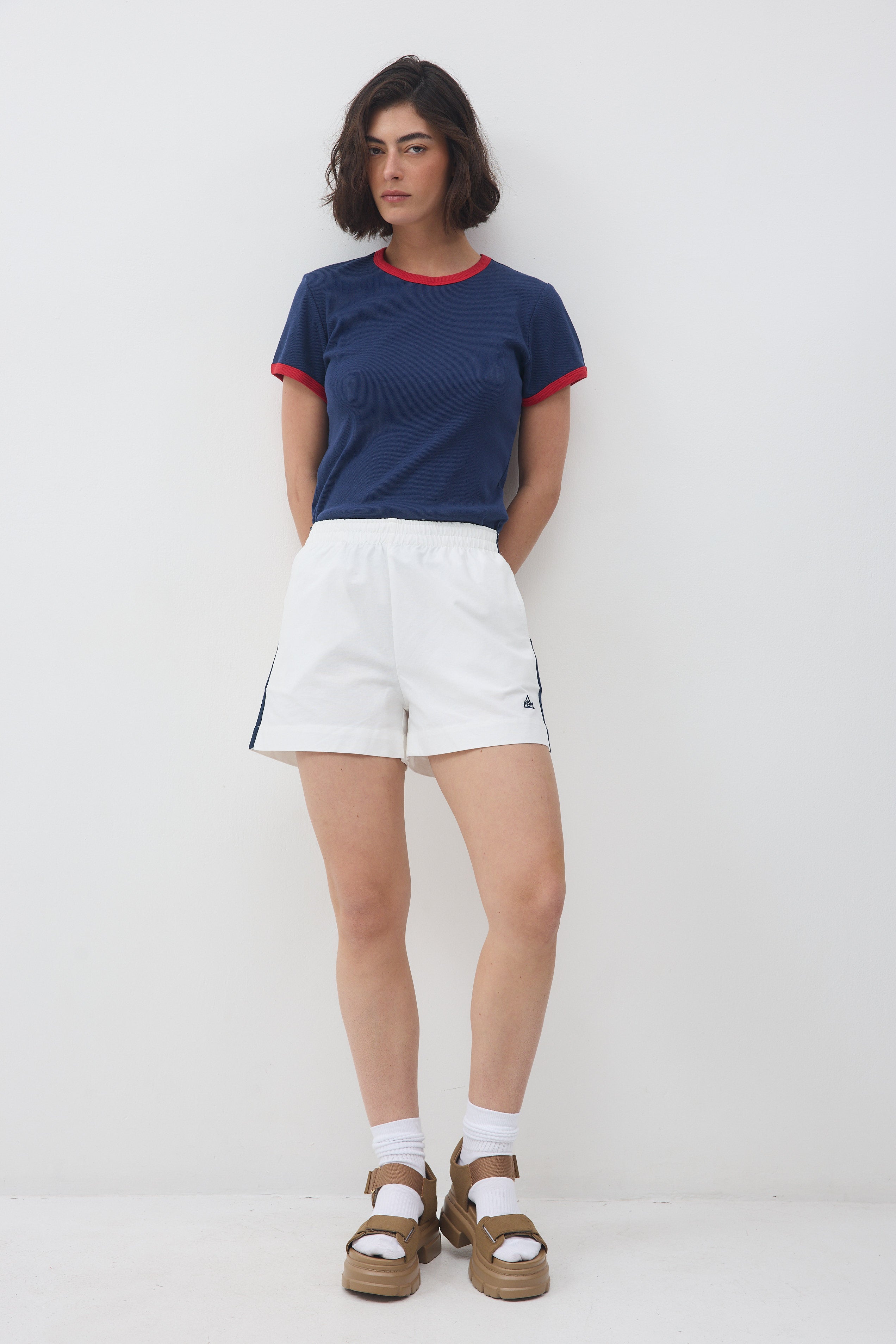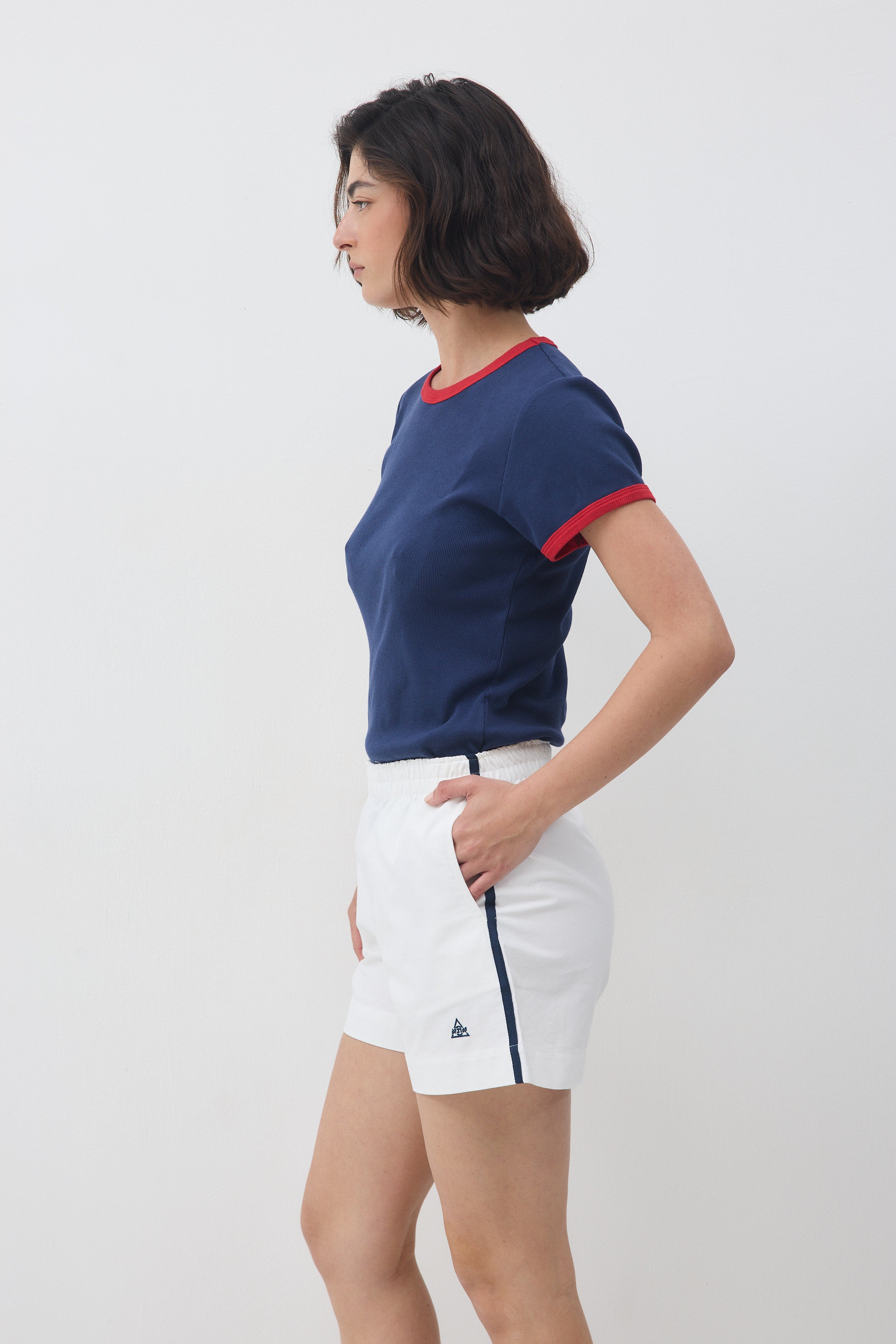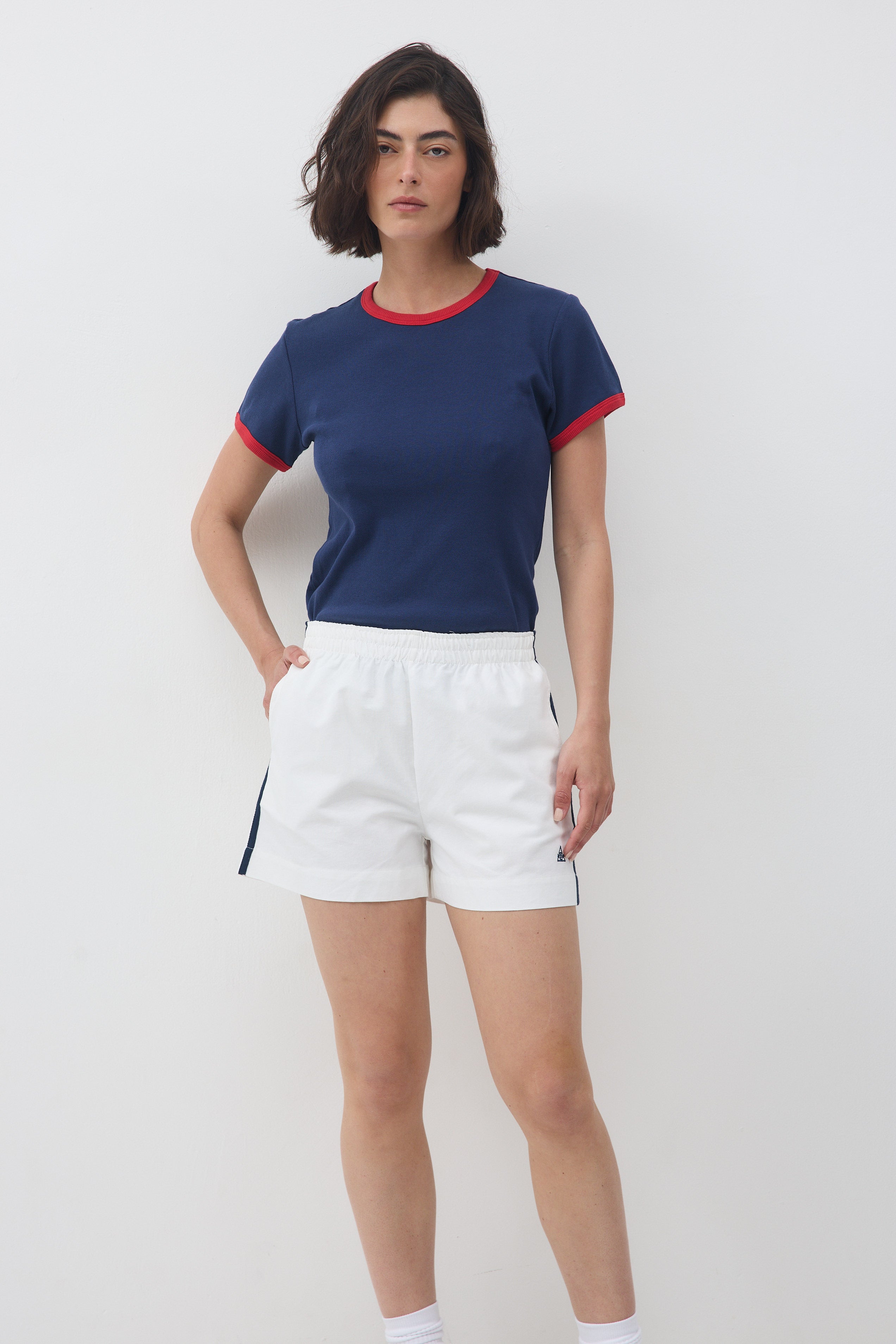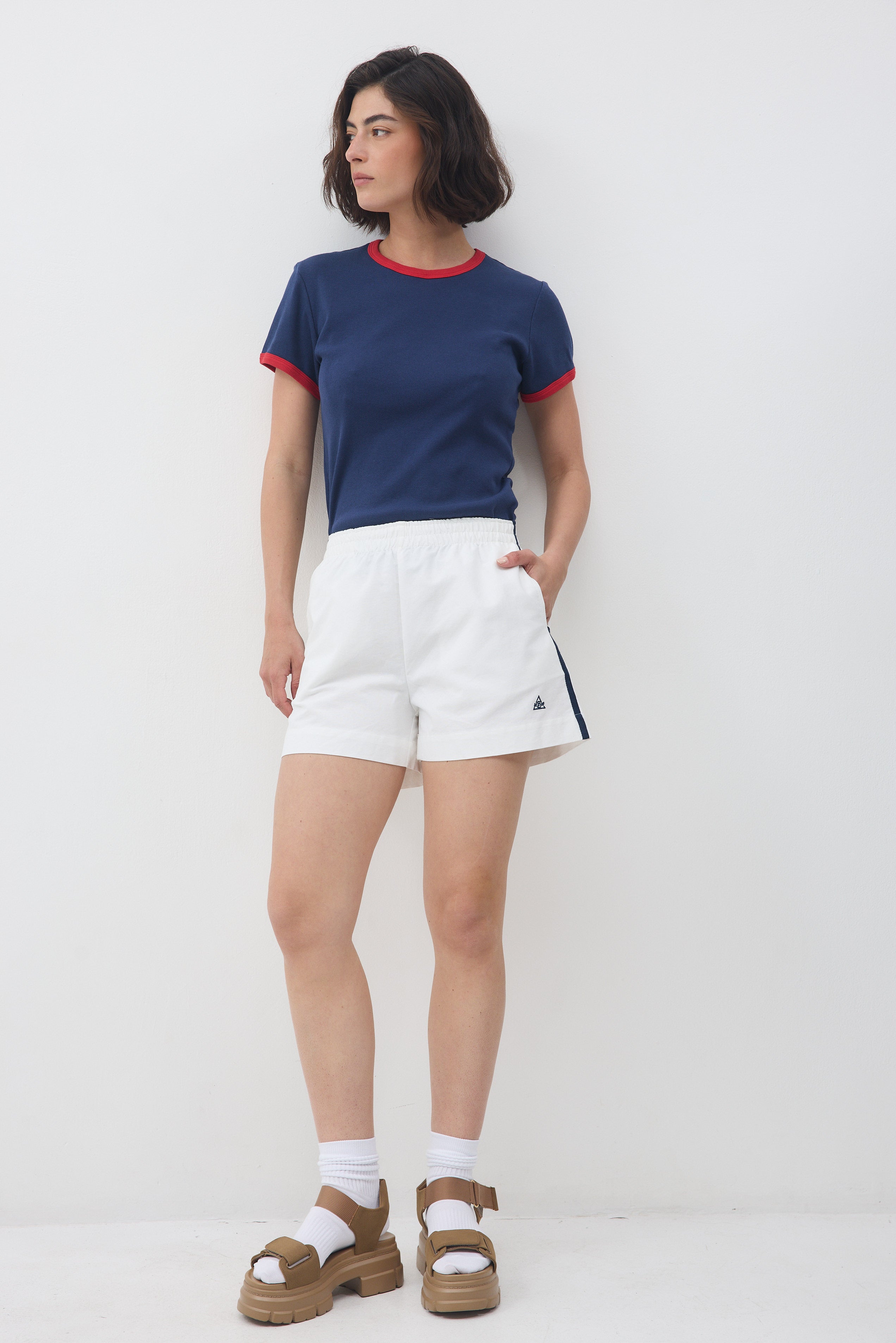 - קצרים, בגזרה נינוחה , עם גומי במותניים , שני כיסים ופס לבן בתפר צד, עם כיס אחד אחורי