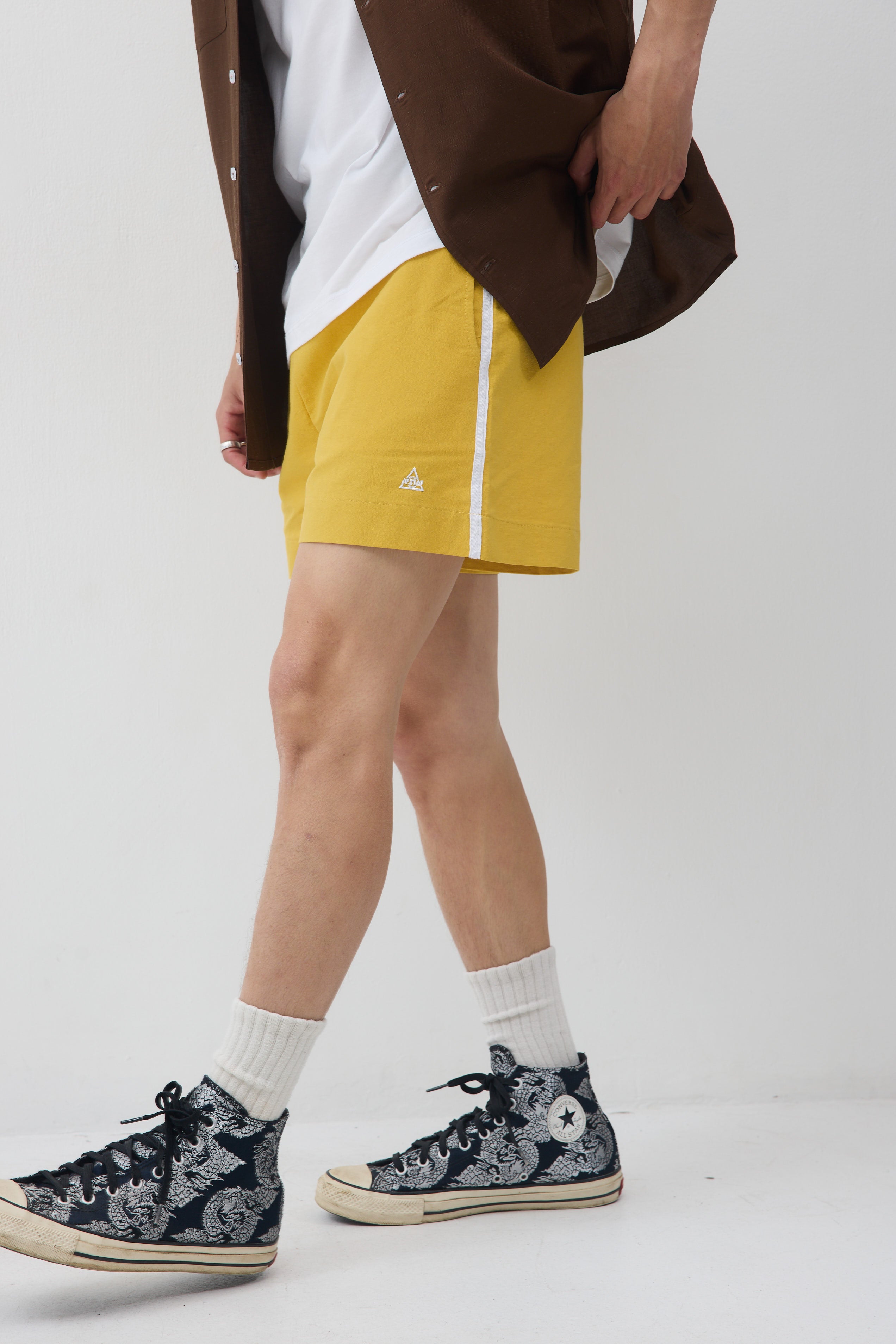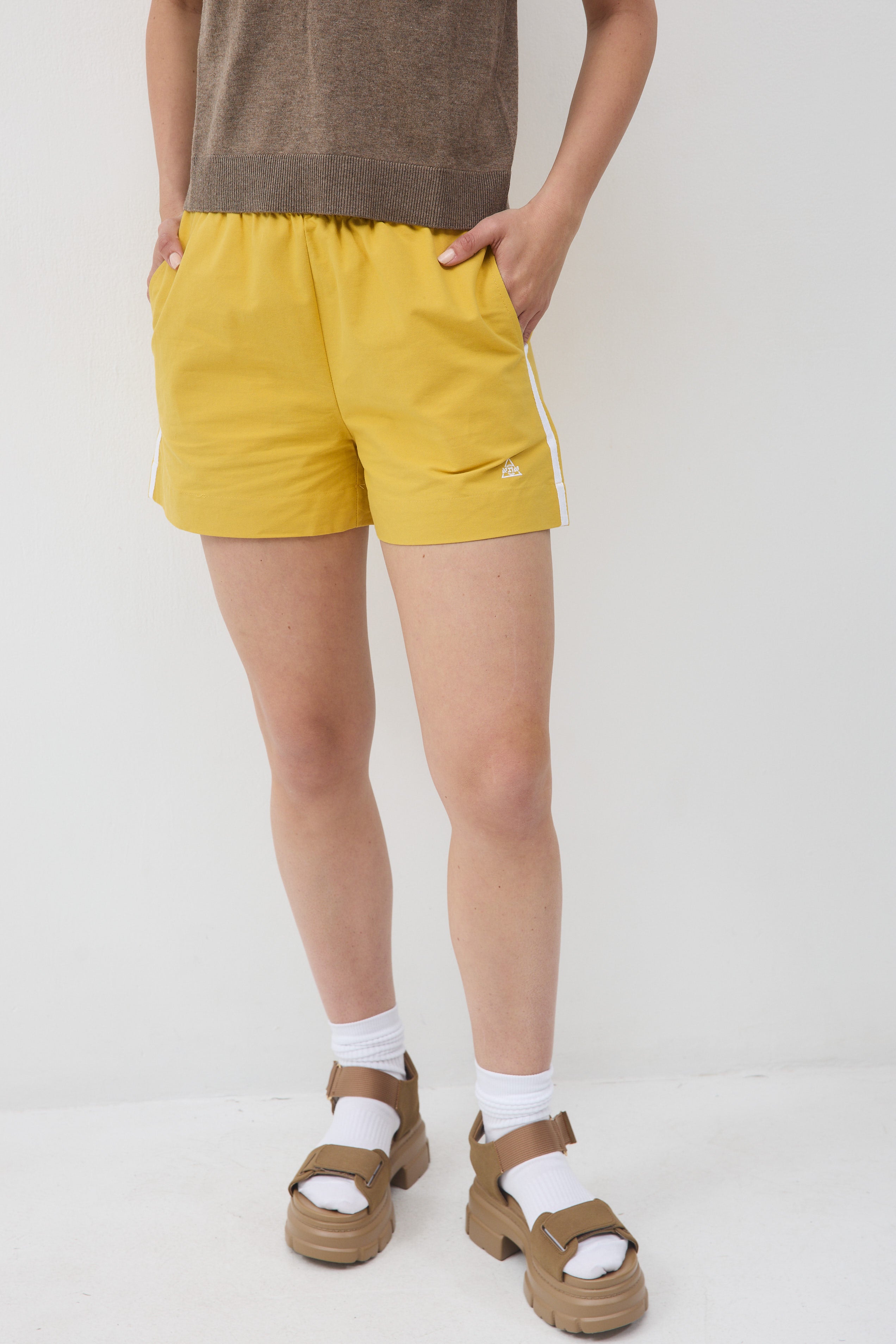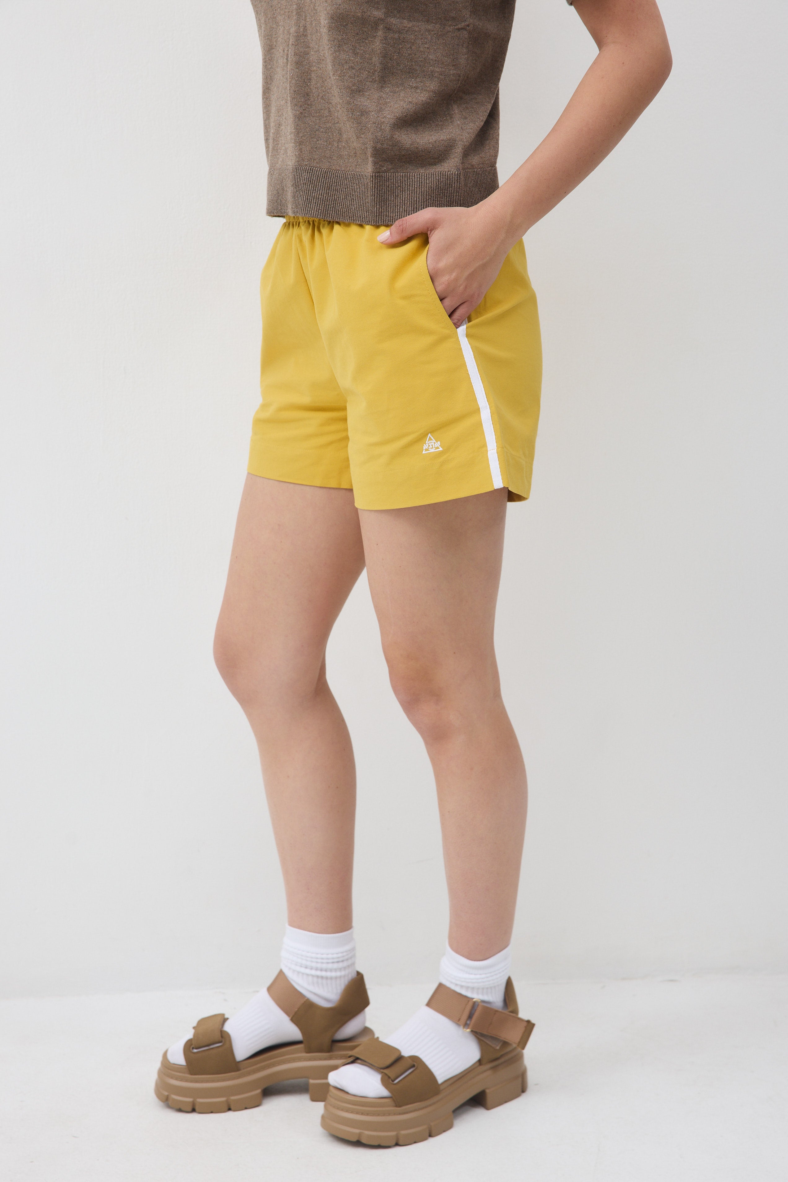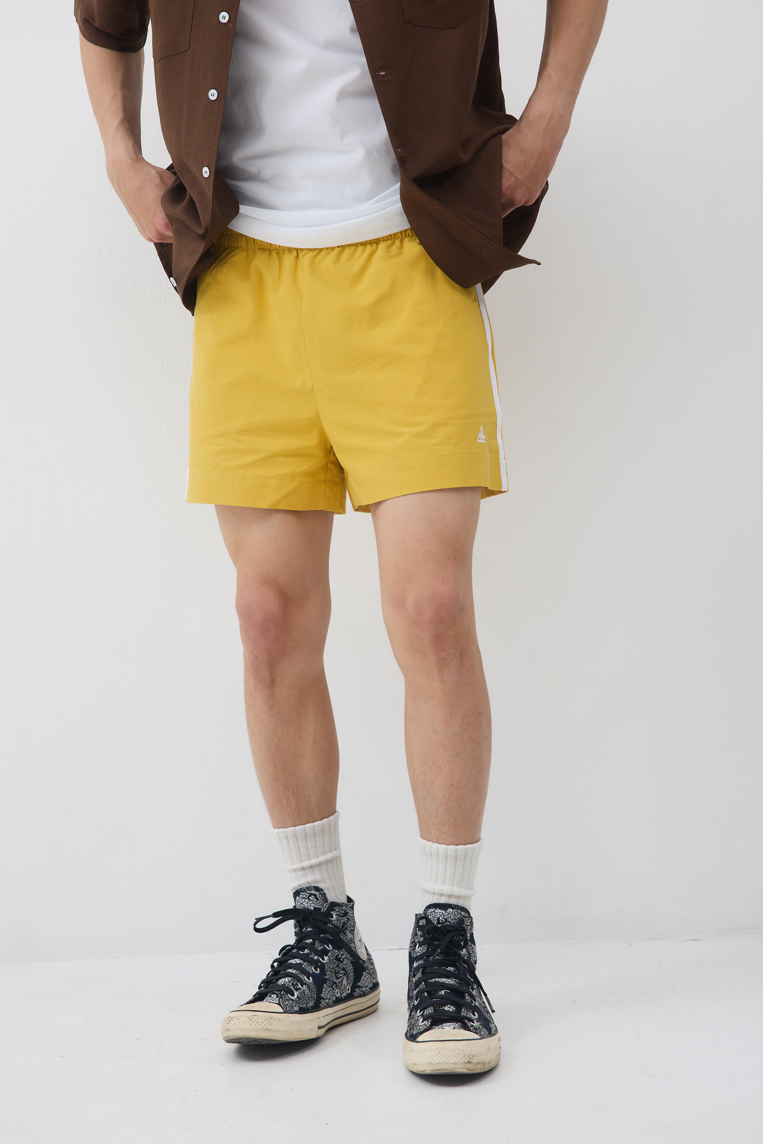 גומי מקיף במותן , שני כיסים ופס לבן בתפר צד, עם כיס אחד אחורי.