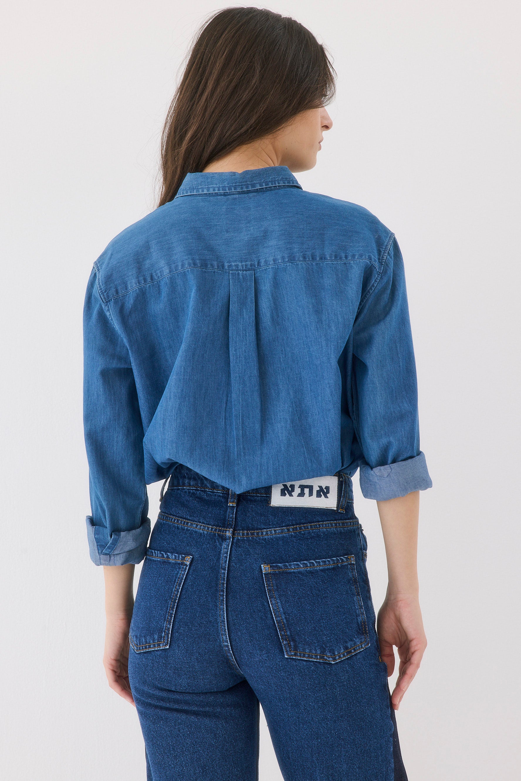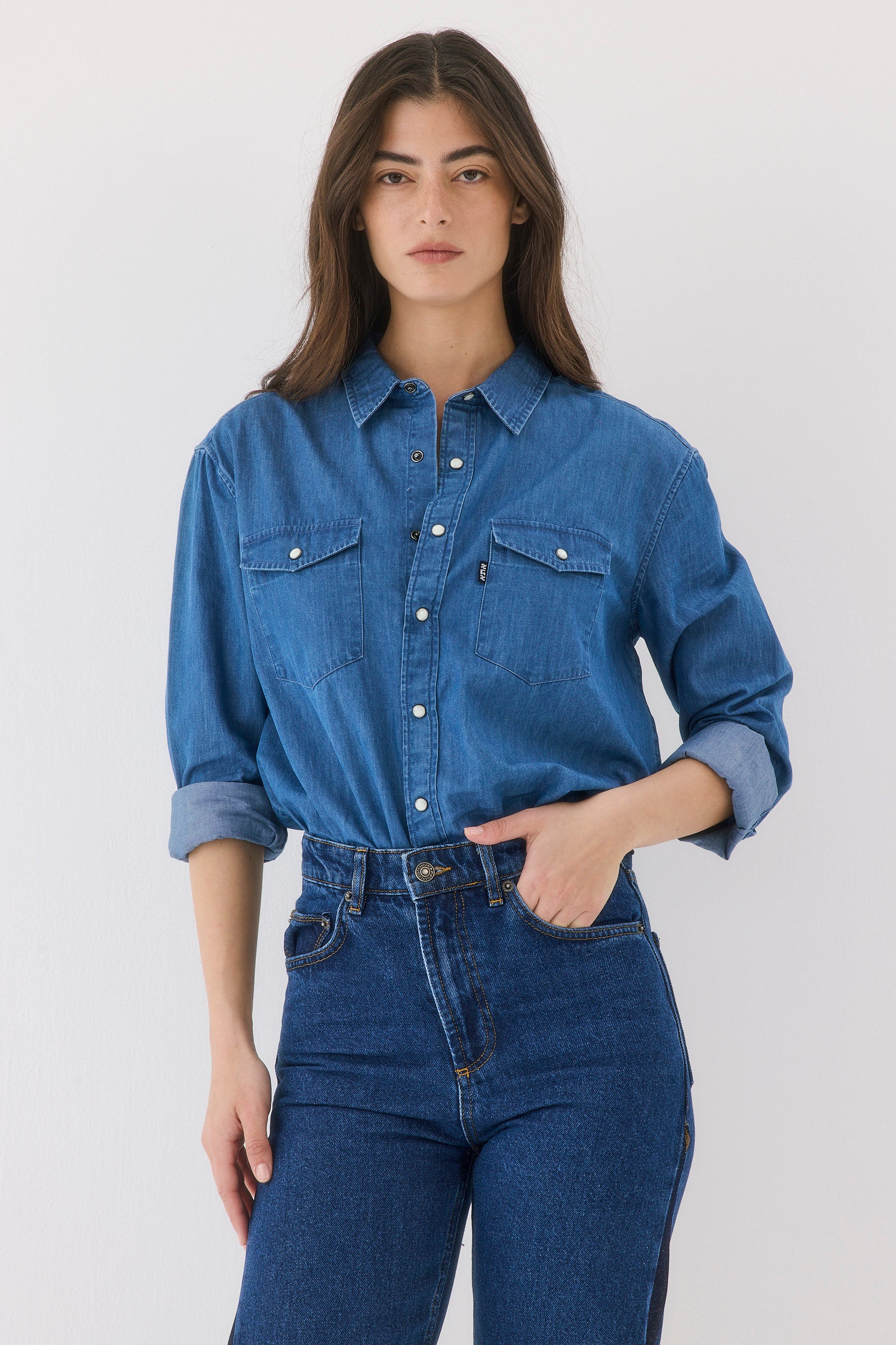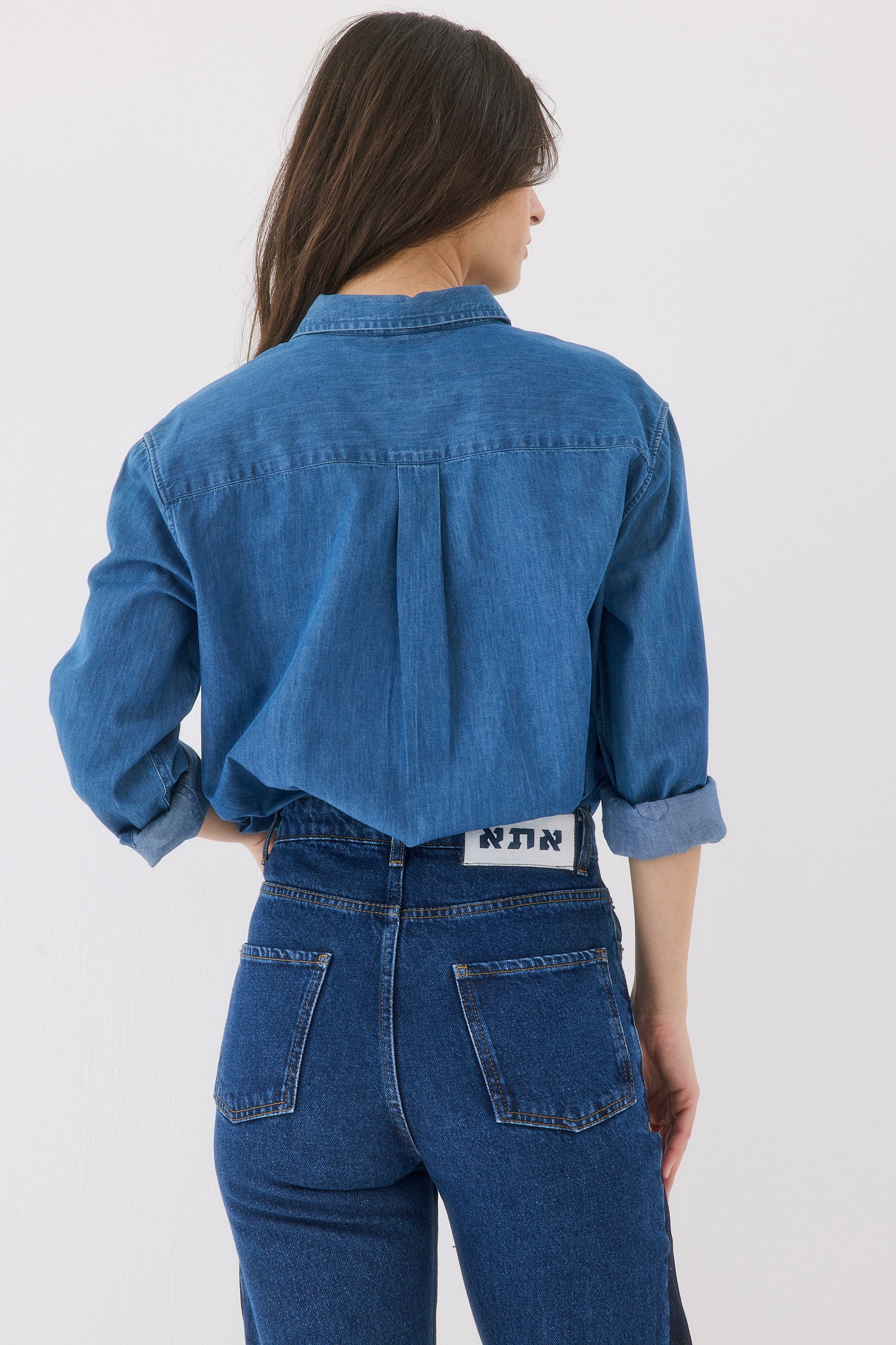 חולצת ג'ינס, שרוולים ארוכים וצווארון מחודד, סגירת כפתורי מתכת במרכז, ושני כיסים קדמיים עם סגירת כפתור בולטים בחזה. הפרטים הקטנים, כמו התפרים המדויקים והכפתורים במראה מתכתי, מעניקים לחולצה מראה ייחודי שמתאים לכל אאוטפיט יומיומי או שכבה עליונה למגוון שילובים