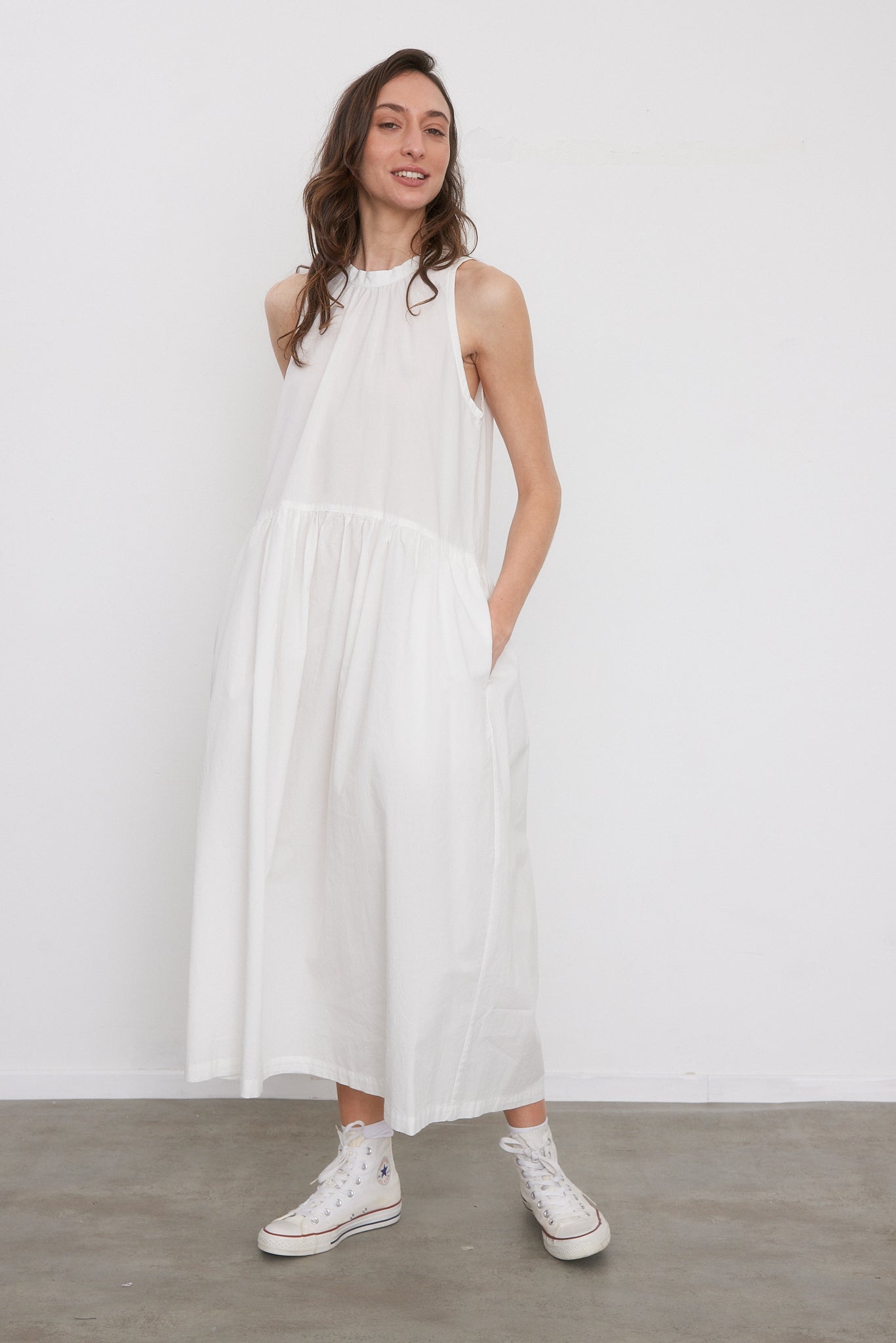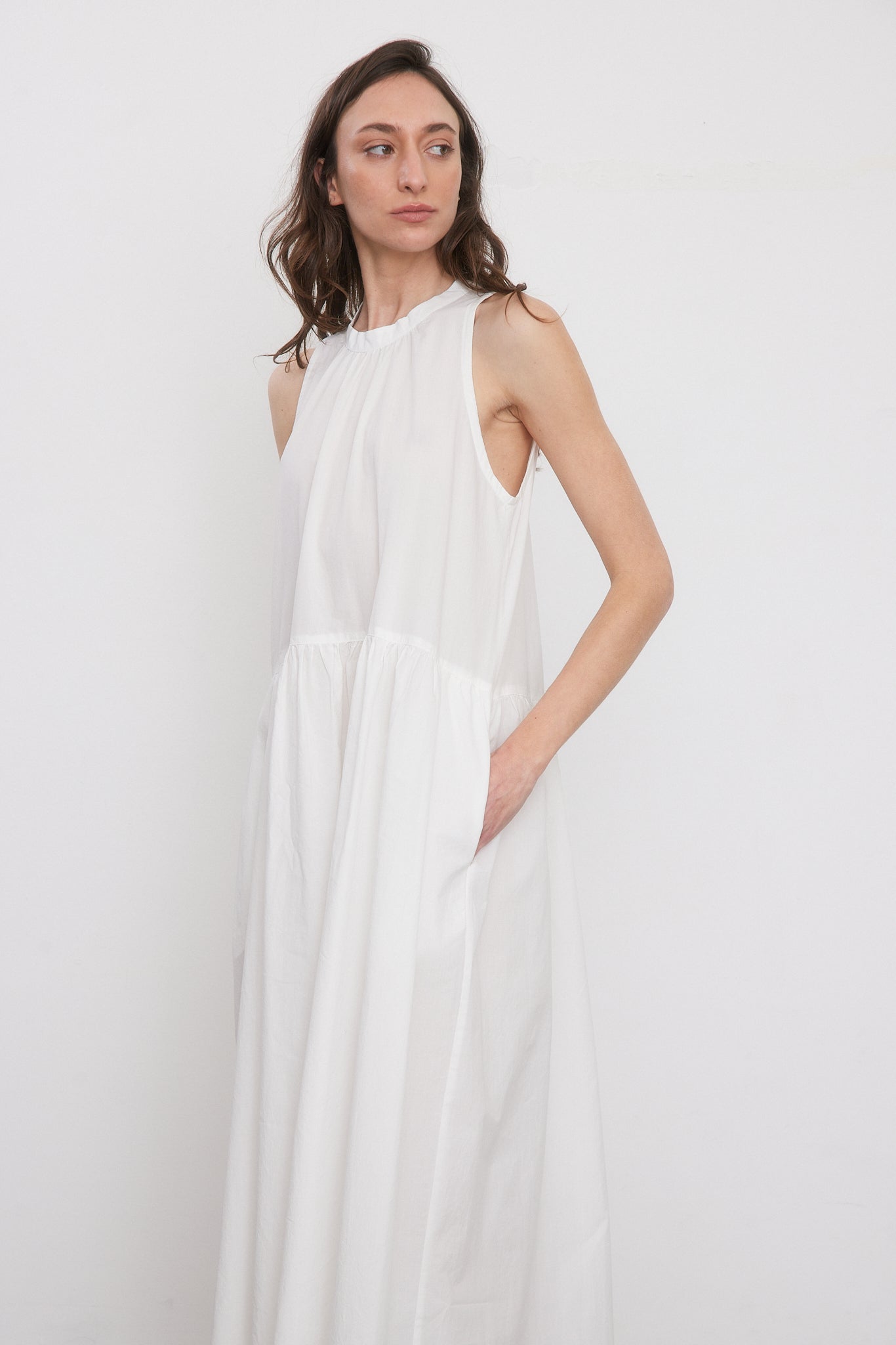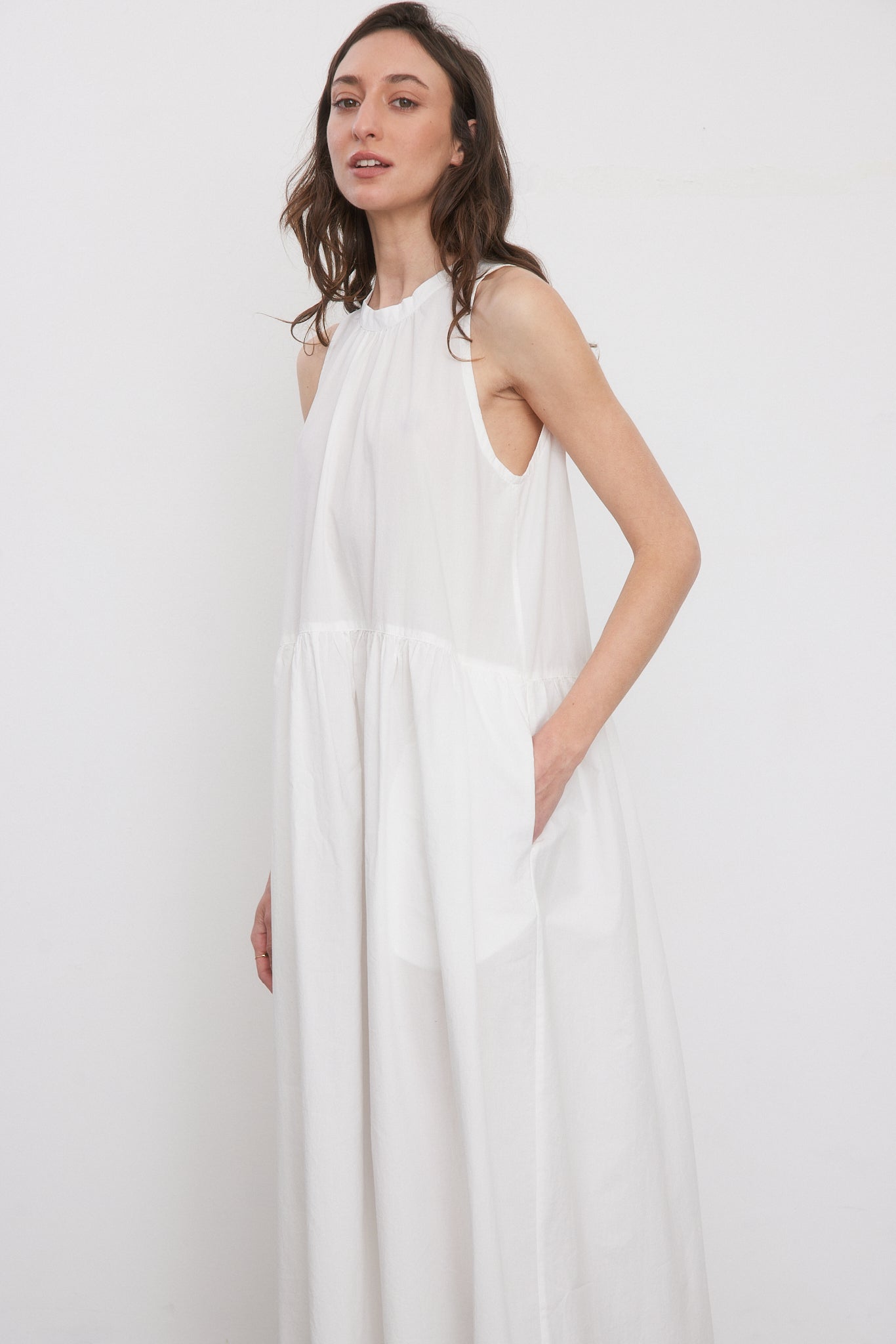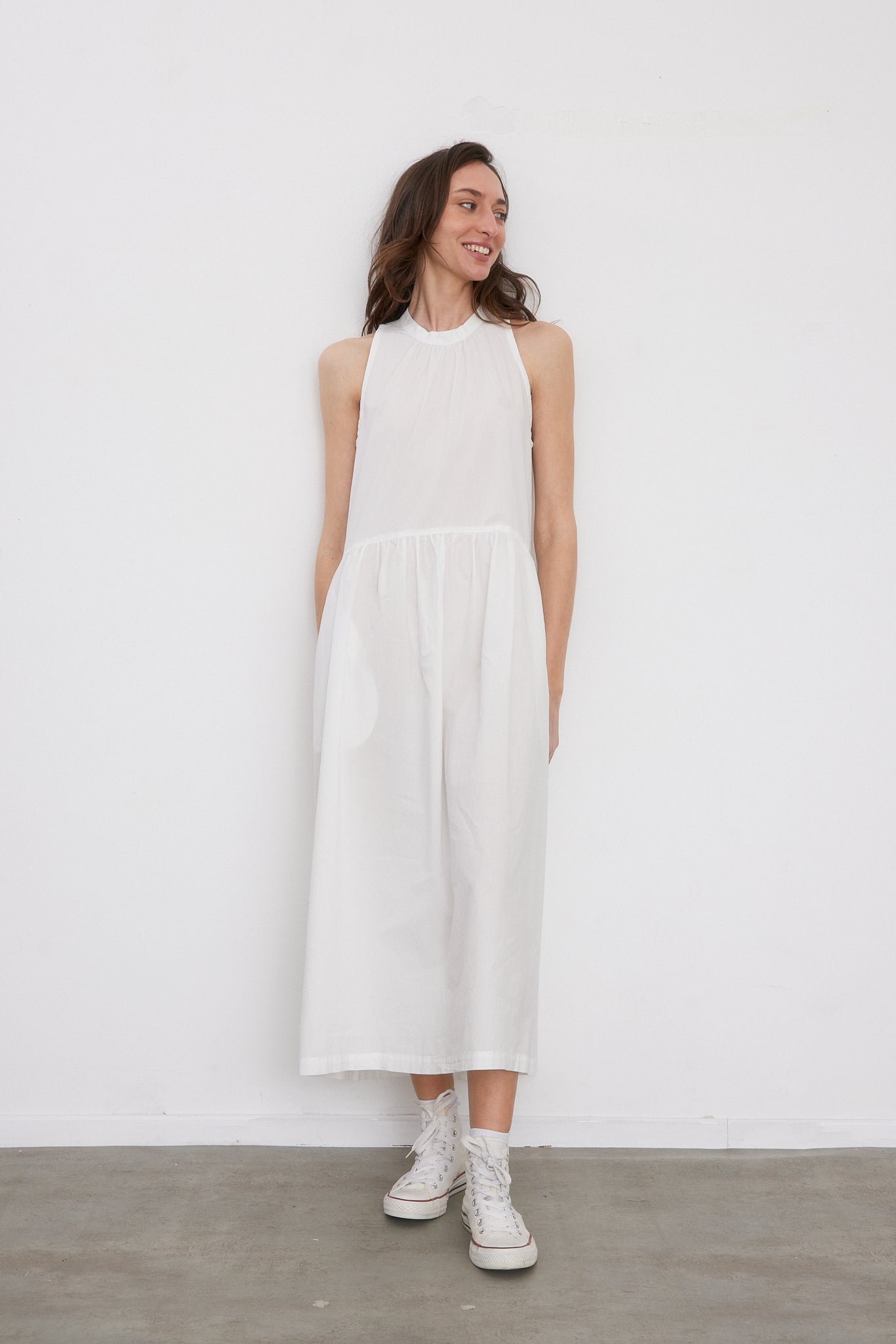 שמלה בגזרה משוחררת באורך מקסי. השמלה ללא שרוולים, עם מפתח צאוור עגול מעט מוגבה
