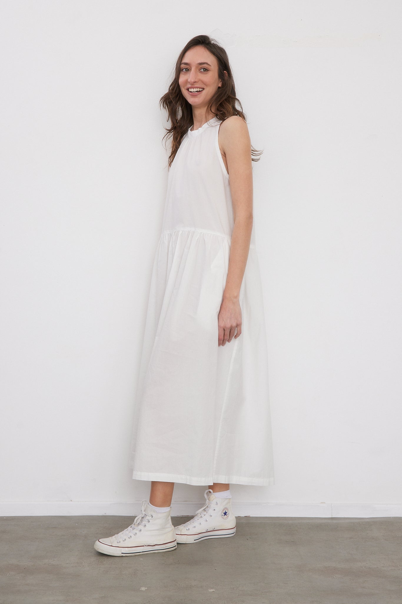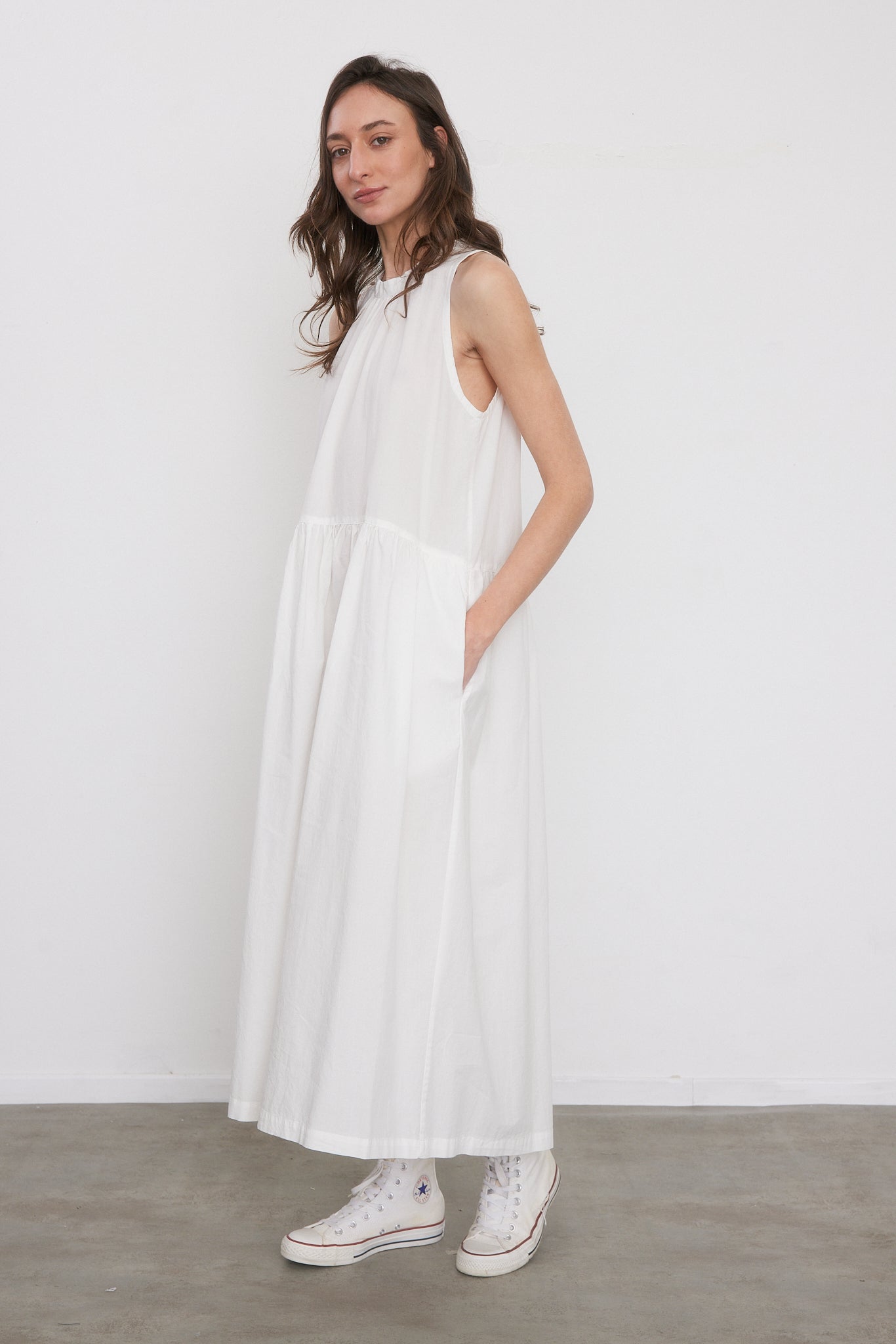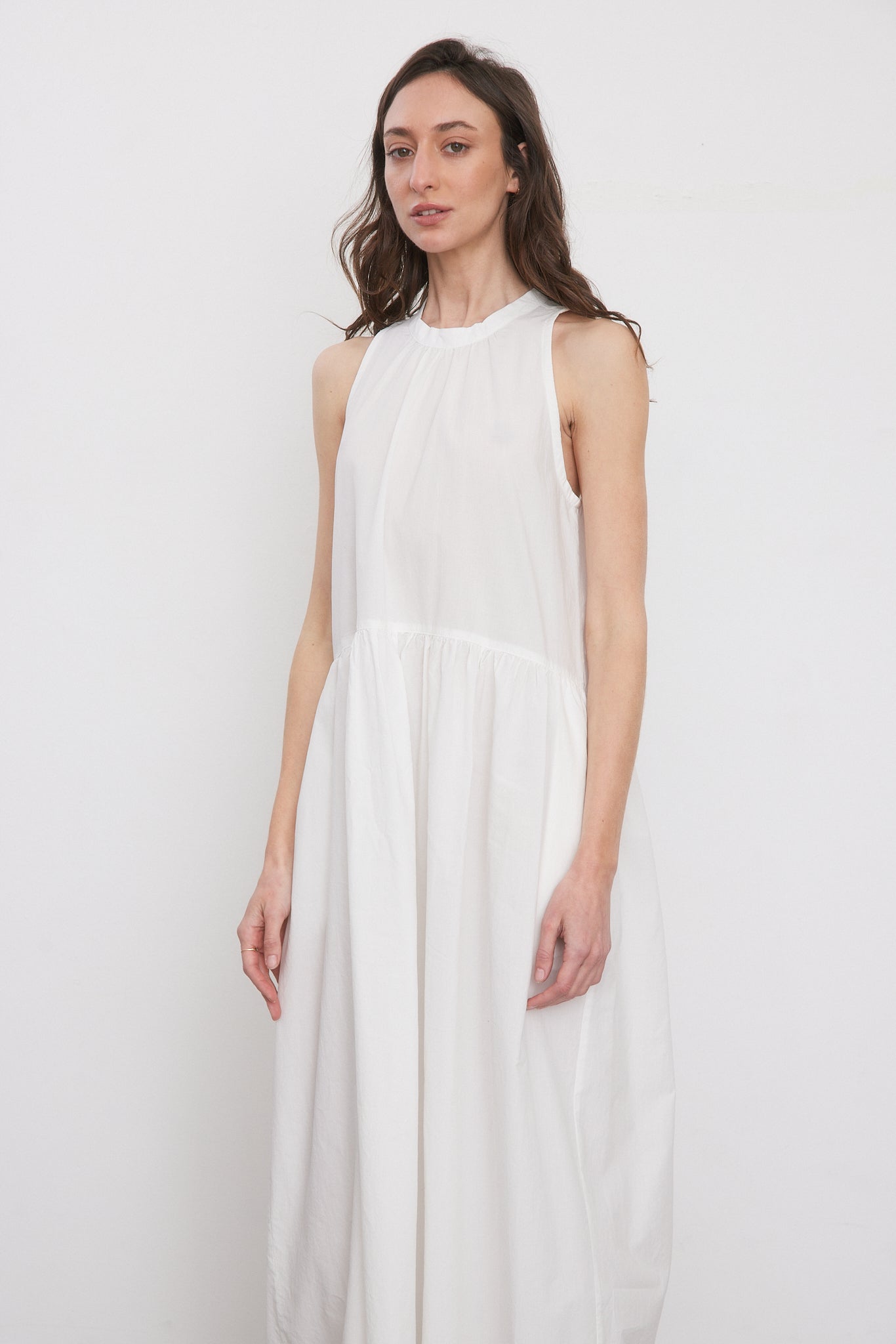 שמלה בגזרה משוחררת באורך מקסי. השמלה ללא שרוולים, עם מפתח צאוור עגול מעט מוגבה