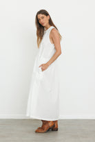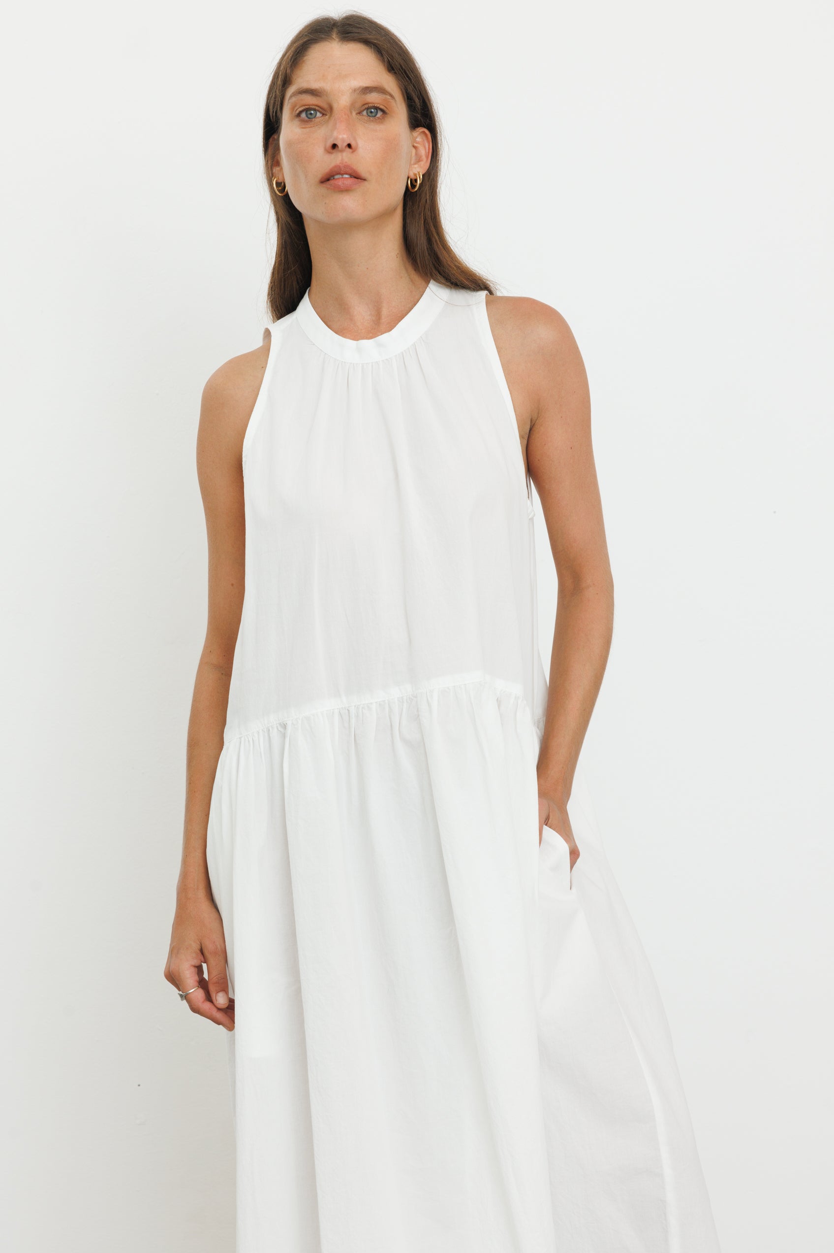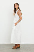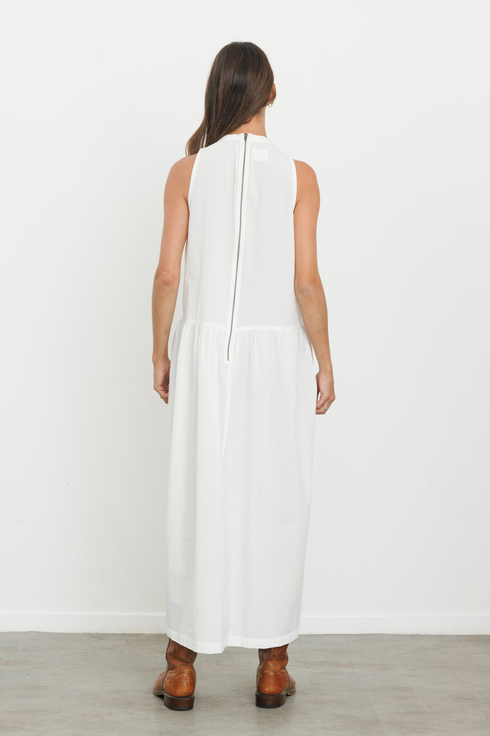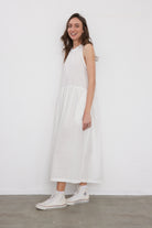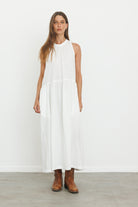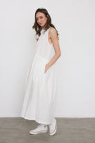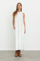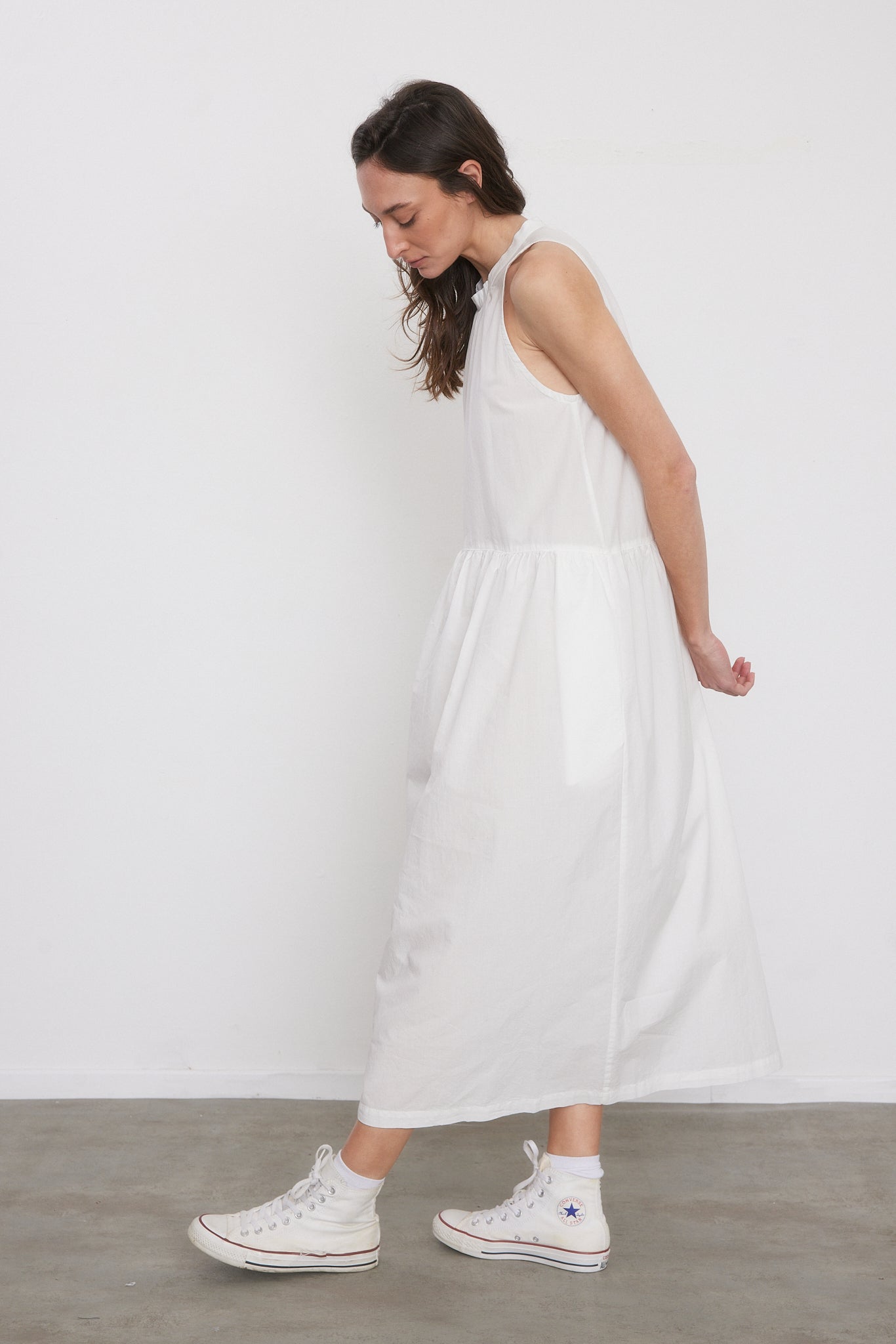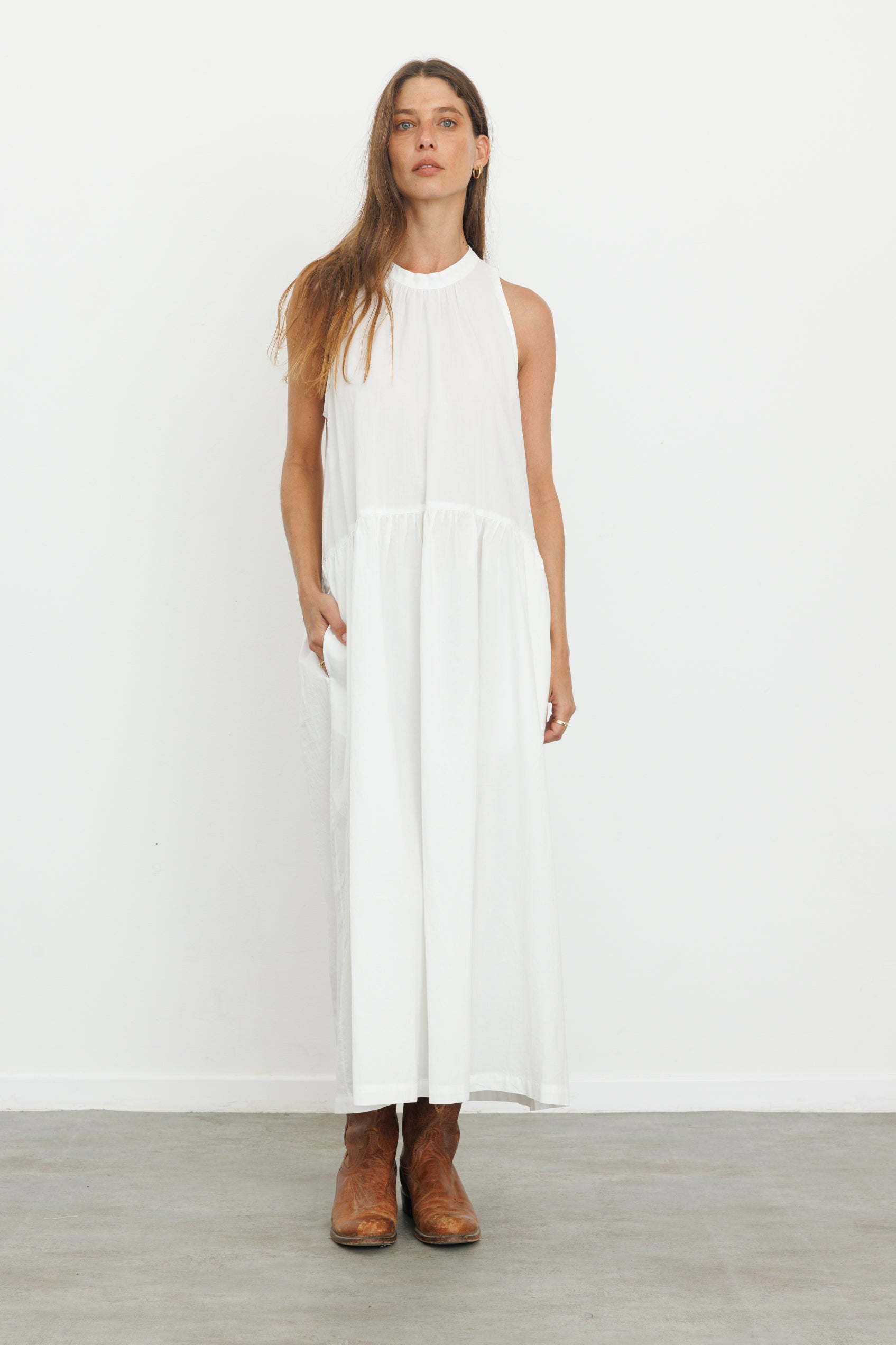 שמלה בגזרה משוחררת באורך מקסי. השמלה ללא שרוולים, עם מפתח צאוור עגול מעט מוגבה