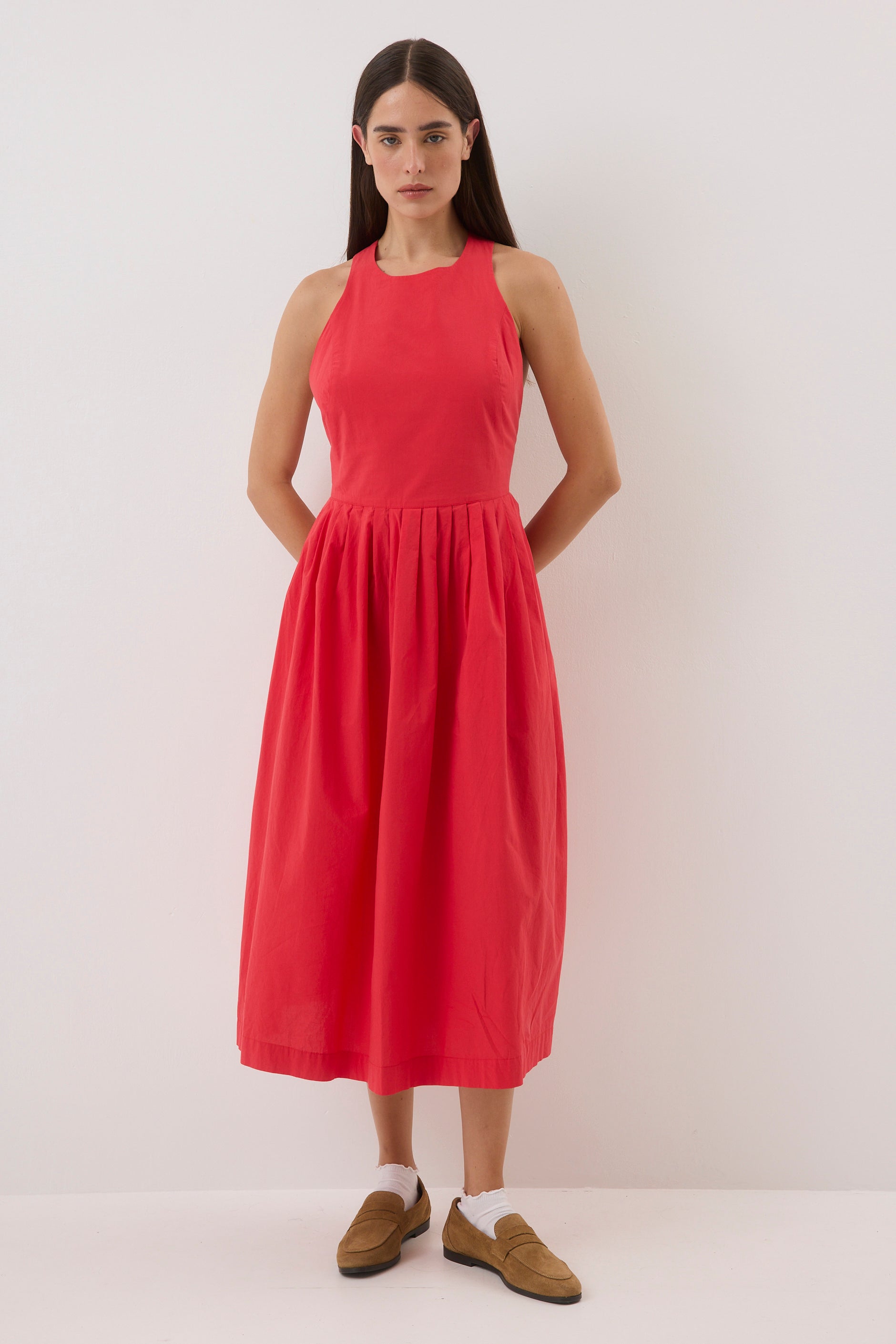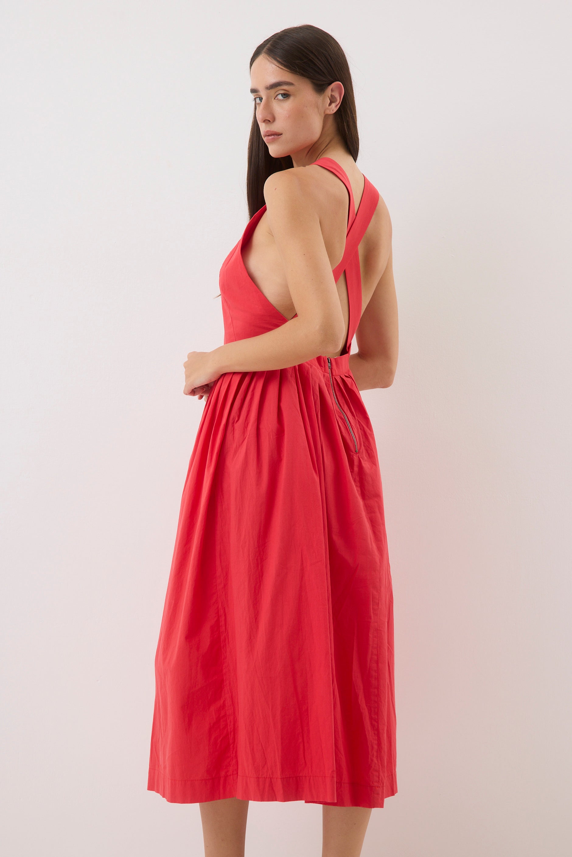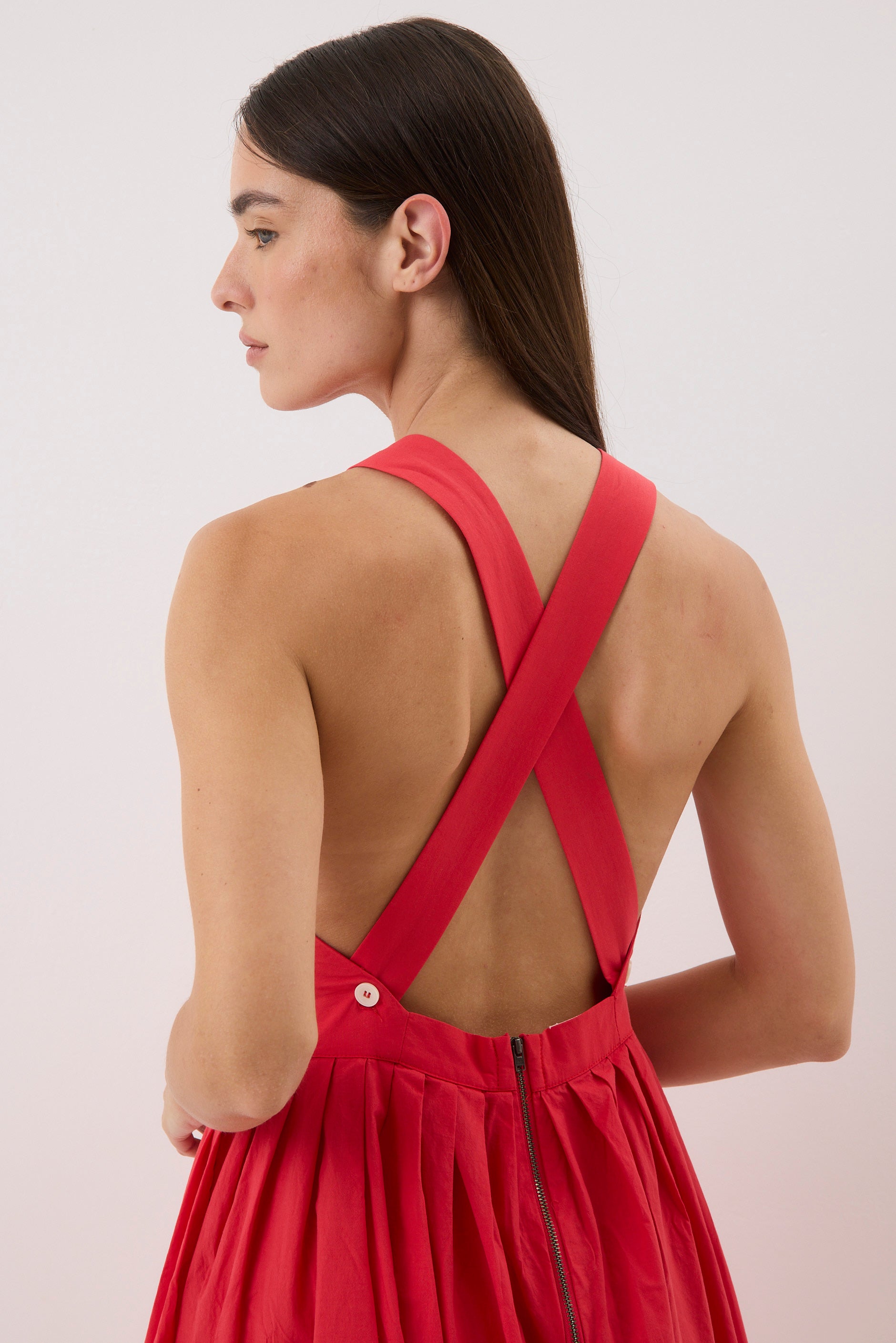 • גזרה משוחררת באורך מידי עם מפתח צוואר עגול גב חשוף וכתפיות רחבות מצטלבות בחלקה האחורי