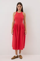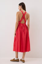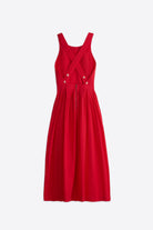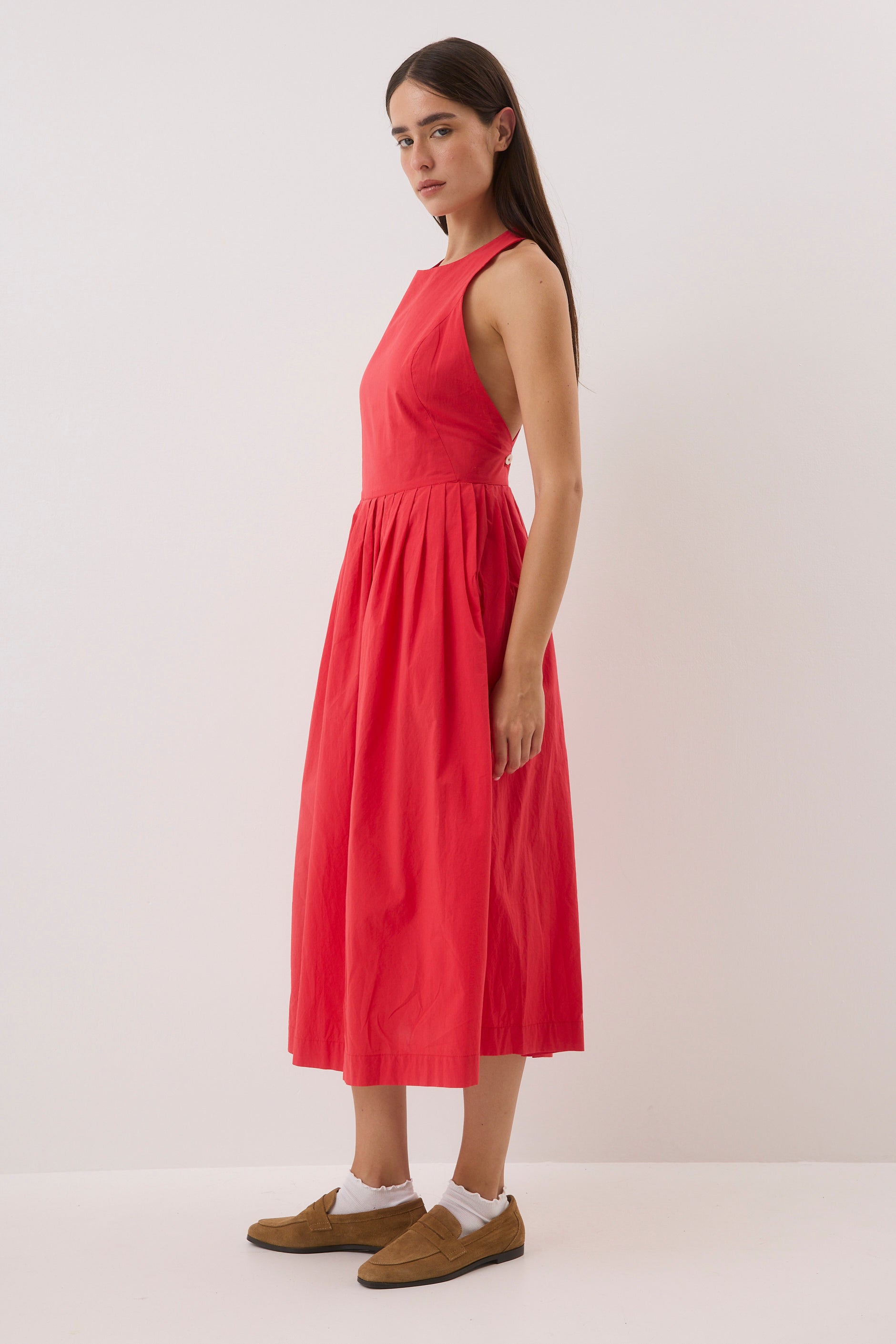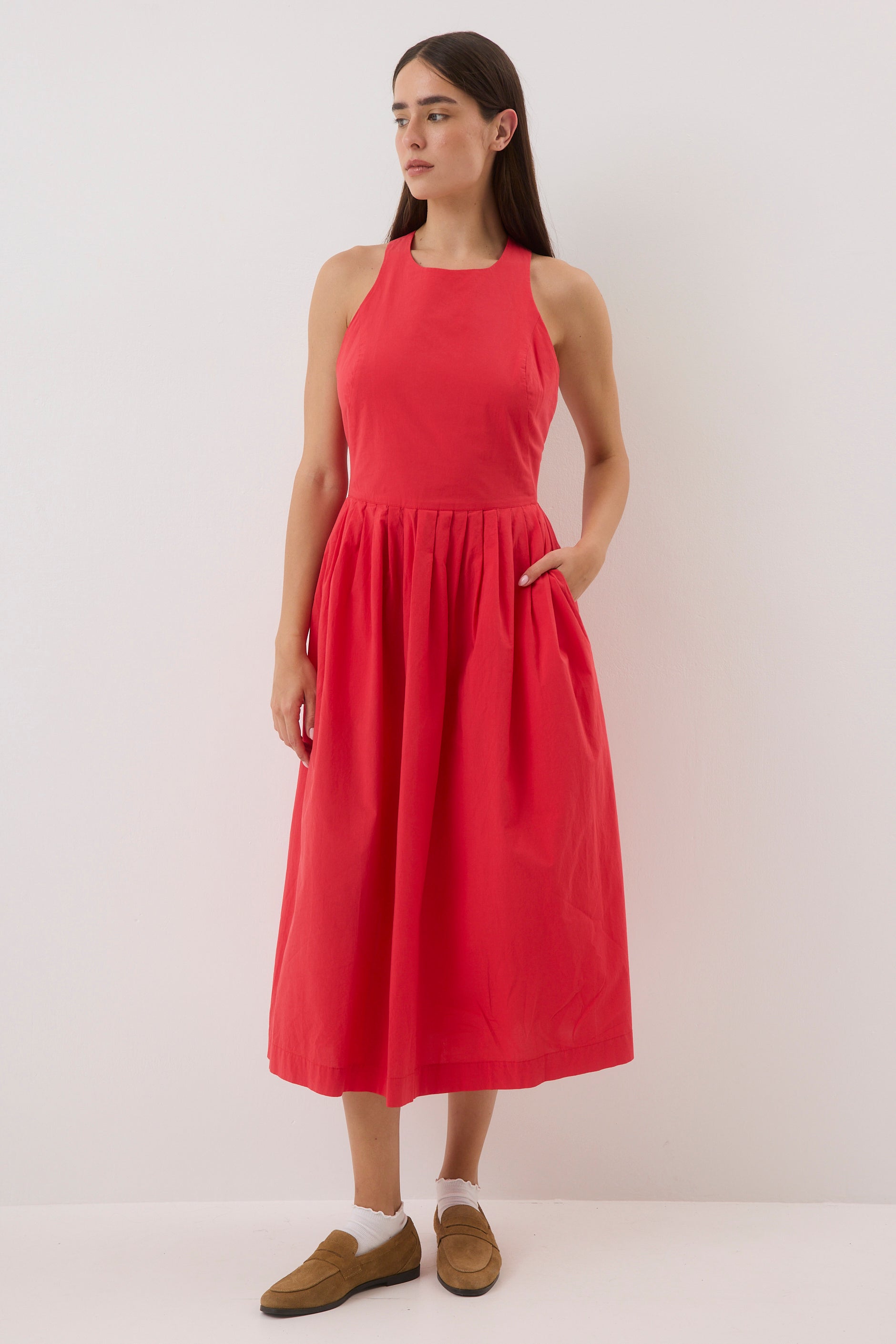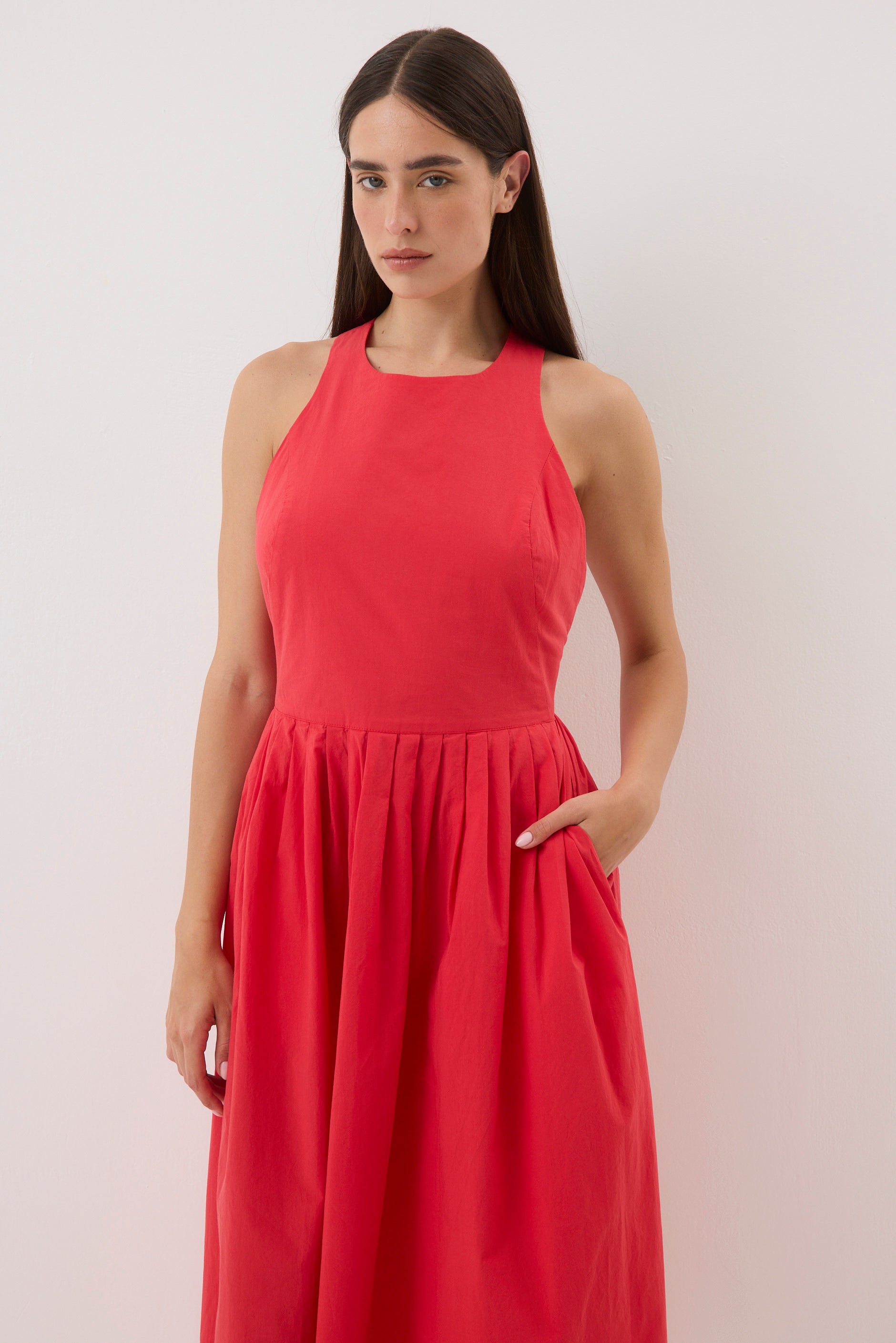 • גזרה משוחררת באורך מידי עם מפתח צוואר עגול גב חשוף וכתפיות רחבות מצטלבות בחלקה האחורי