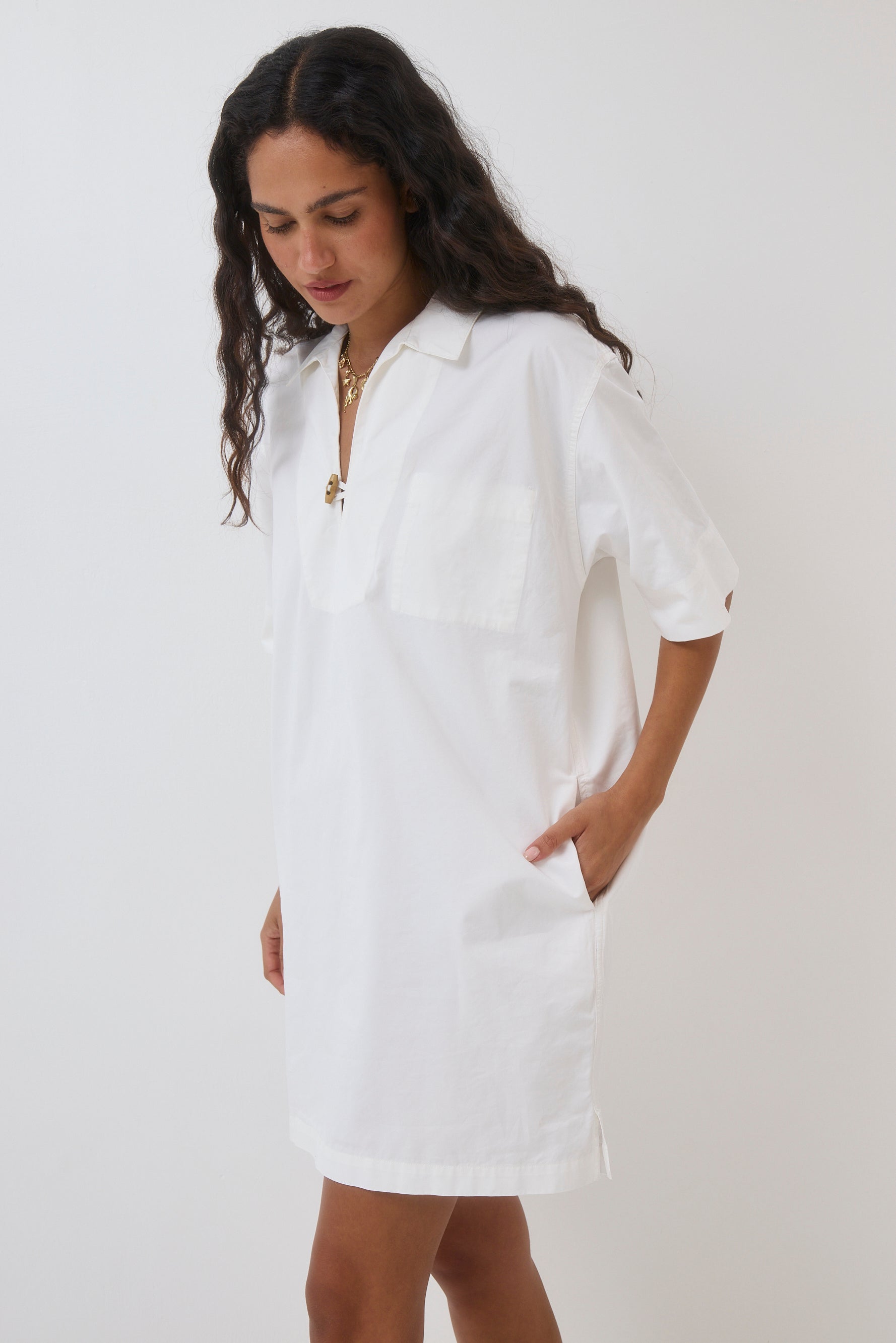 על מפתח הצאוור, הצאוורון, קיצרנו את השרוולים לאורך מרפק, והארכנו את החולצה לשמלה באורך מיני, אפשר ללבוש גם עם טי פסים שילה