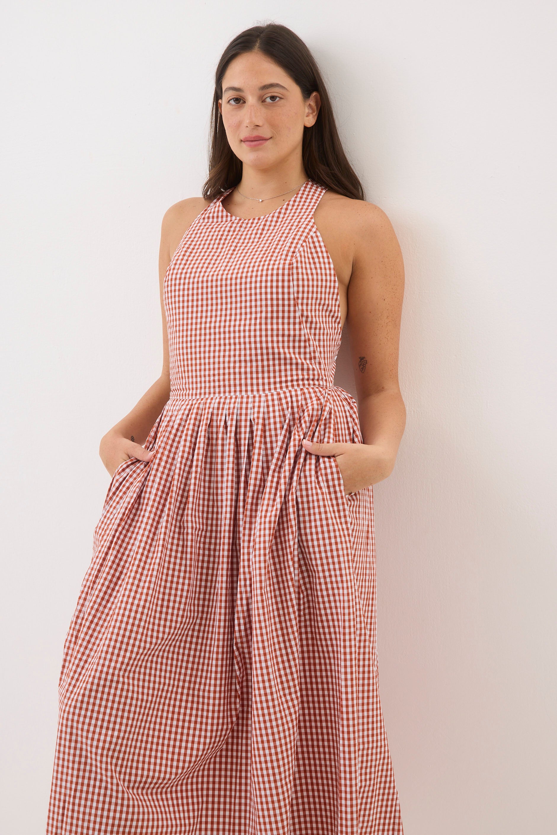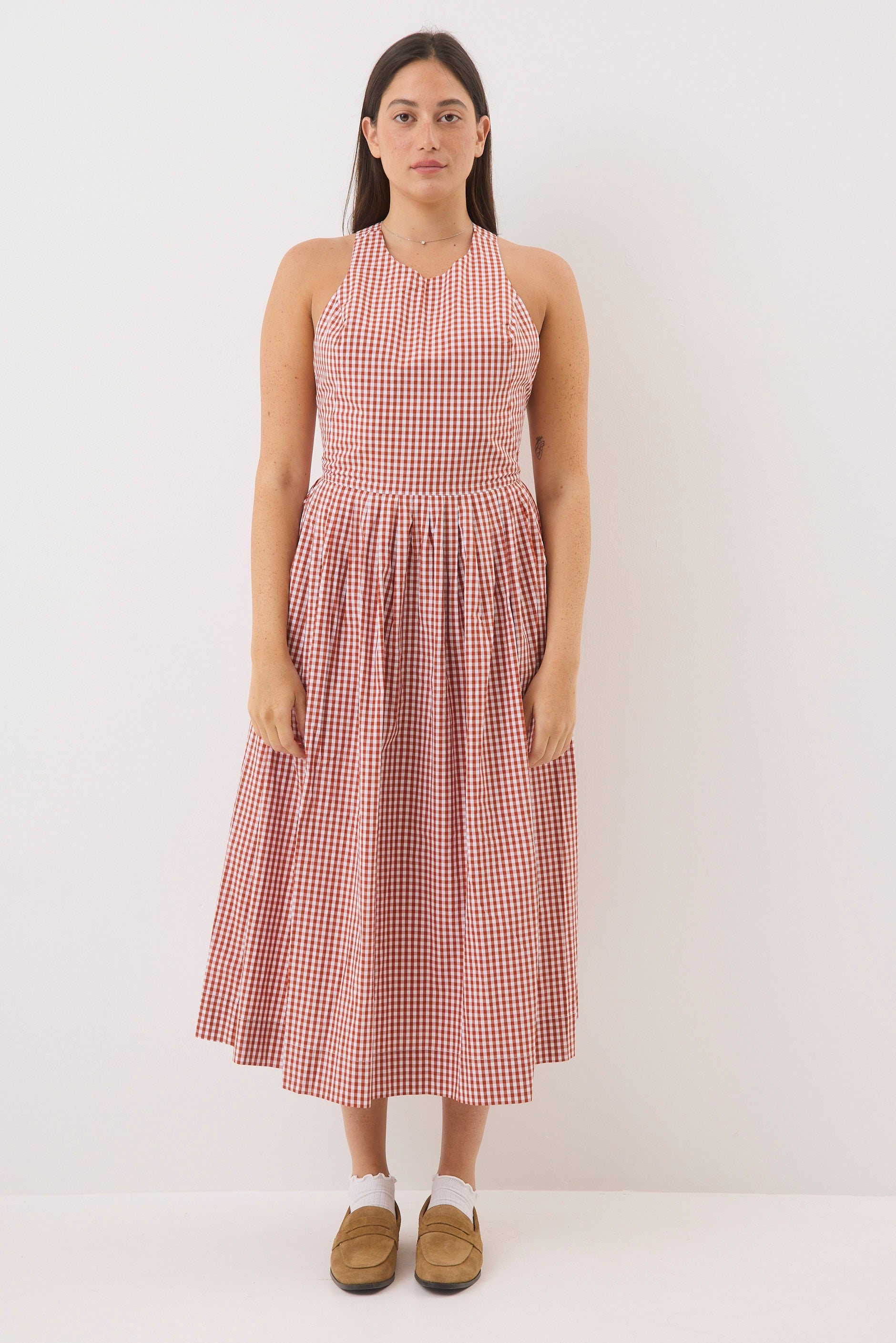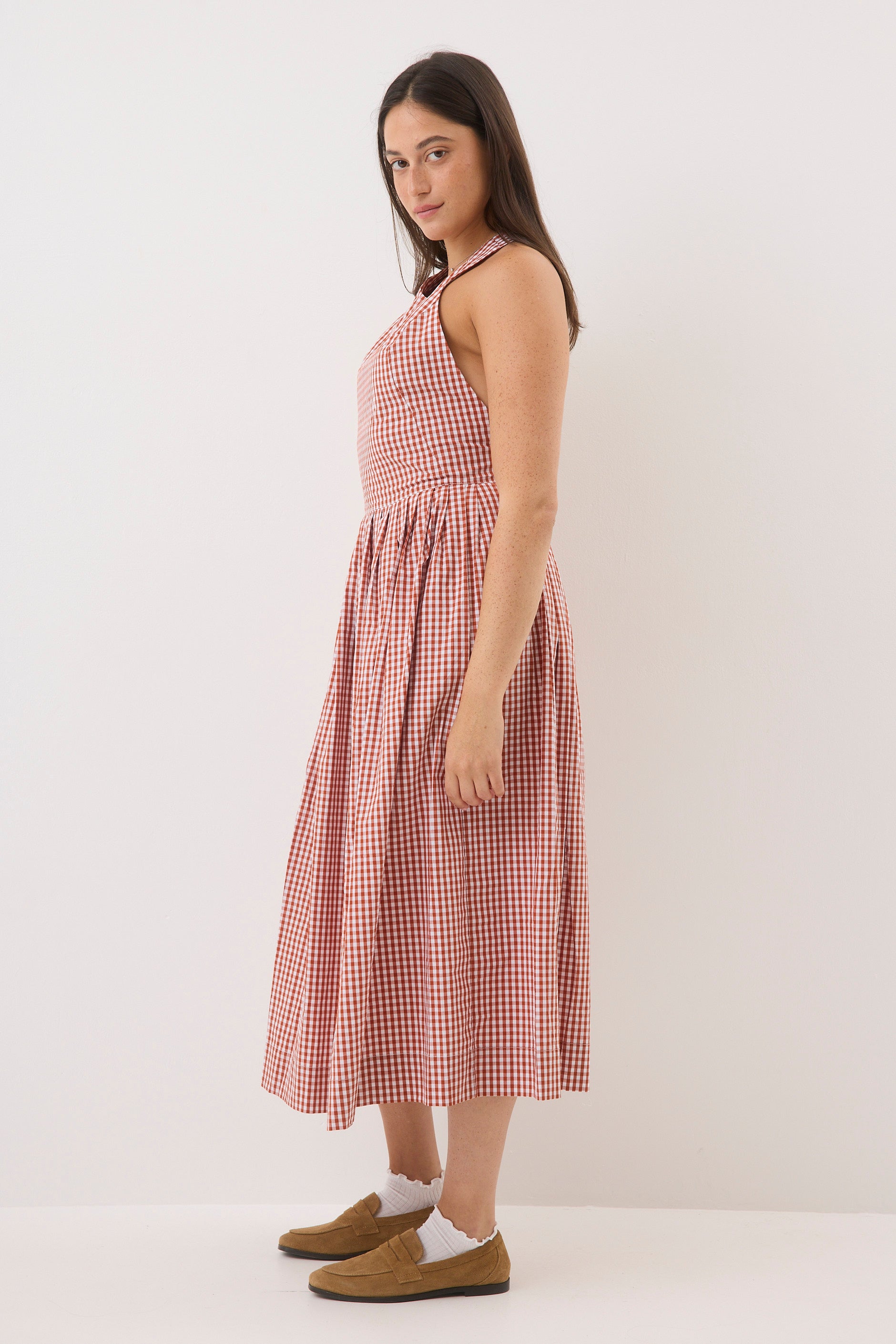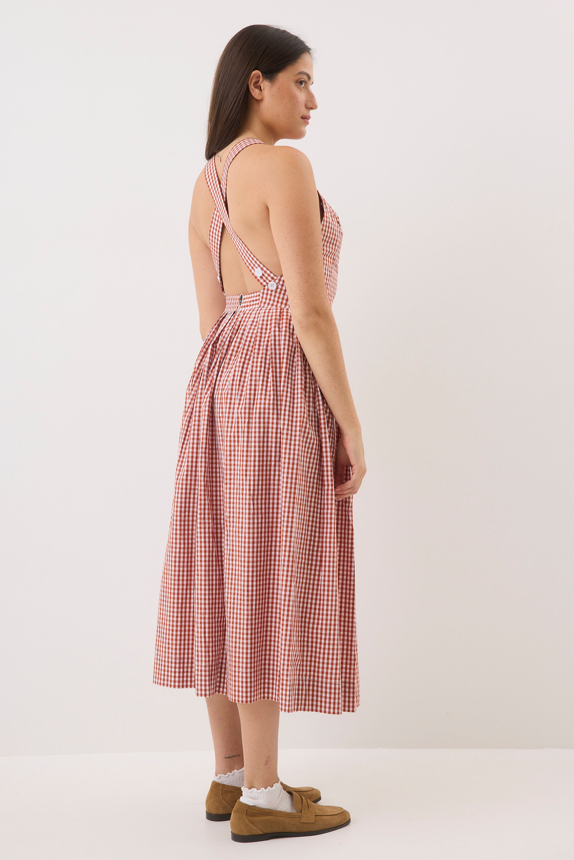 - גזרה משוחררת באורך מידי עם מפתח צוואר עגול גב חשוף וכתפיות רחבות מצטלבות בחלקה האחורי