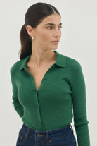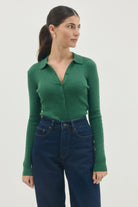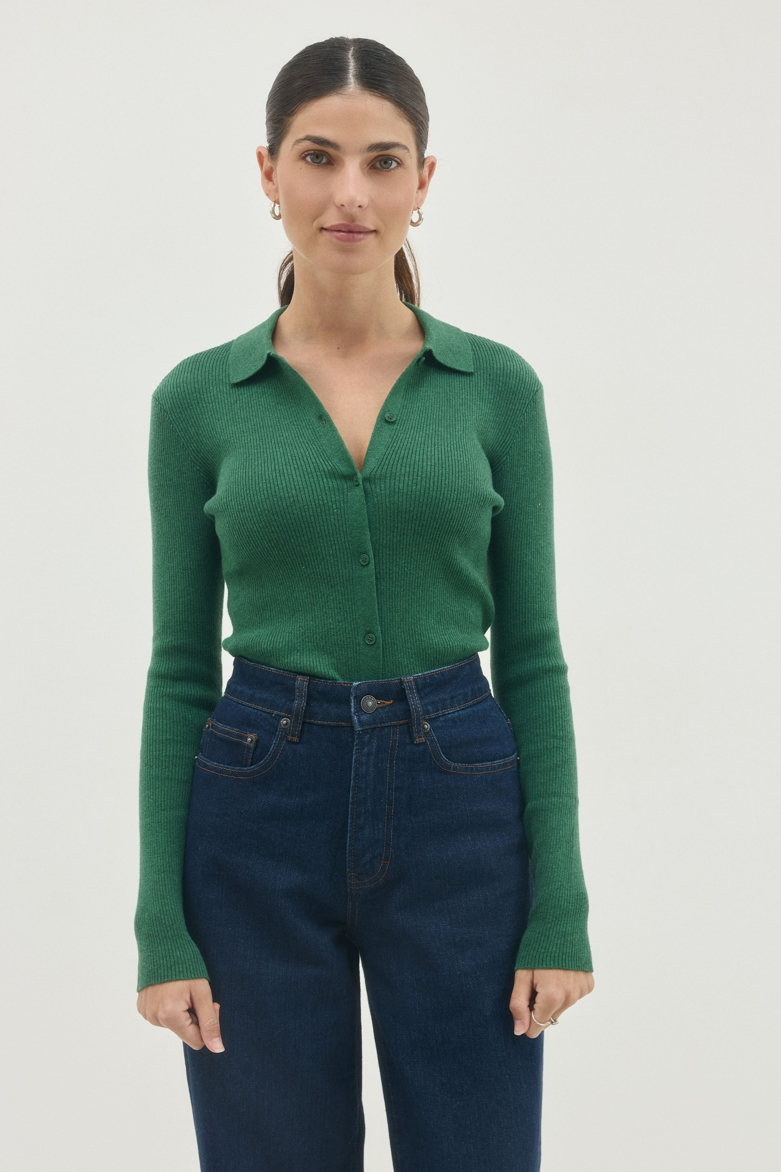 סריג בגזרה צמודה בסריגת ״ריב״ עם צאוורון וכפתורים לכל  אורכו
