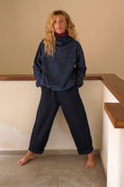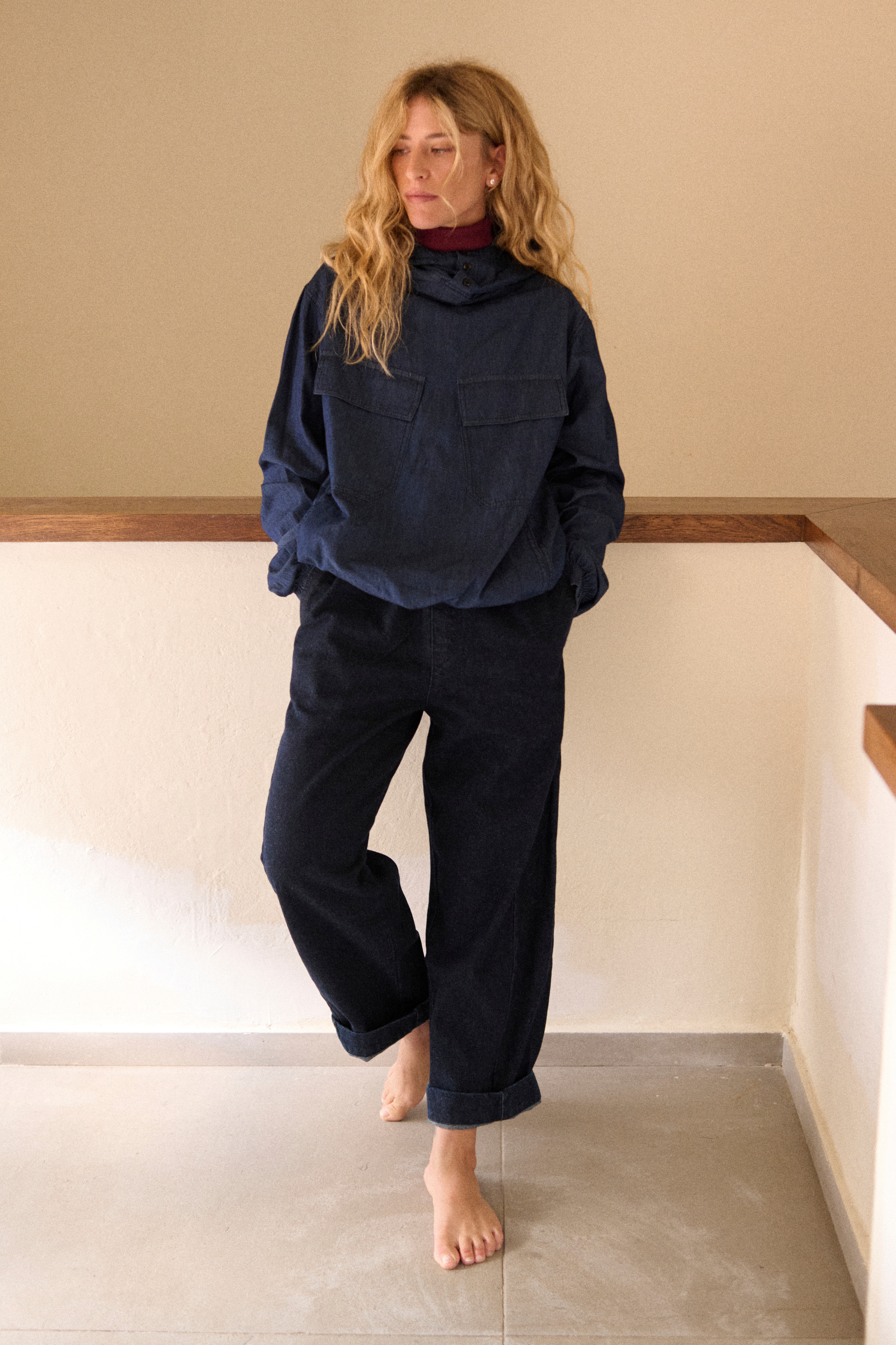 מכנסיים בגזרה משוחררת באורך קרופ, עם גומי מסביב למתניים, שני כיסי צד ושני כיסי אחוריים חיצוניים. בצד המכנסיים יש תוספת בד המקנה למכנסיים גזרת גזר