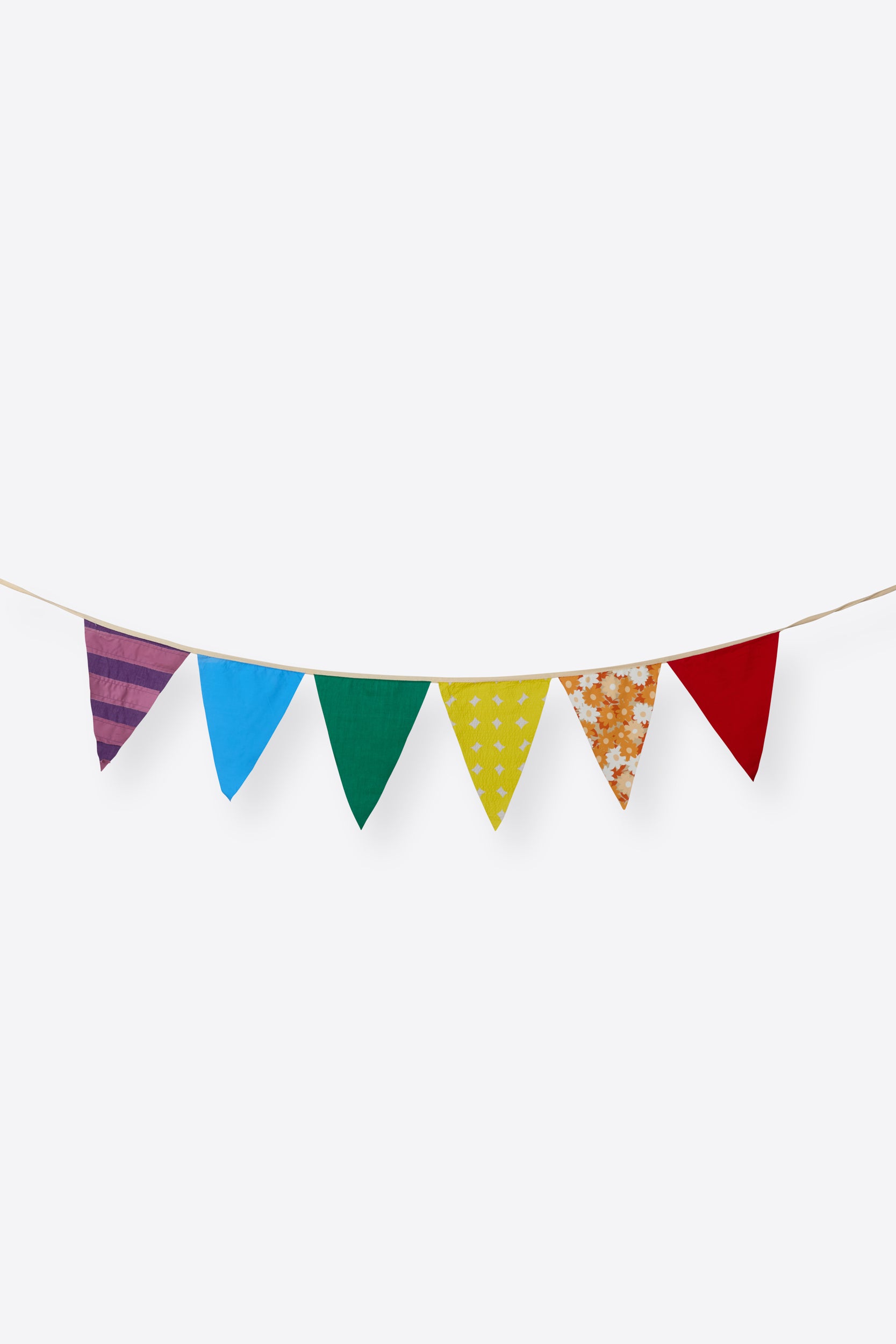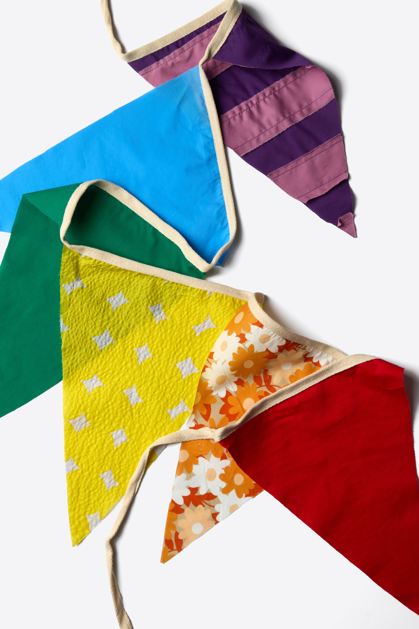 שרשרת דגלים תפורה על סרט כותנה באורך 3.5 מטר בקירוב.