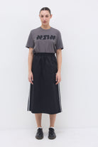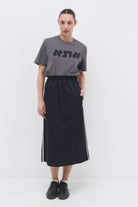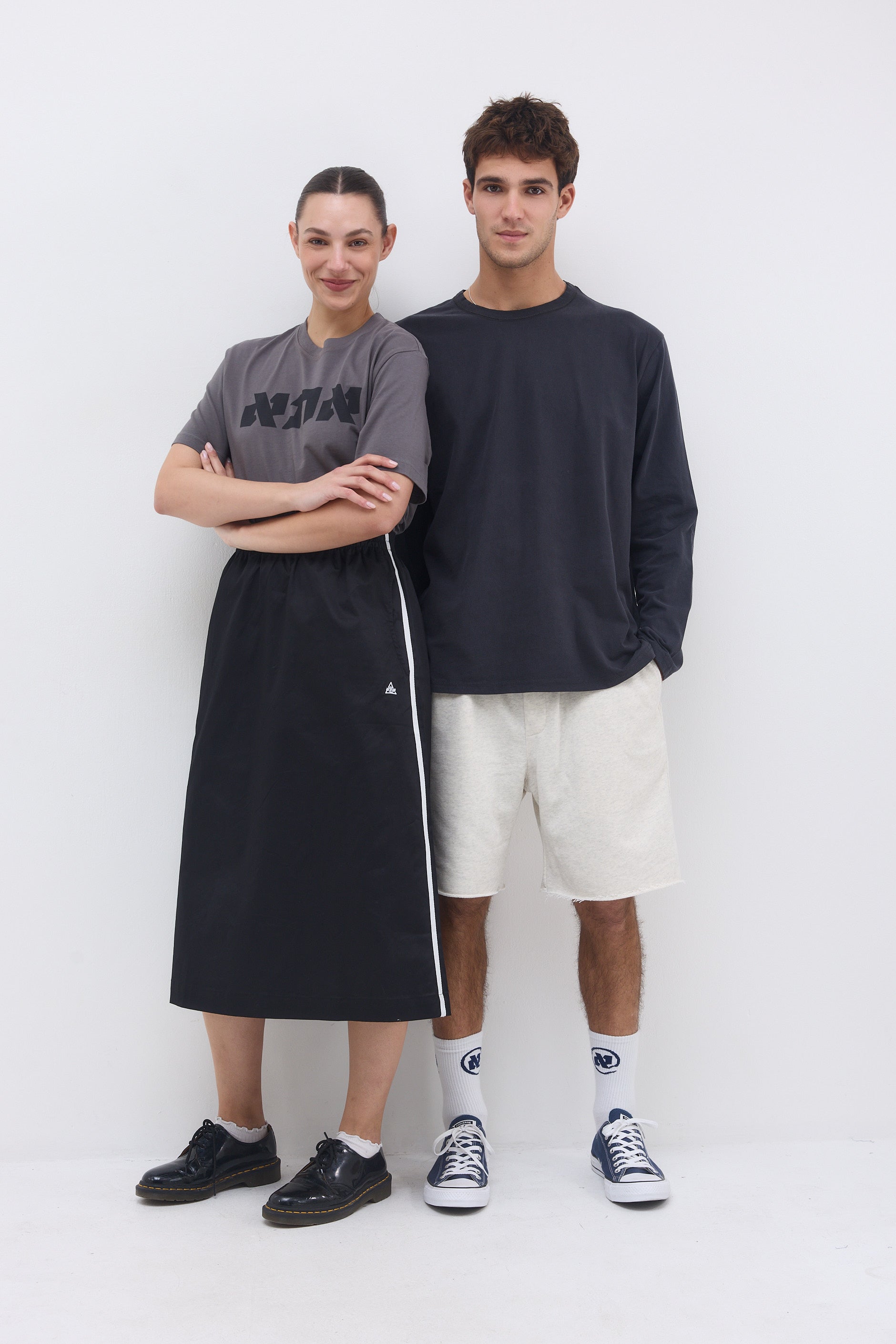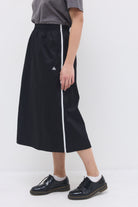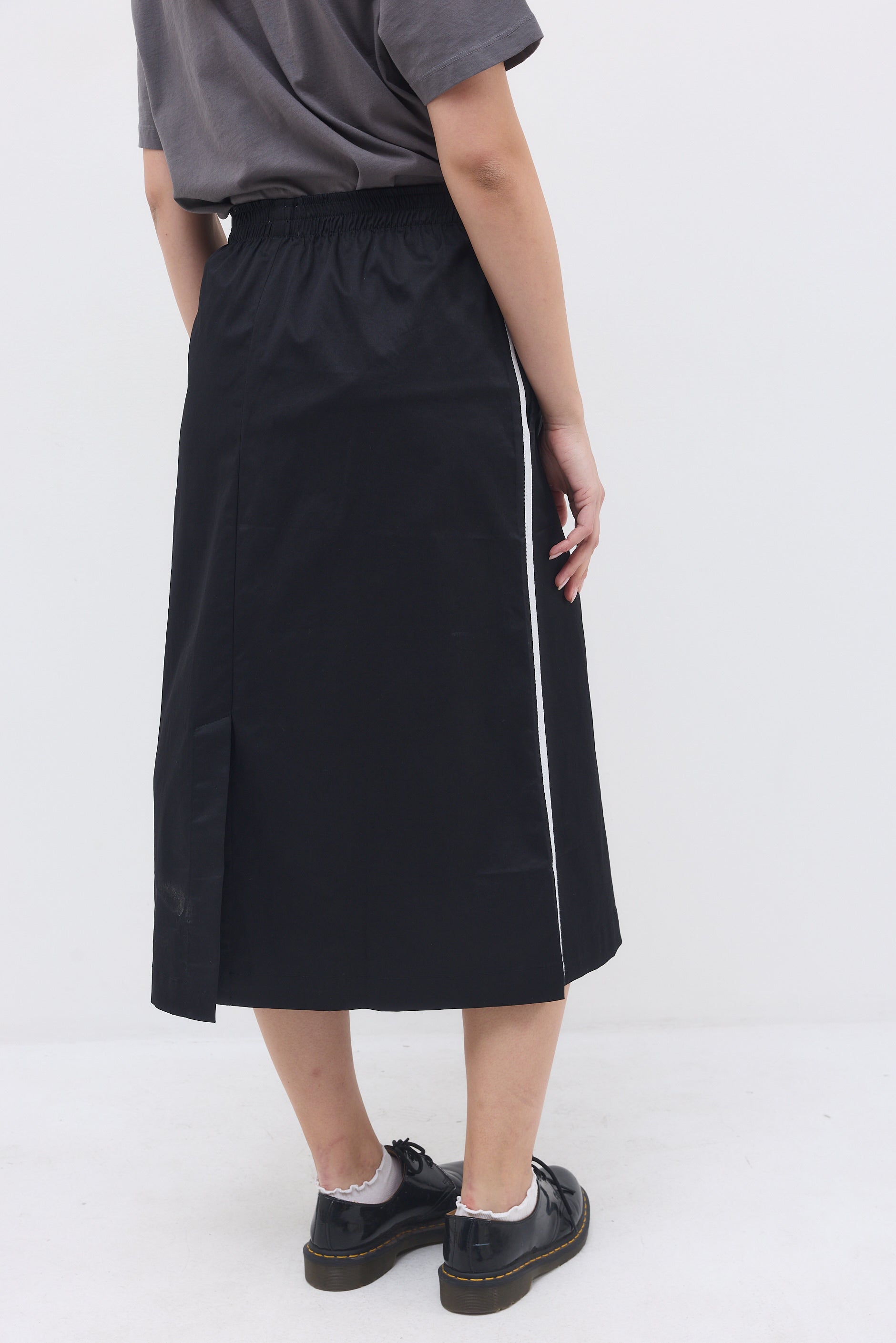 לחצאית יש שני פסים שצבעם לבן בתפר הצד, שני כיסים ורקמת לוגו