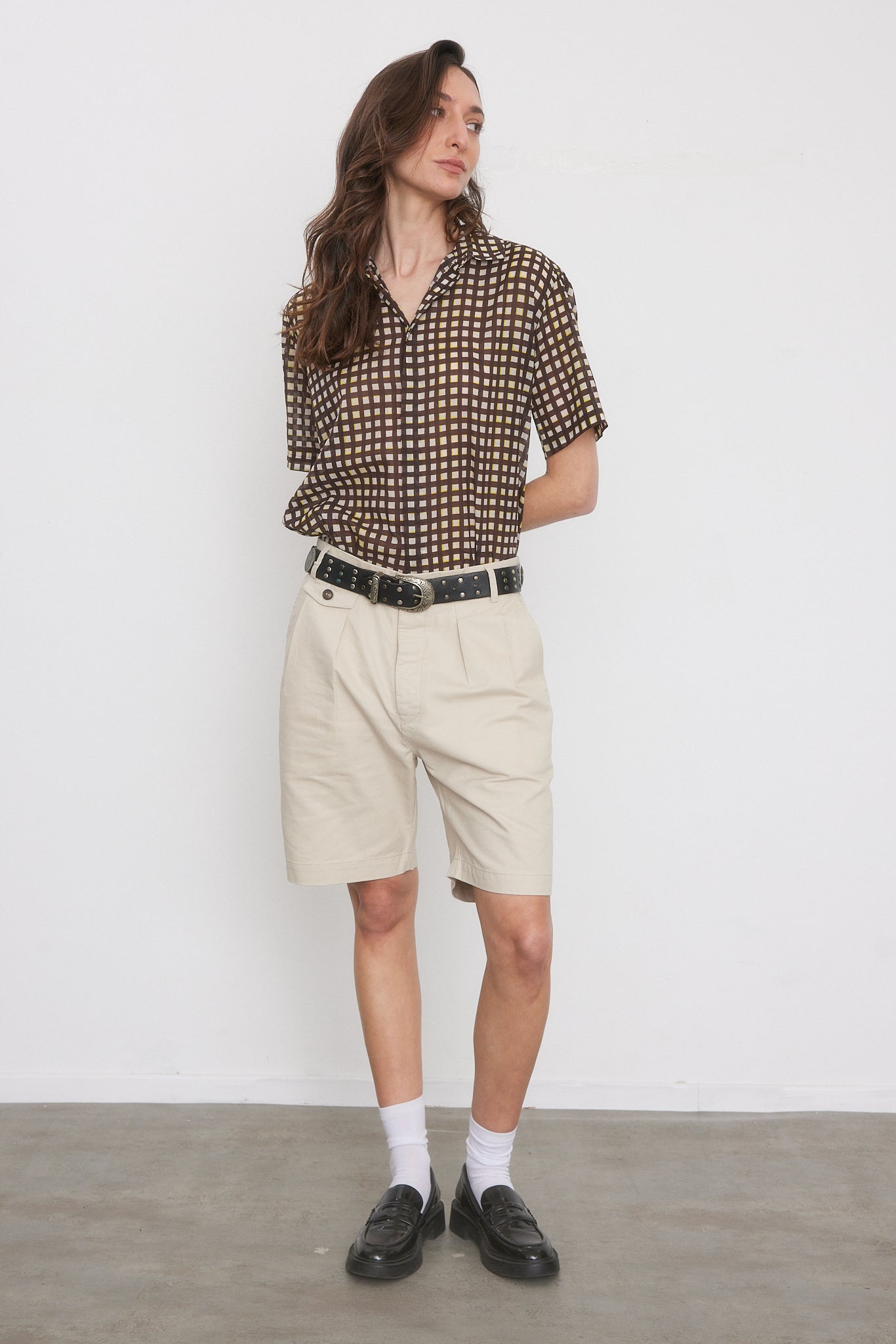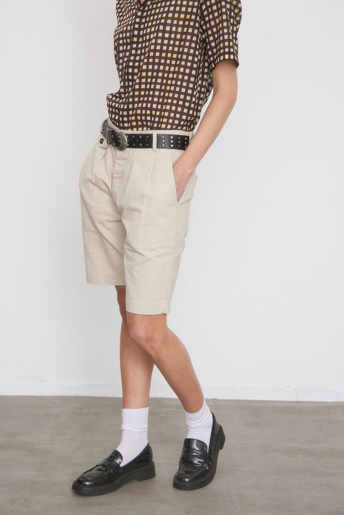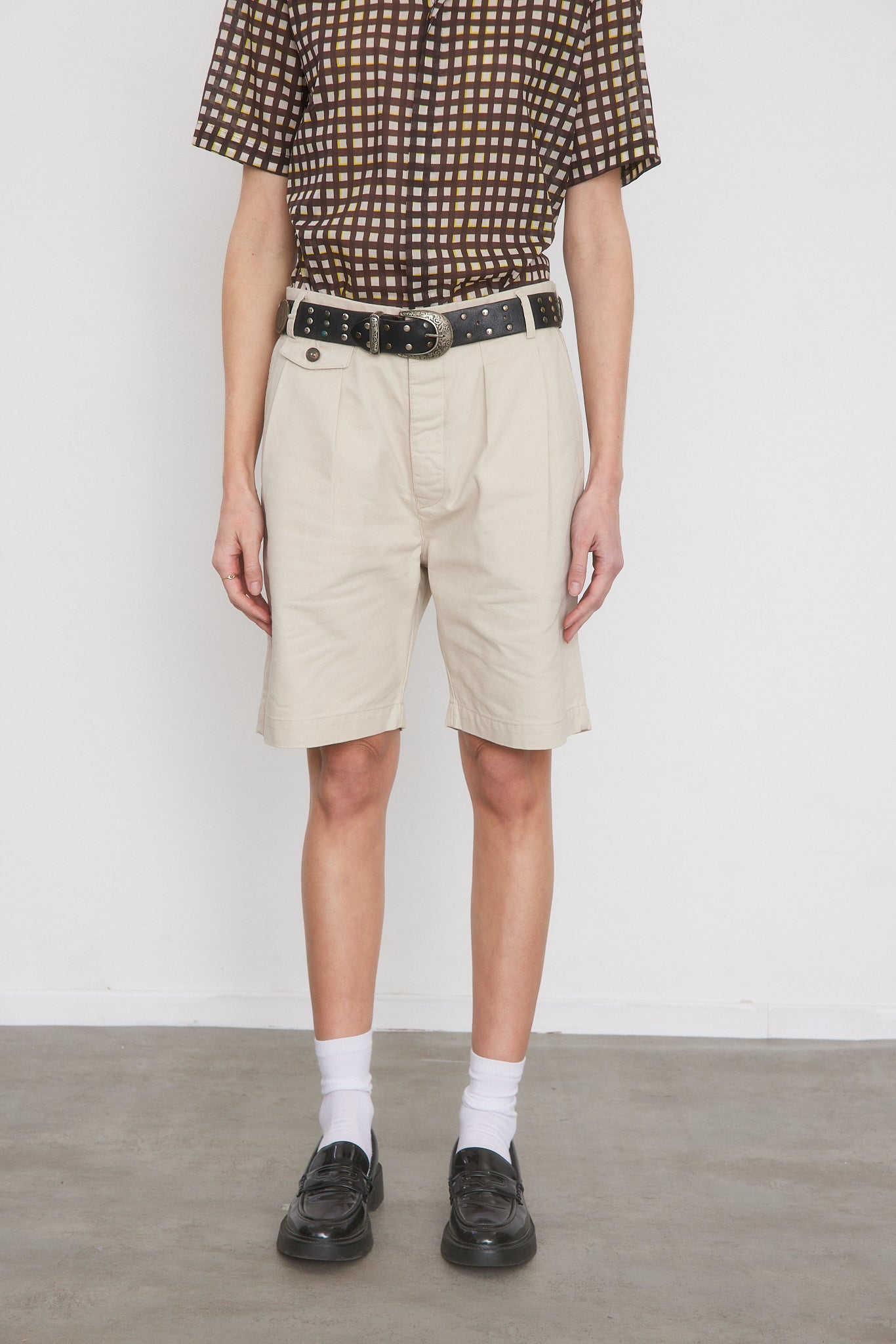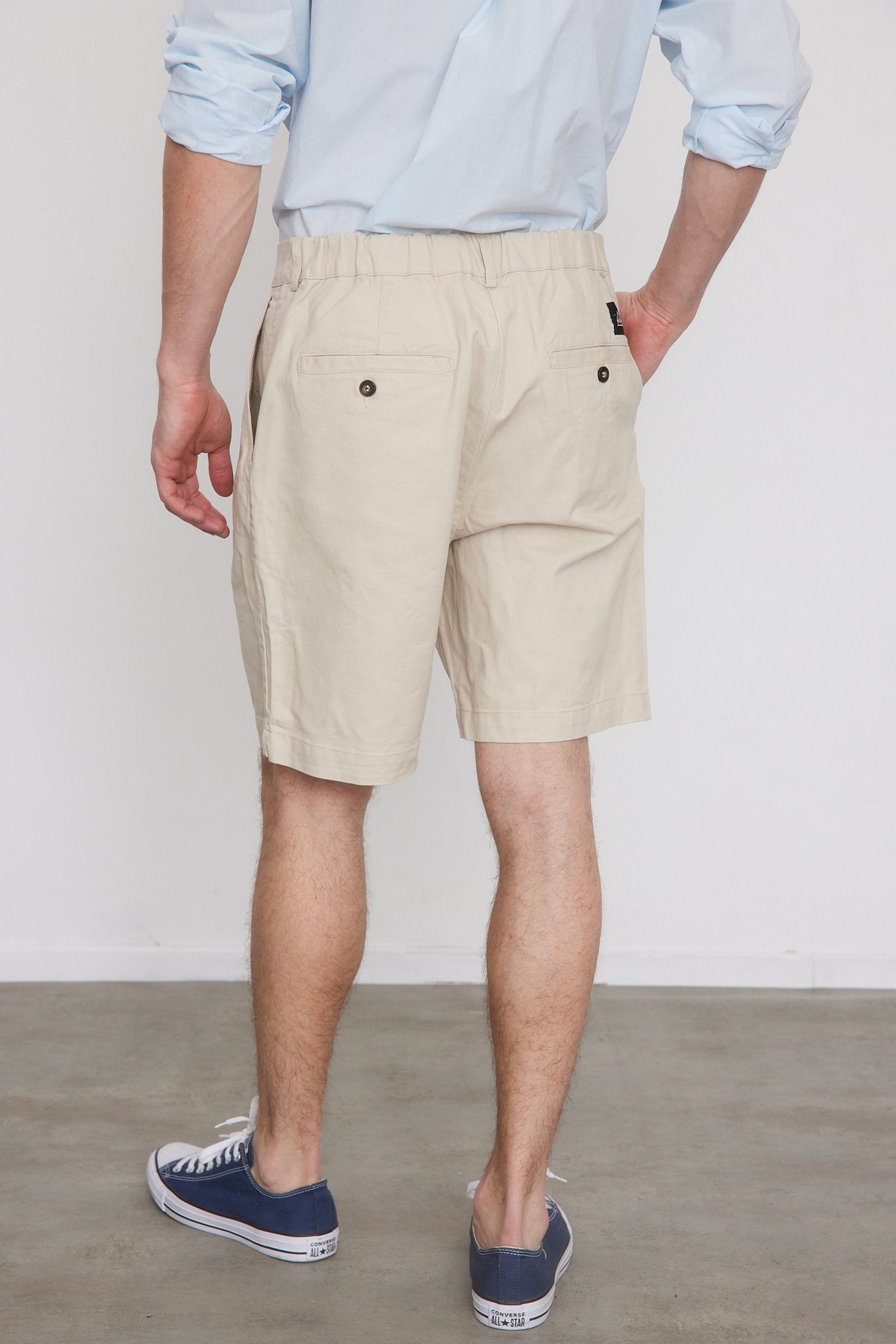 מכנסיים קצרים בצבע אבן, פחם, נייבי וחאקי. מותן גבוה עם רצועה אלסטית מאחור, כפתורים בחזית, כיסים קדמיים ואחוריים, קפלים קדמיים, סגירת רוכסן וכפתור.