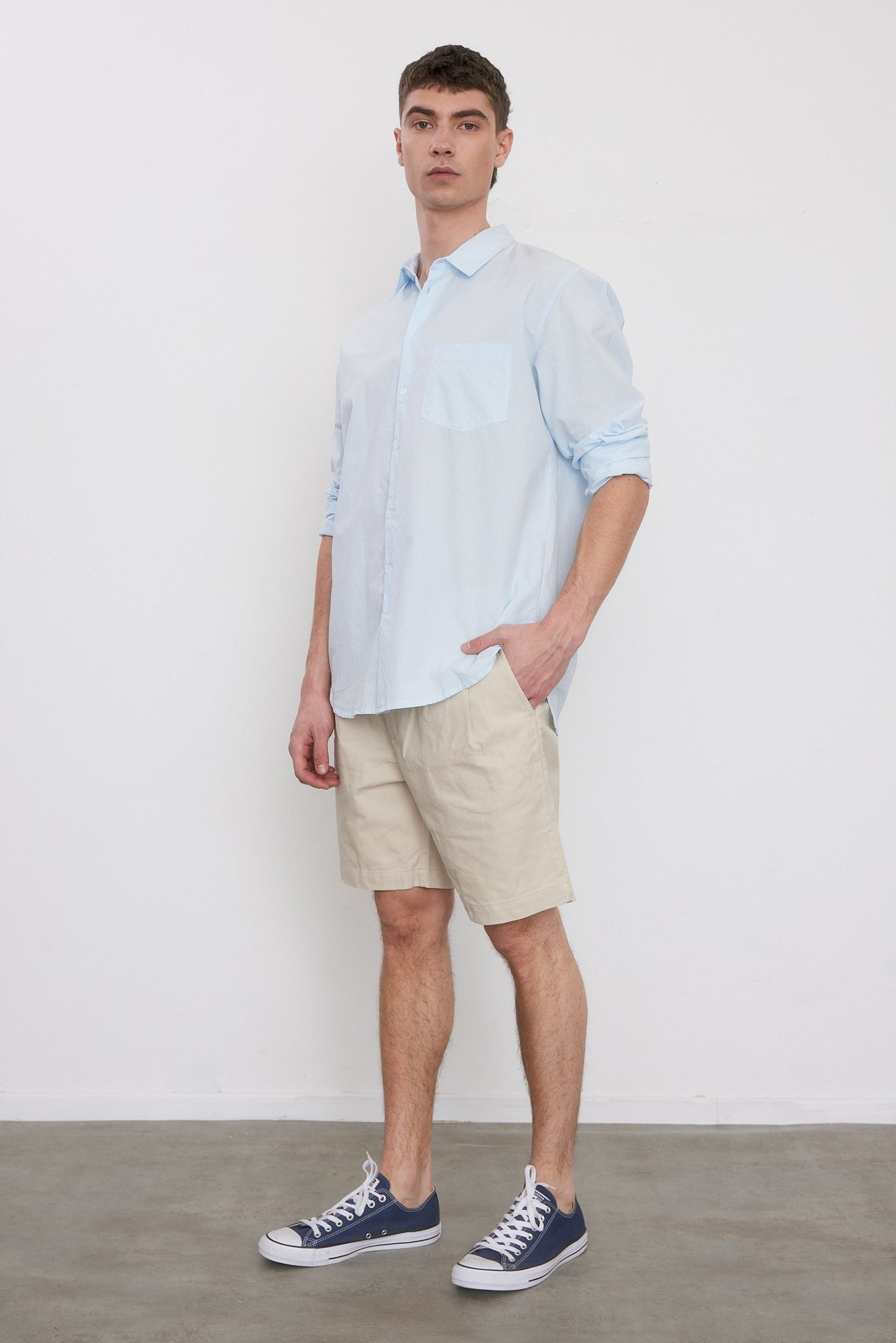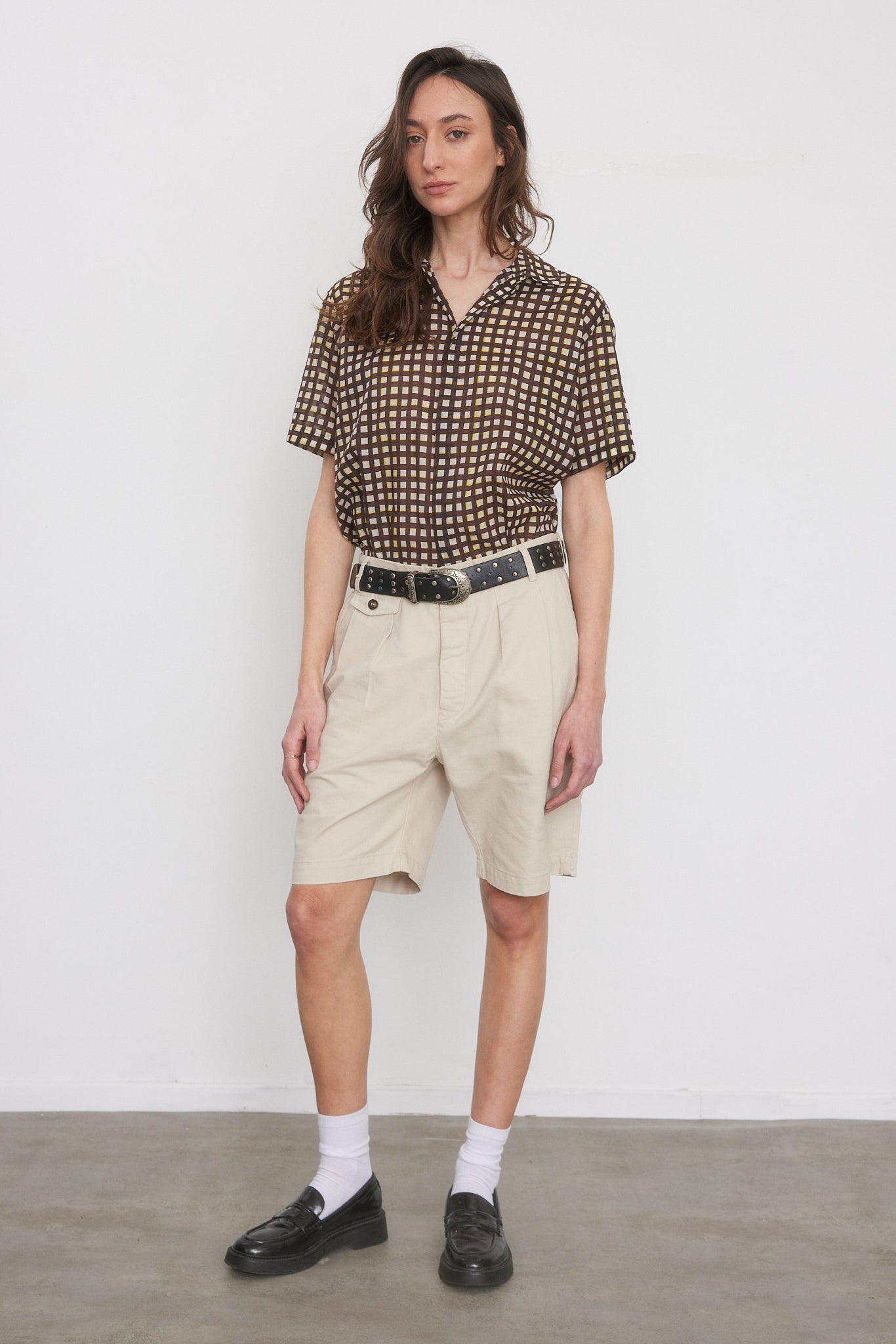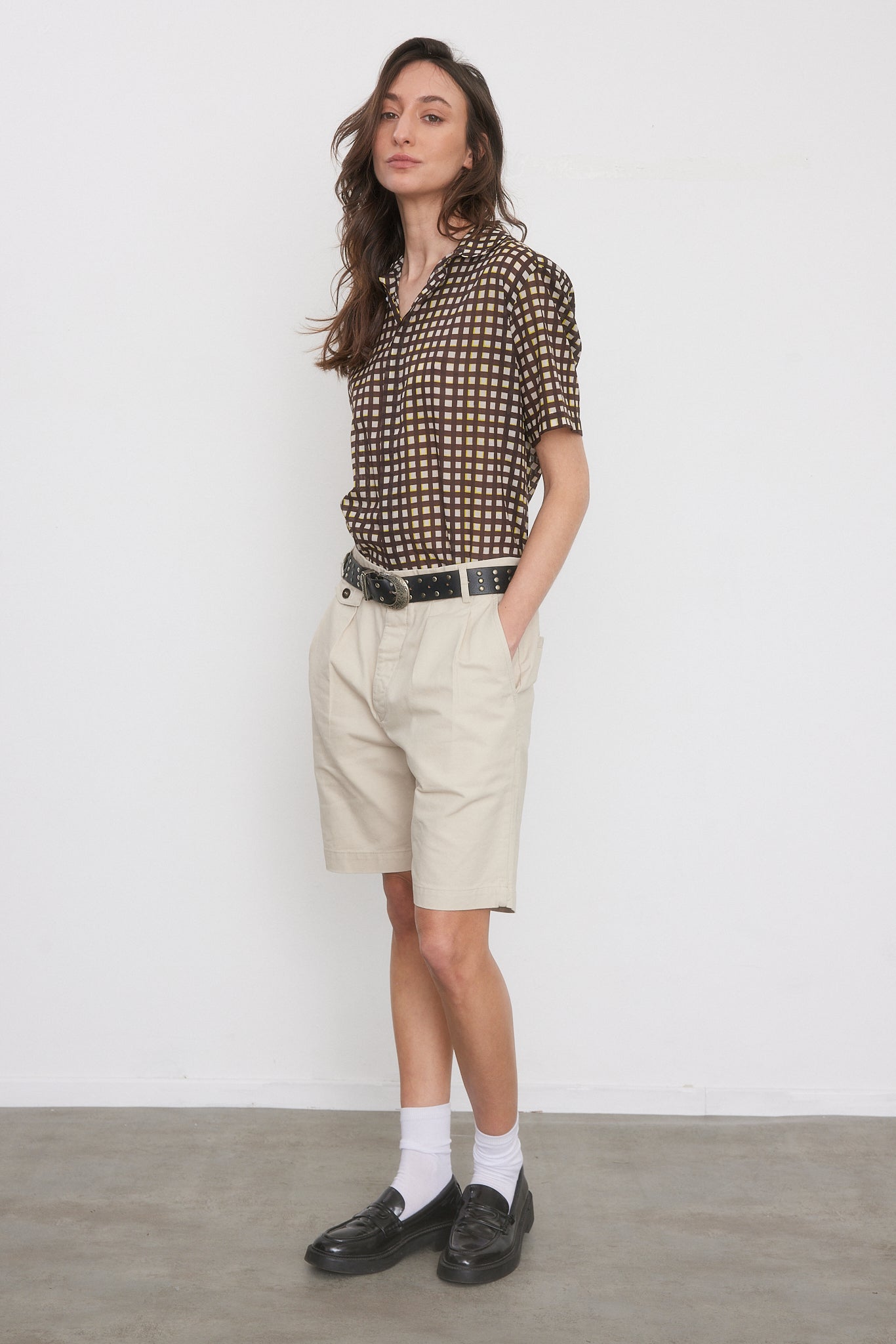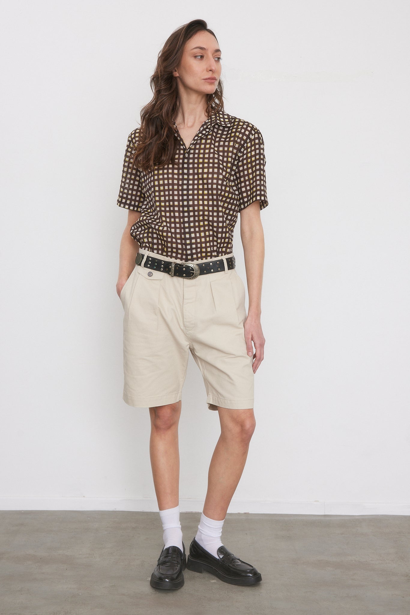מכנסיים קצרים בצבע אבן, פחם, נייבי וחאקי. מותן גבוה עם רצועה אלסטית מאחור, כפתורים בחזית, כיסים קדמיים ואחוריים, קפלים קדמיים, סגירת רוכסן וכפתור.