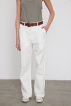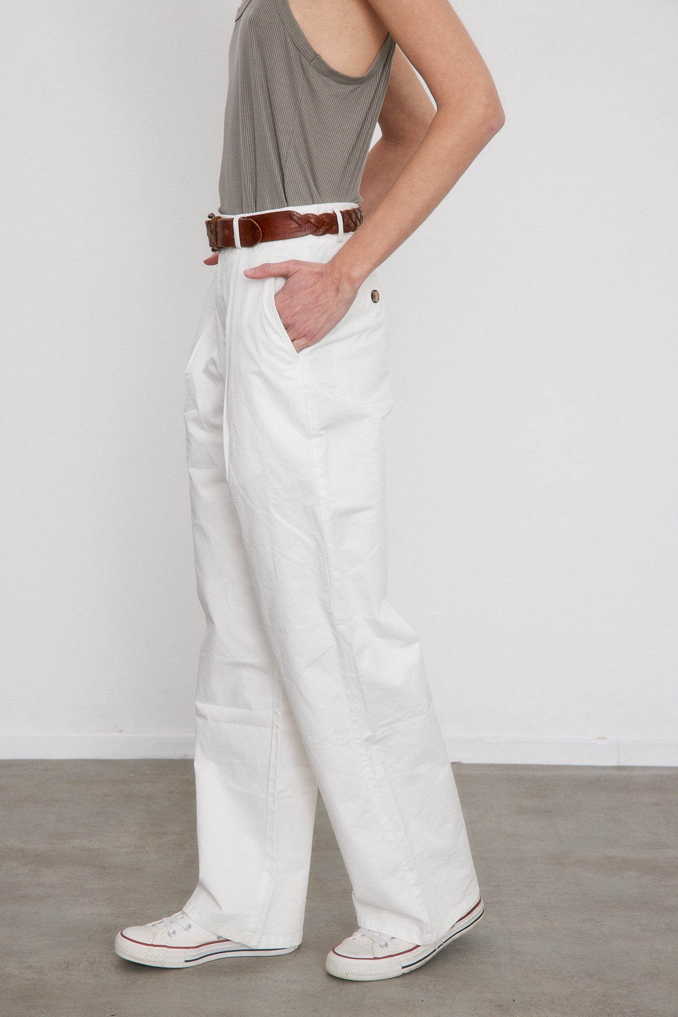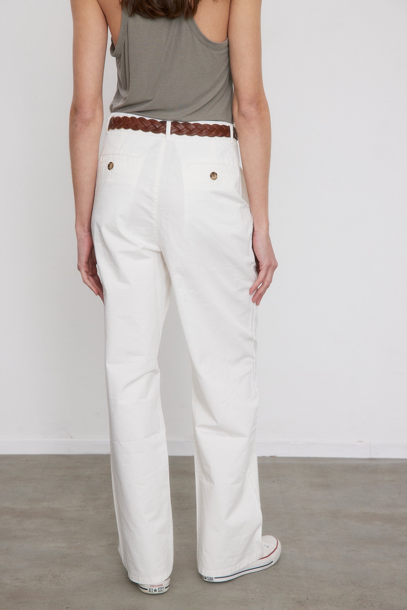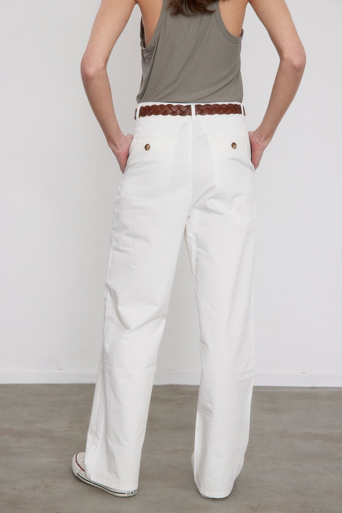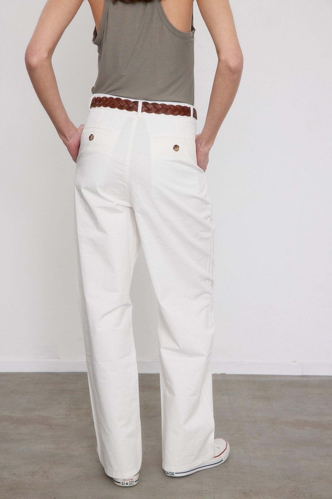 חגורת המכנסיים נרכסת ברוכסן, בכפתור חיצוני ואחד פנימי