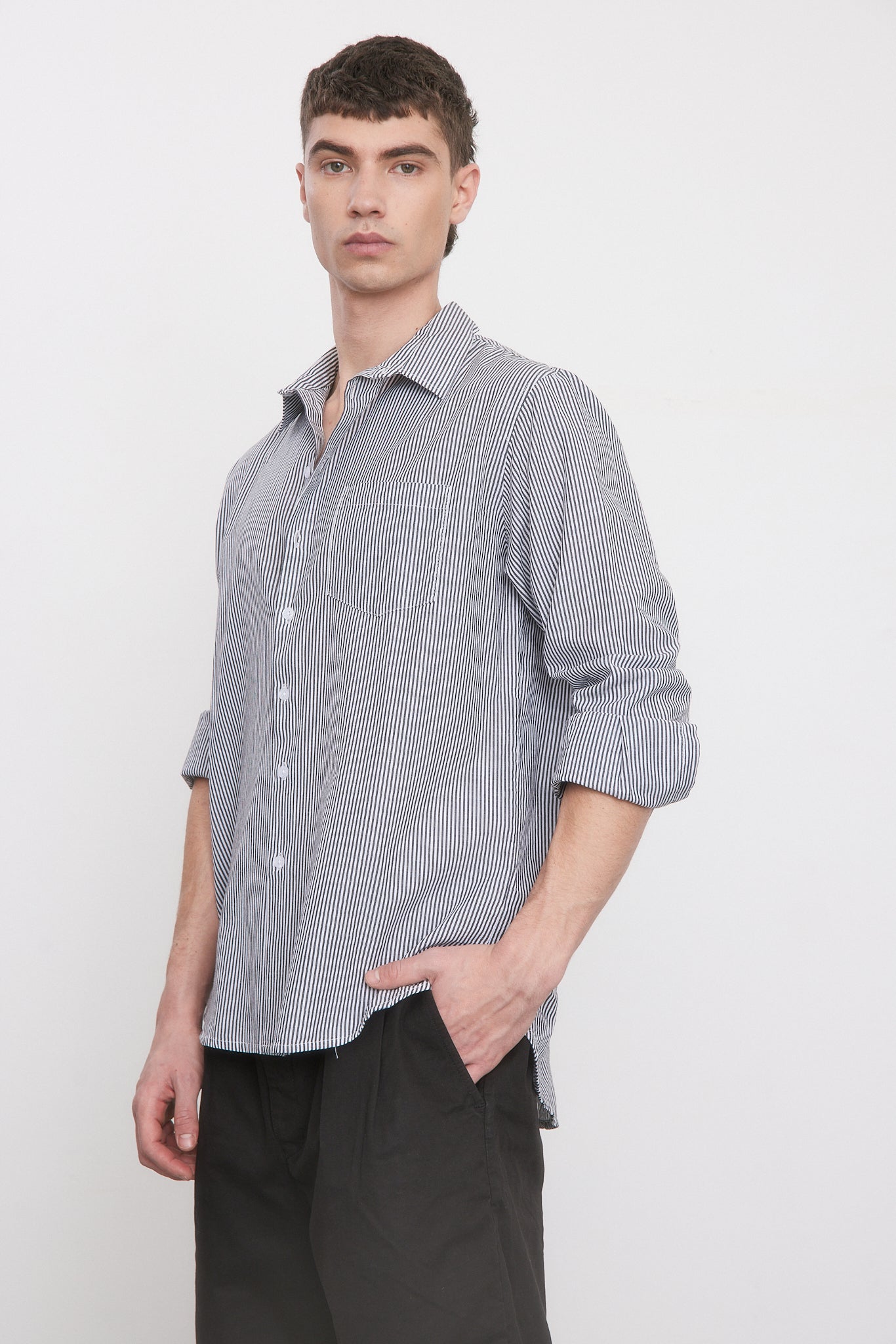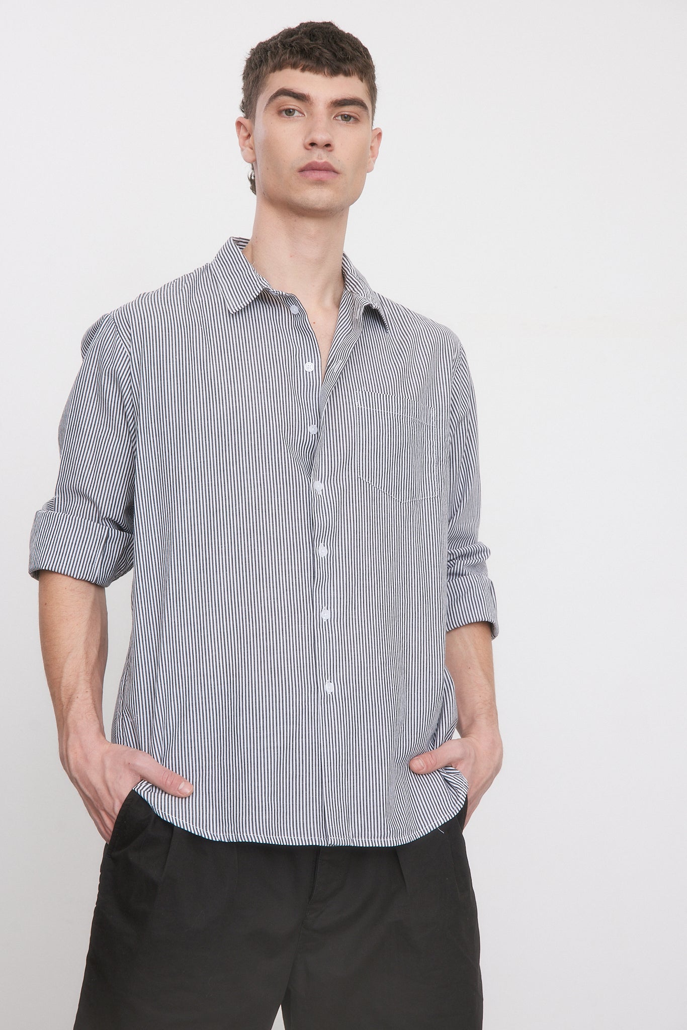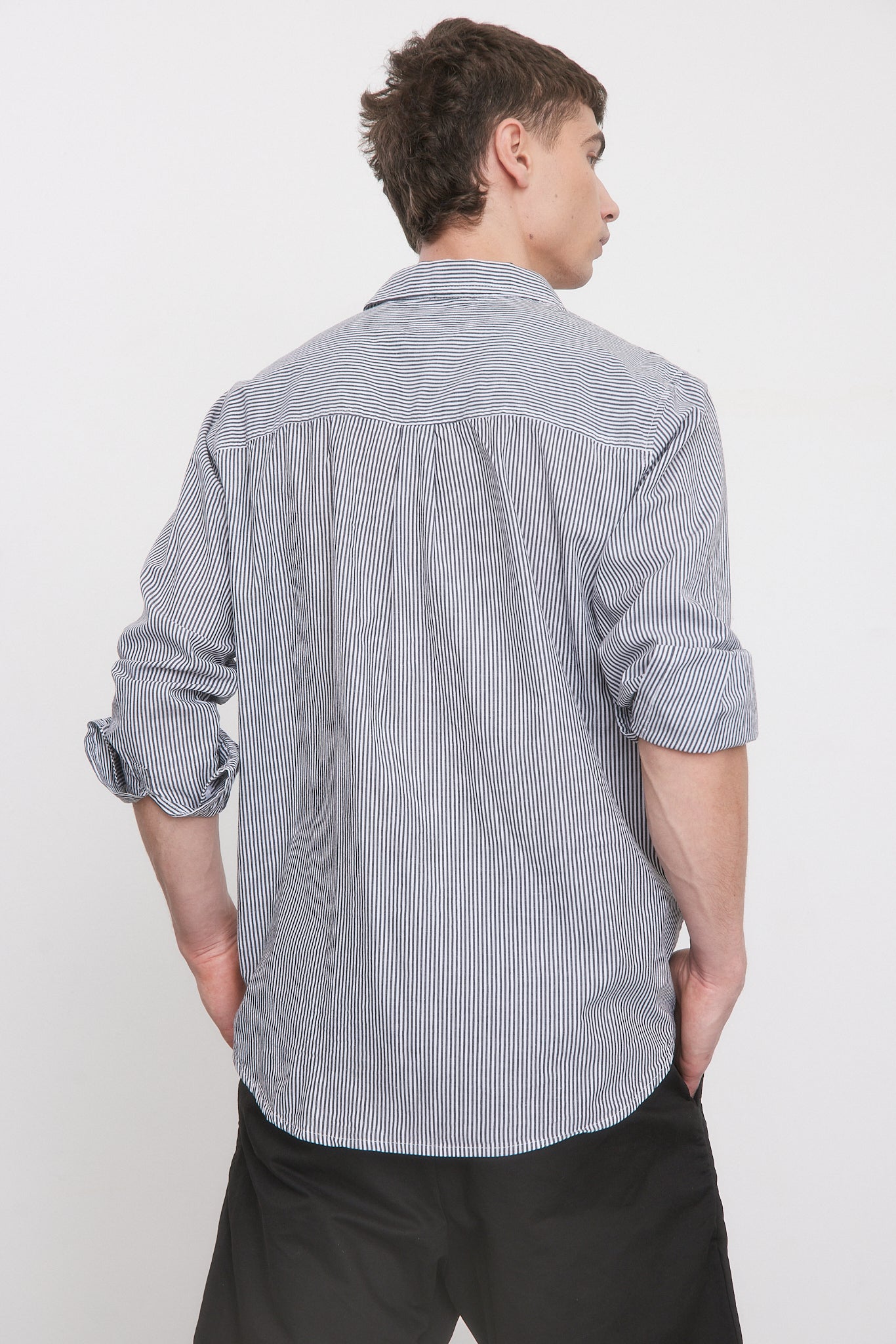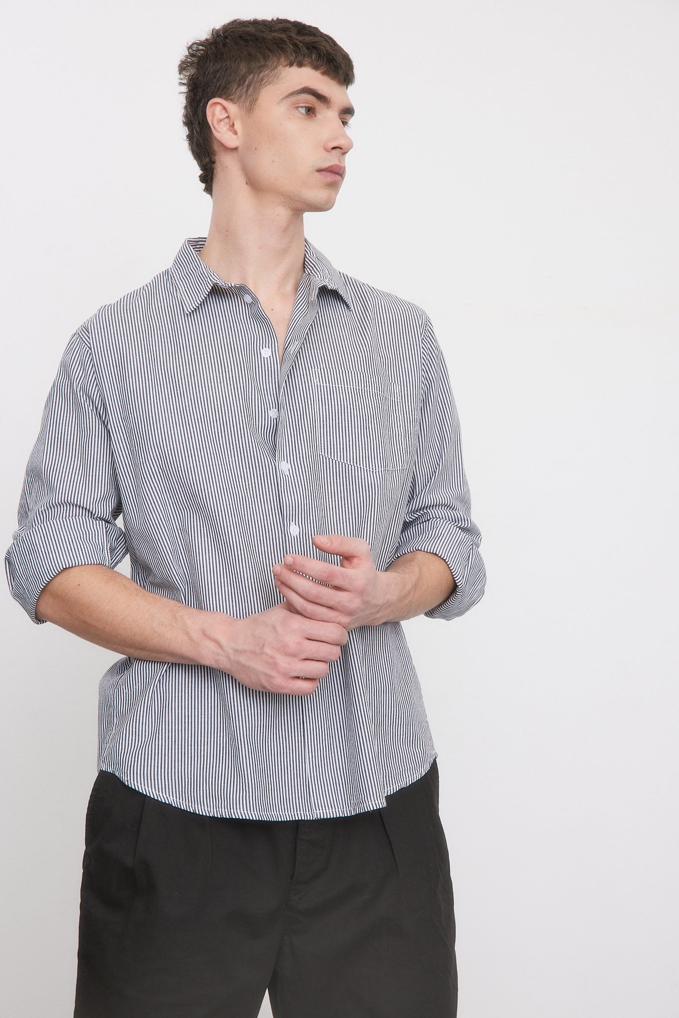 - חולצה בגזרה צמודה עם שרוולים ארוכים וצווארון גברי.