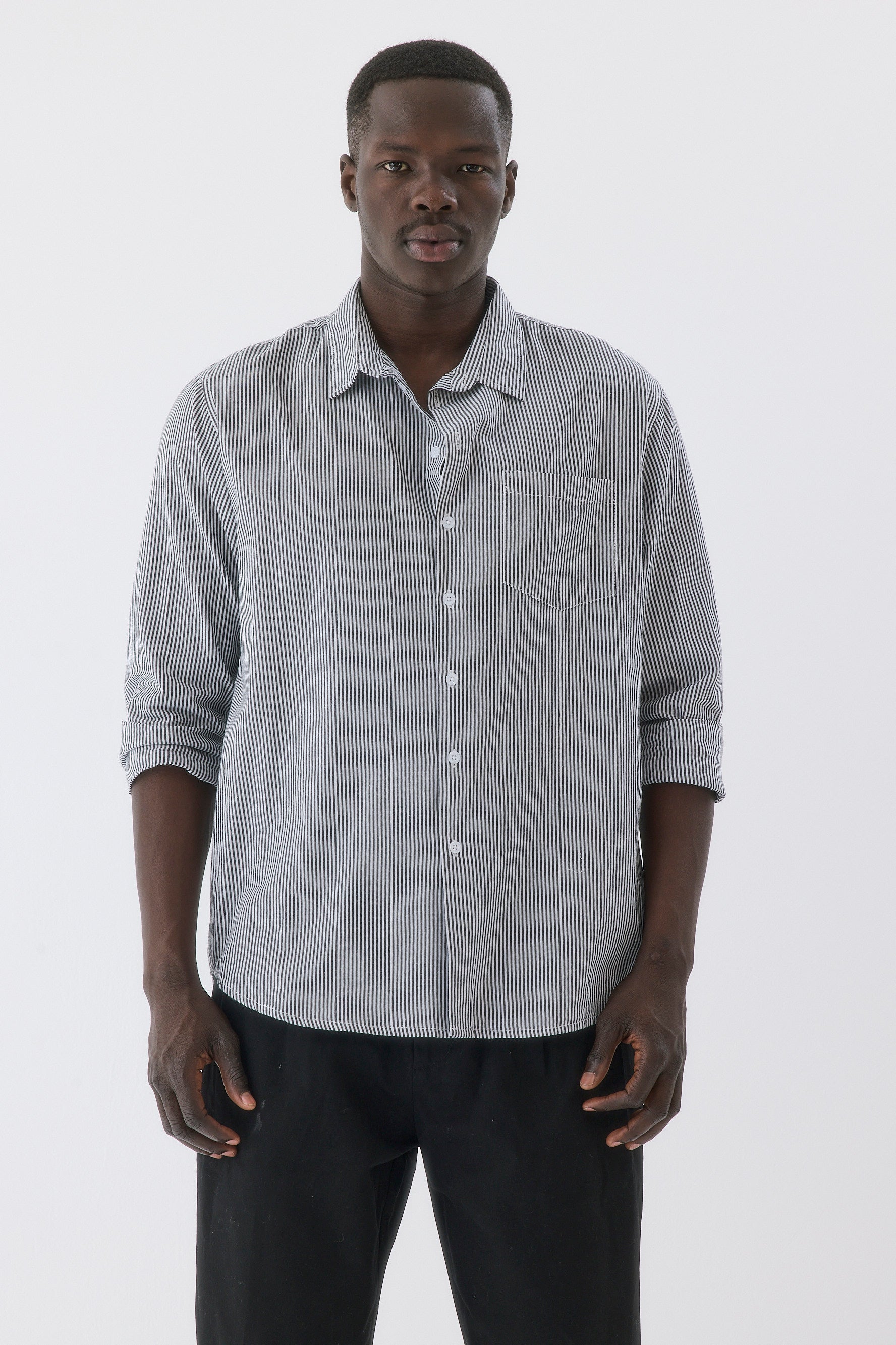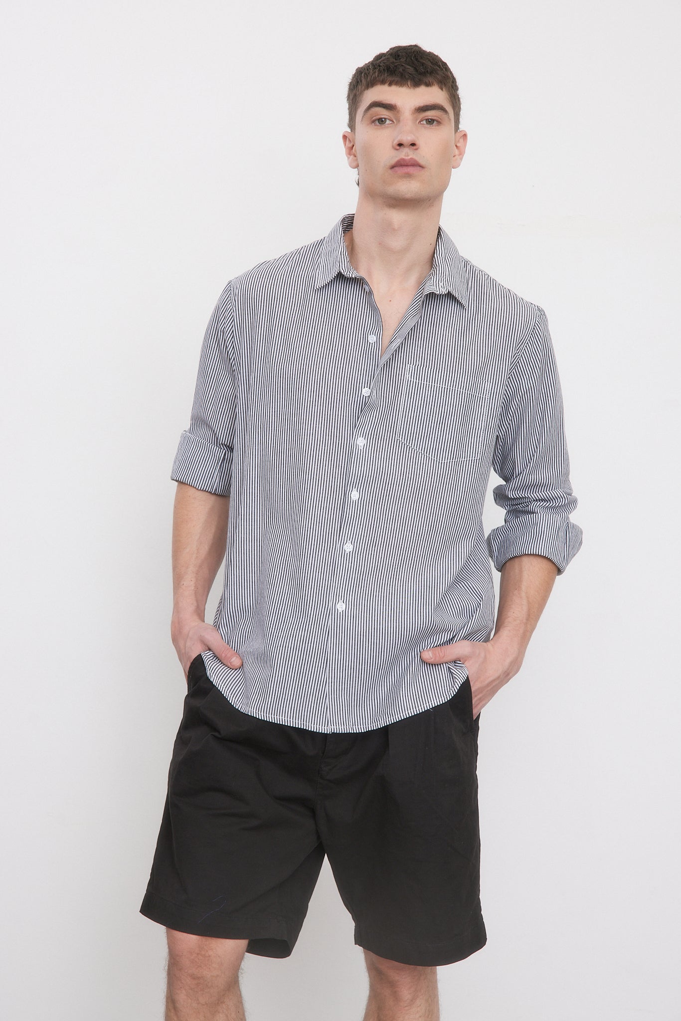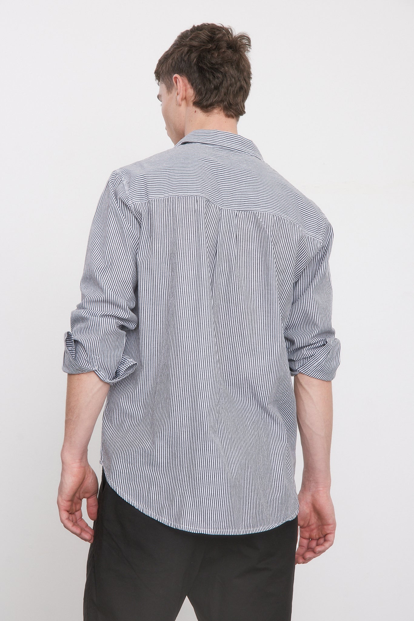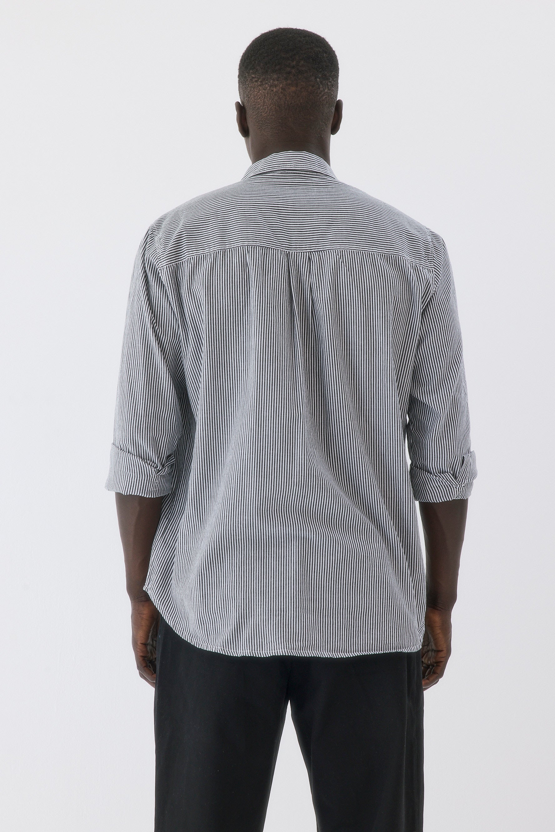 - חולצה בגזרה צמודה עם שרוולים ארוכים וצווארון גברי.