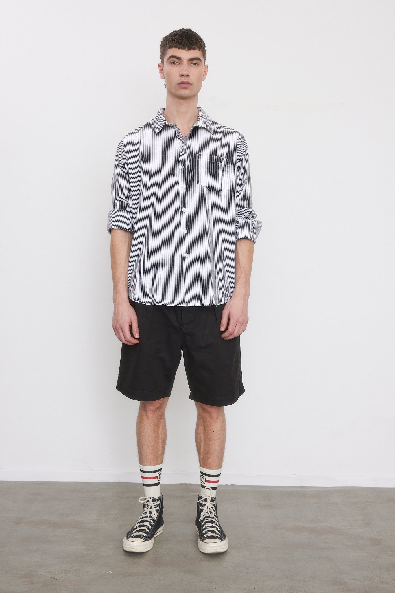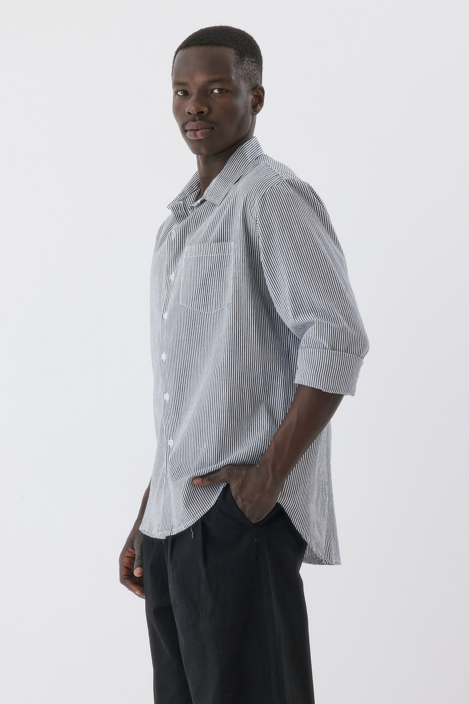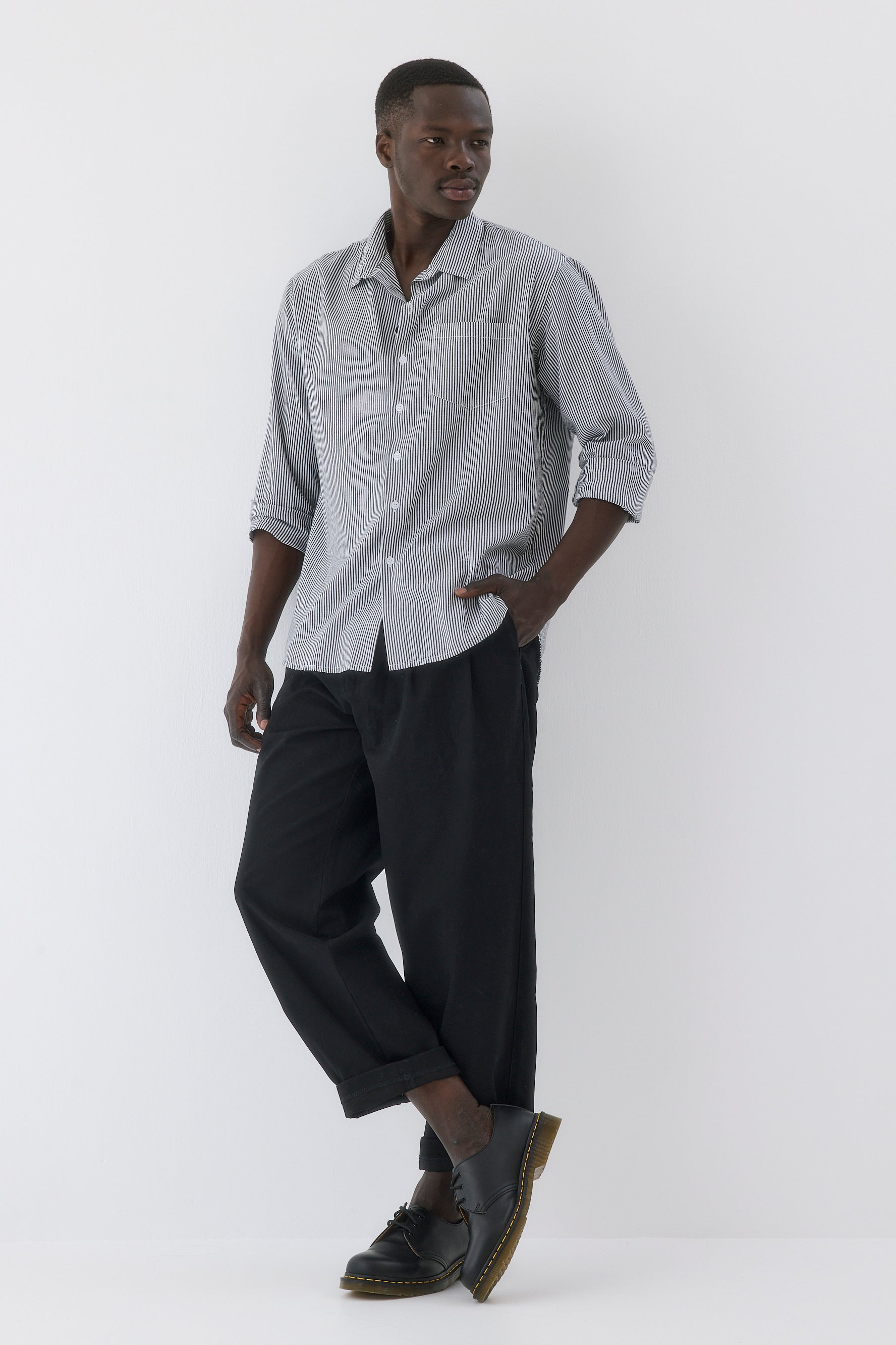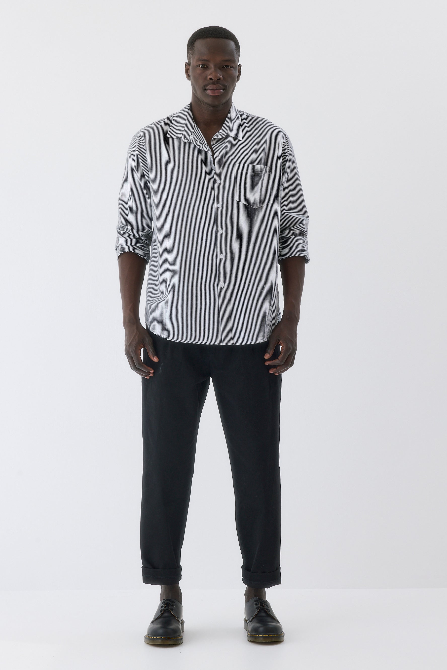 - חולצה בגזרה צמודה עם שרוולים ארוכים וצווארון גברי.