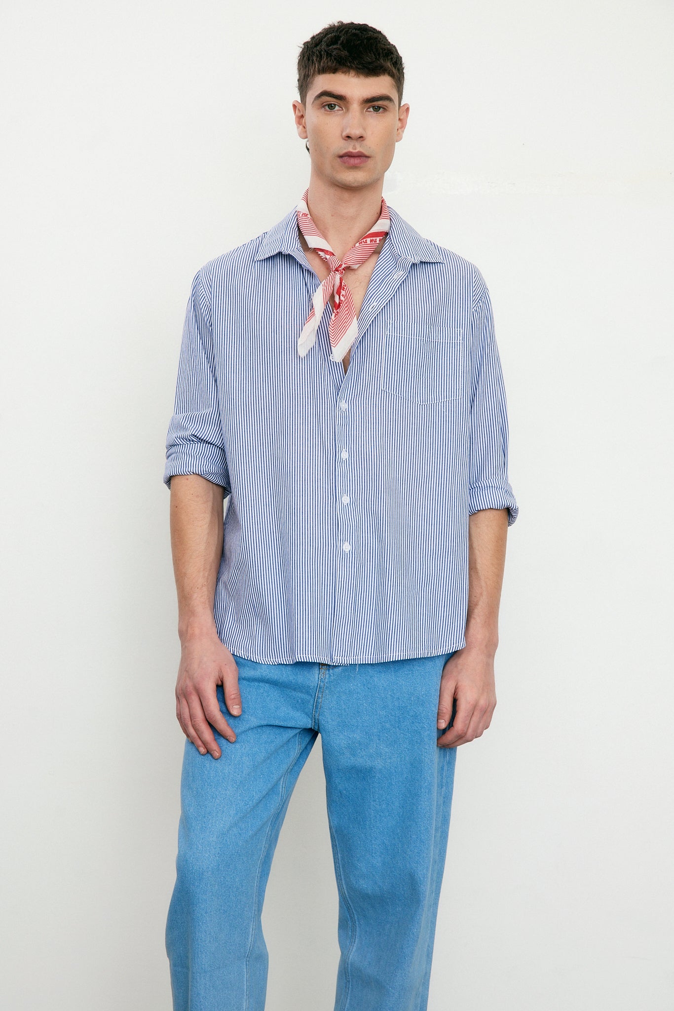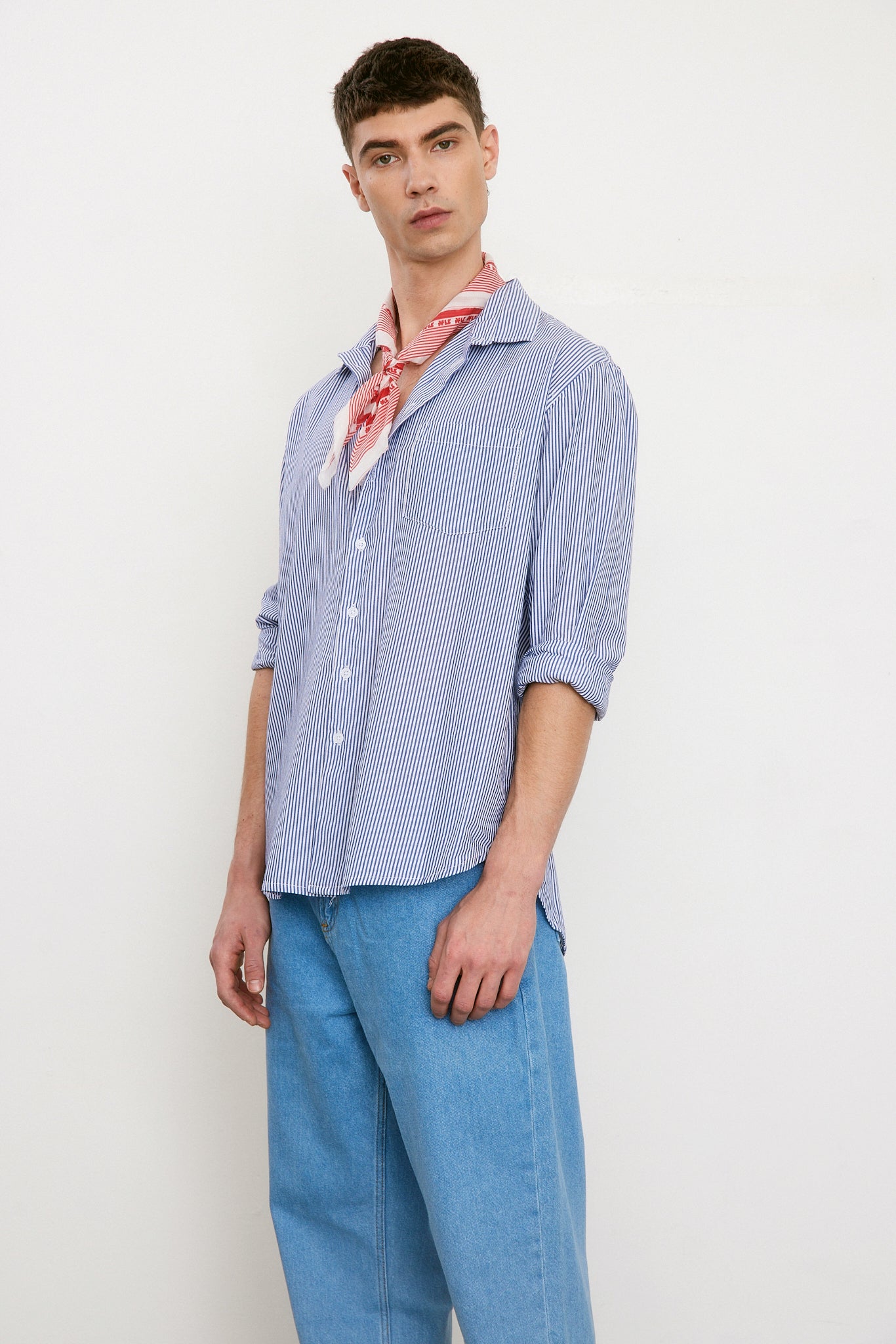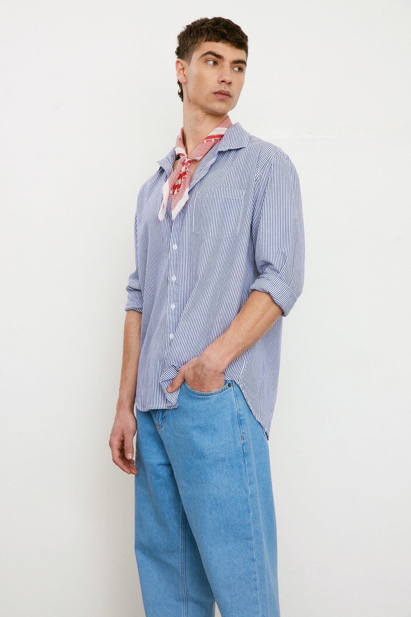 - חולצה בגזרה צמודה עם שרוולים ארוכים וצווארון גברי.
