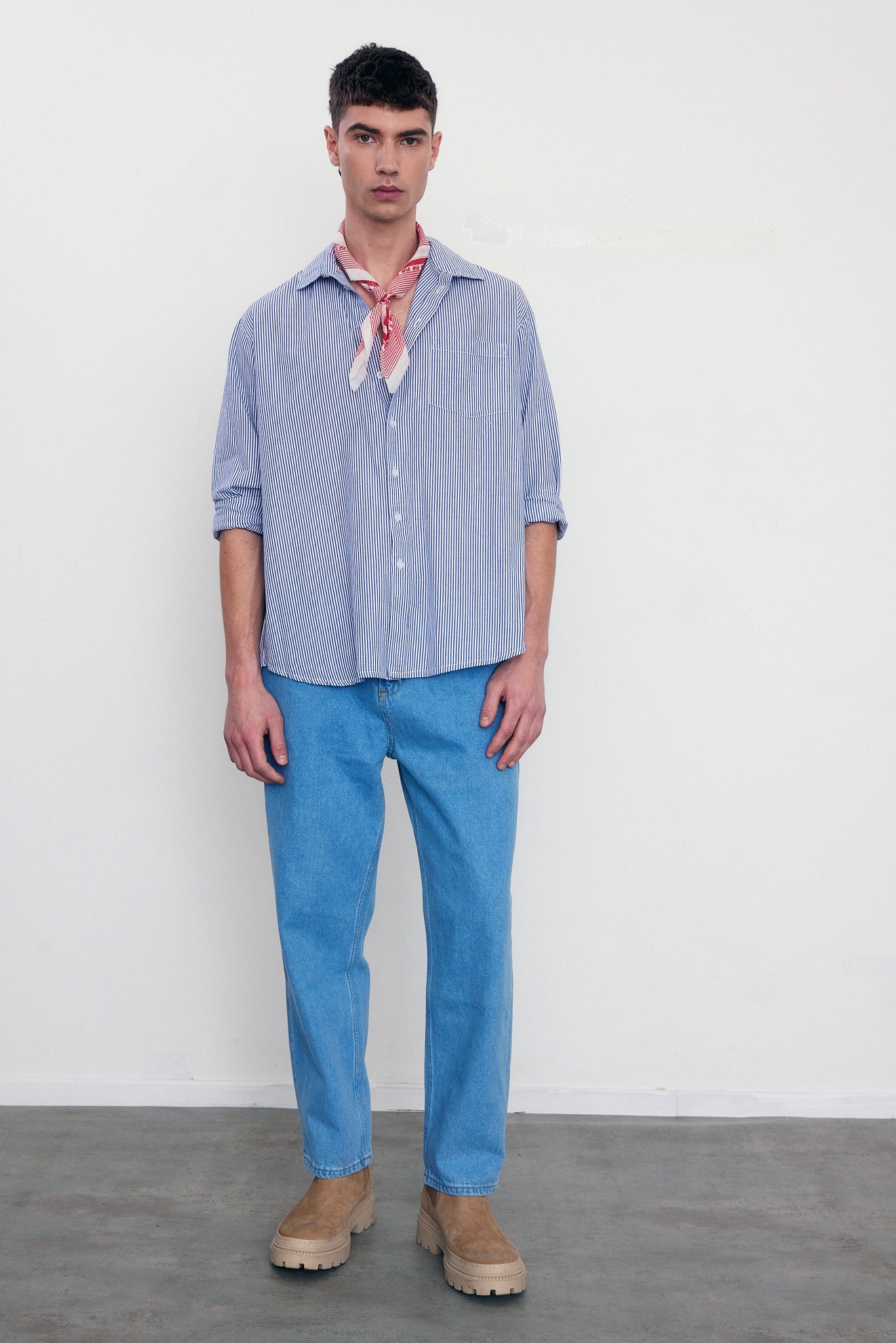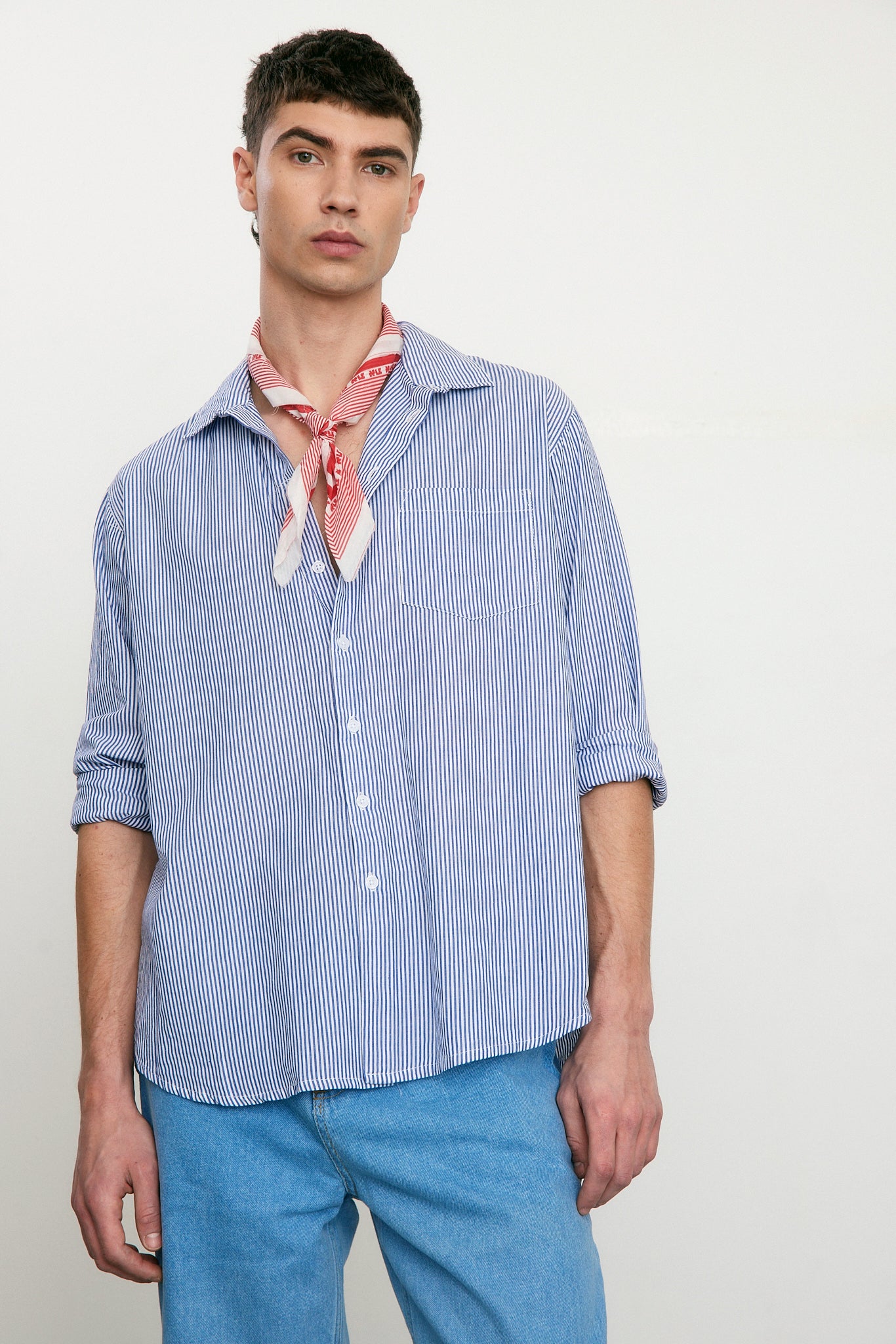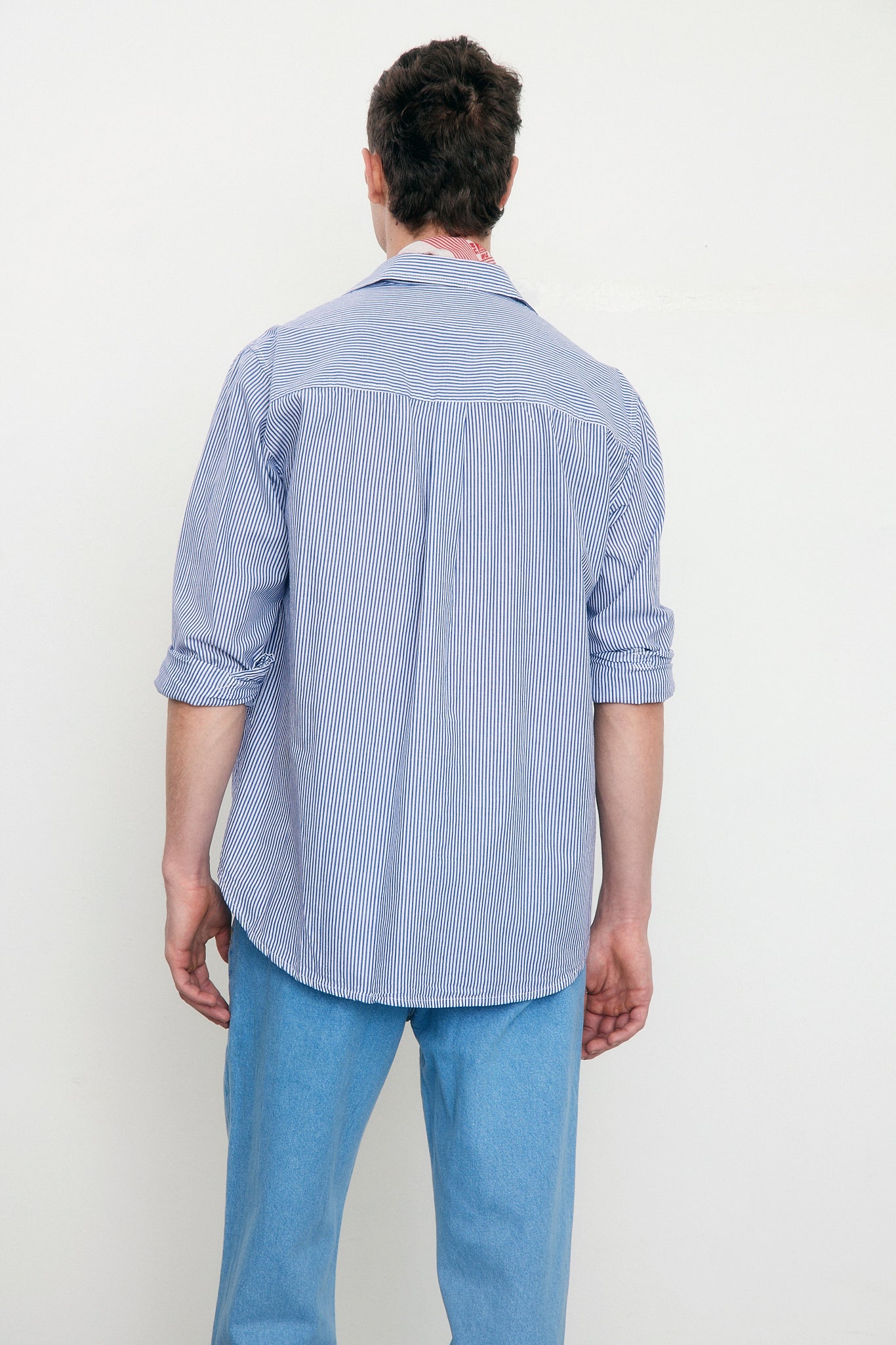 - חולצה בגזרה צמודה עם שרוולים ארוכים וצווארון גברי.