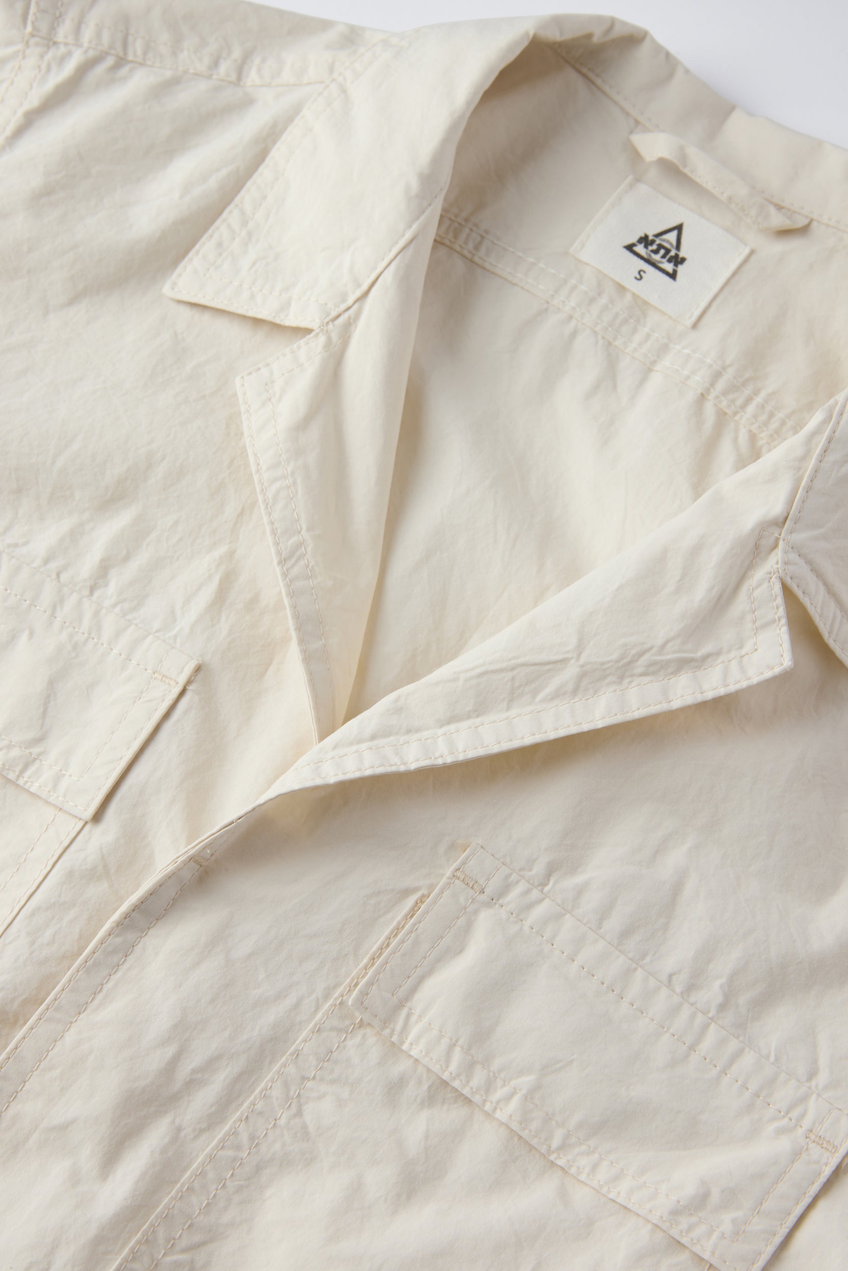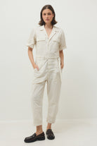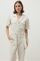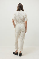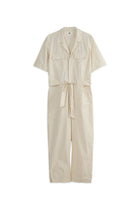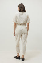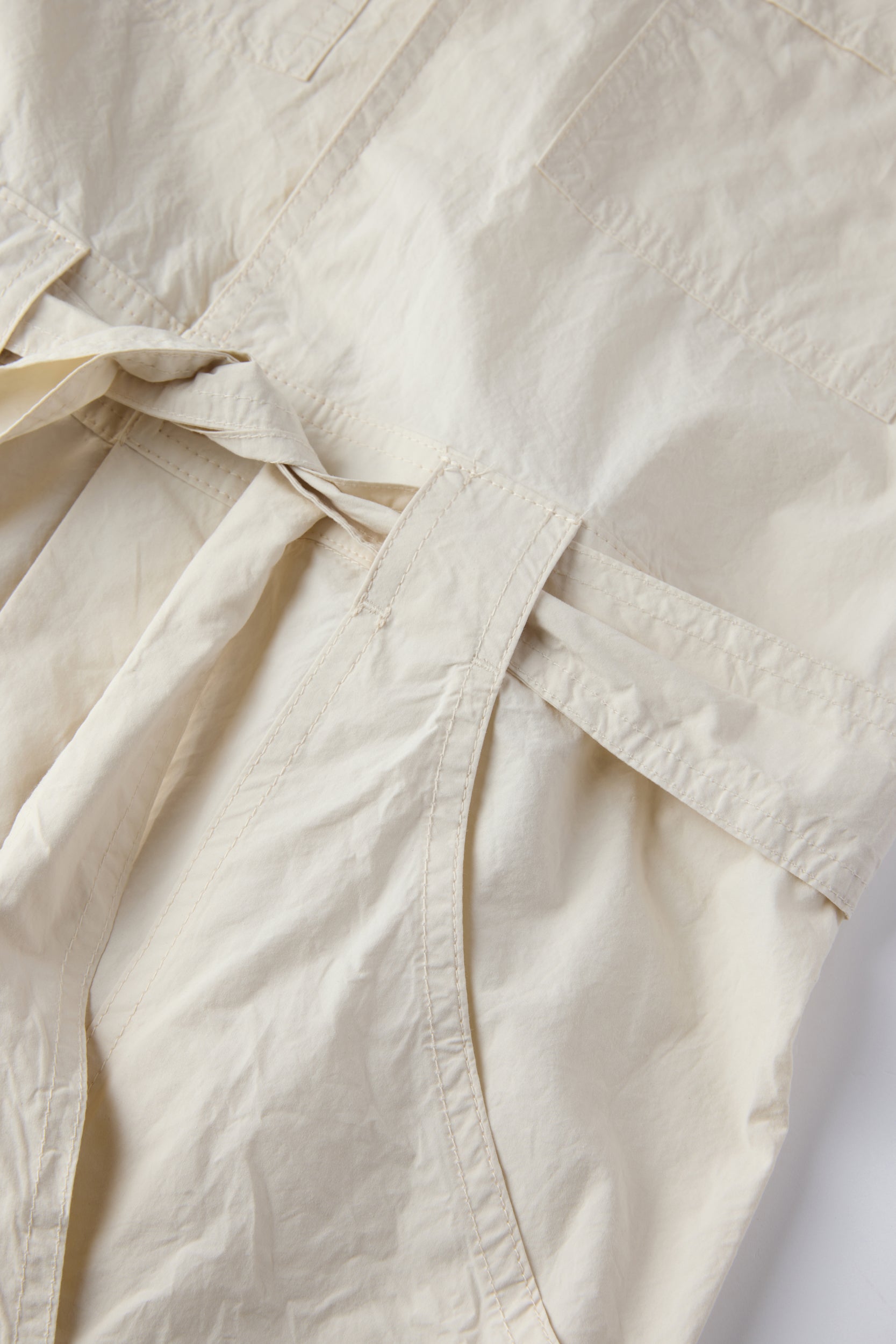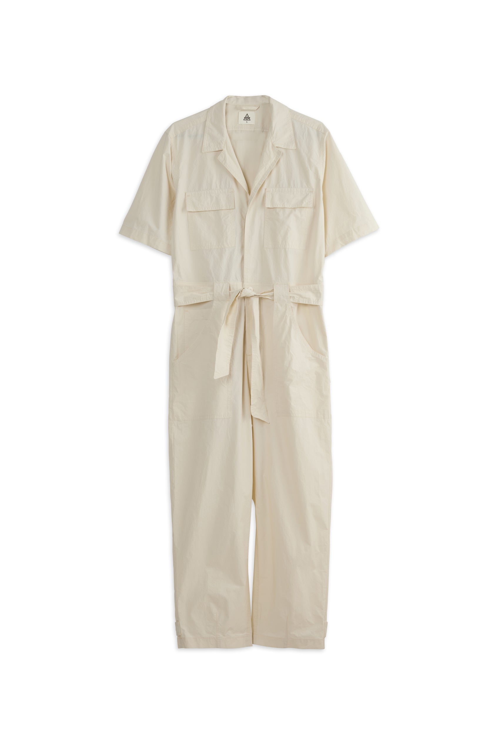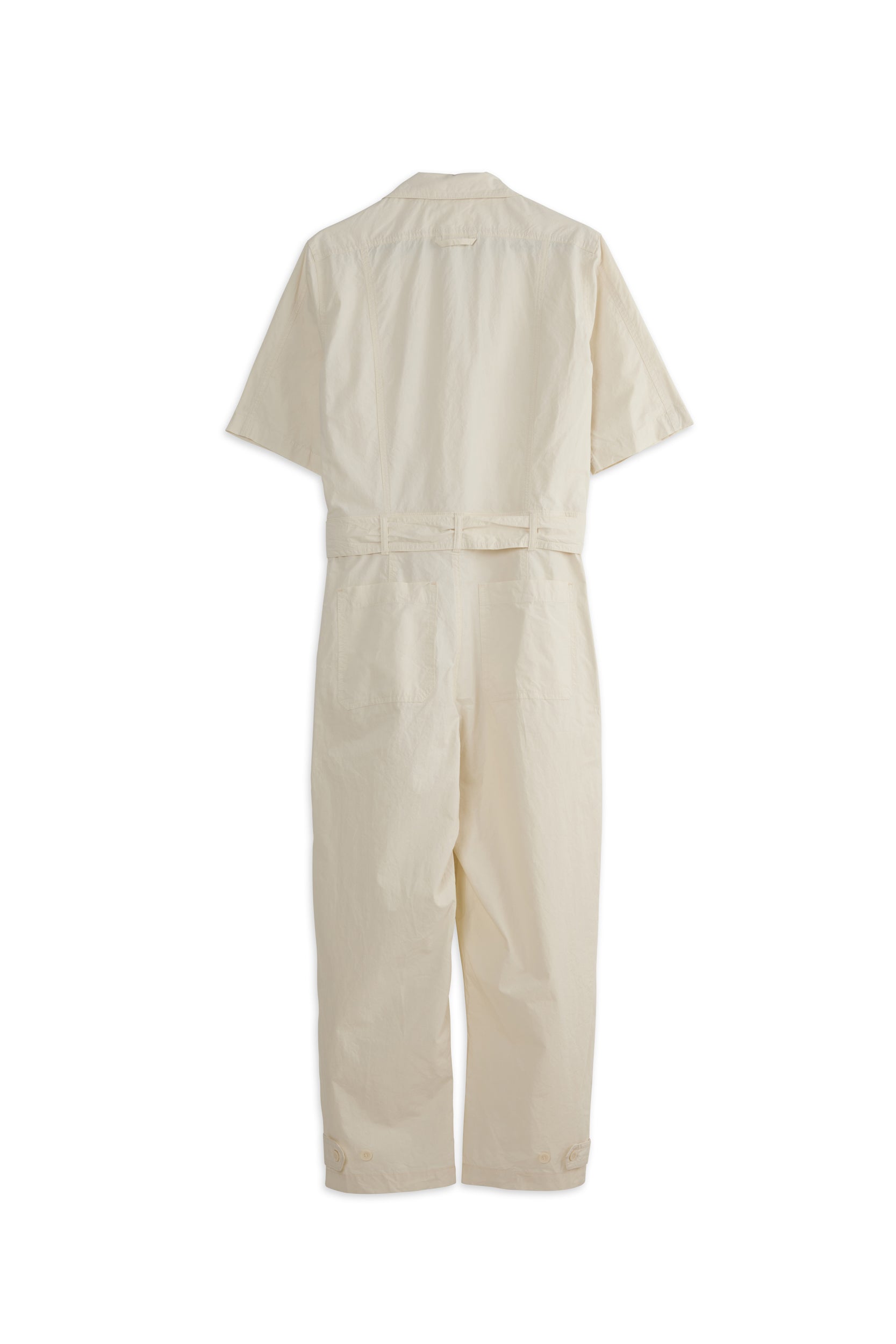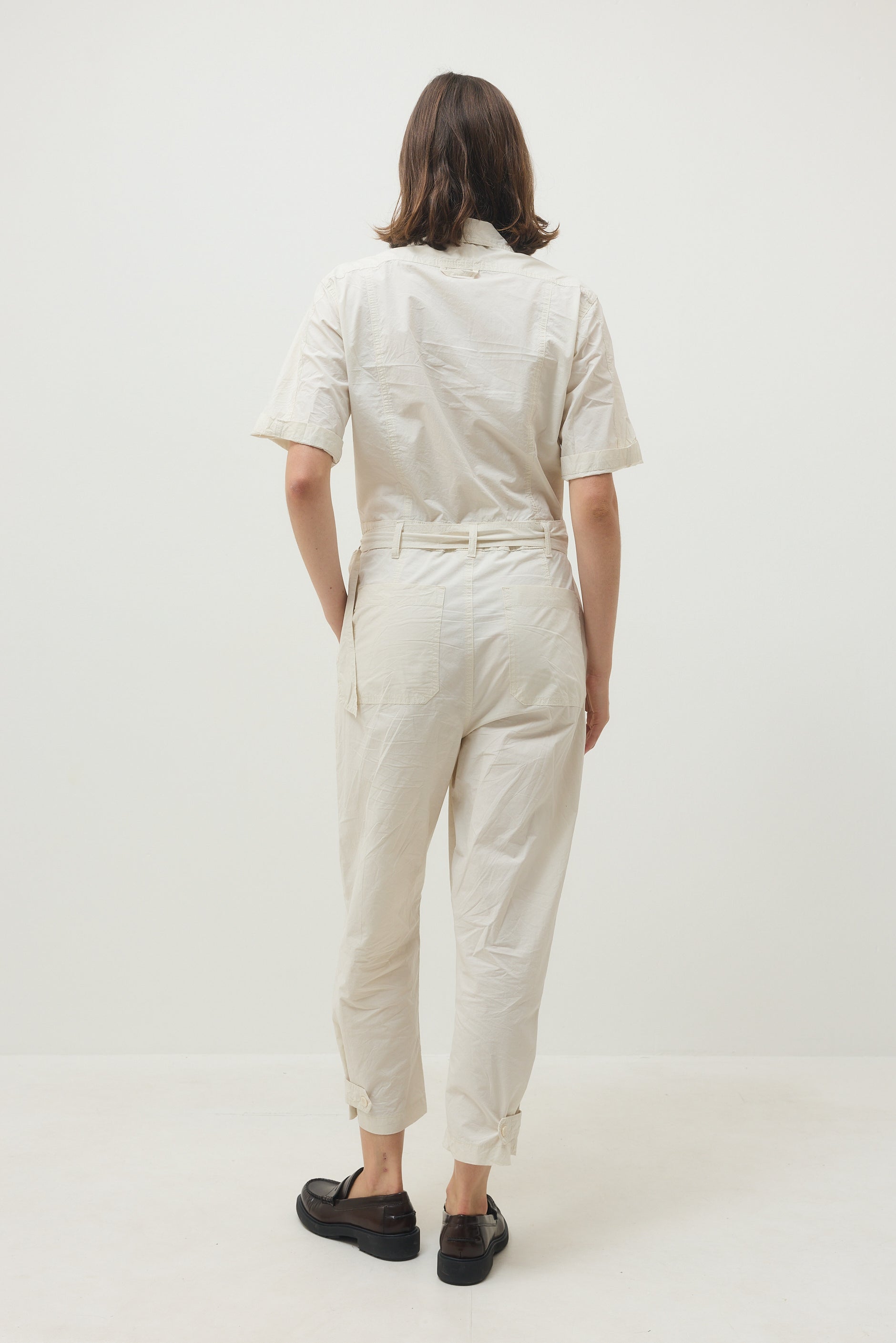 אוברול עם שרוולים קצרים בגזרה גבוהה עם חגורה. מכופתר מלפנים עם כפתור נסתר, שני כיסים בחלקו העליון ושני כיסים בתפרי הצד של המכנסיים